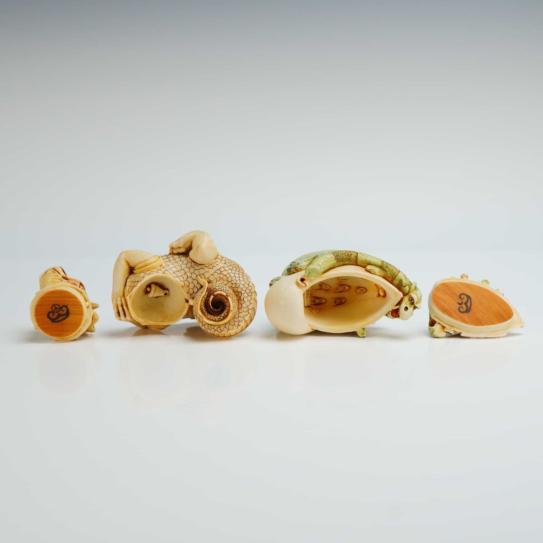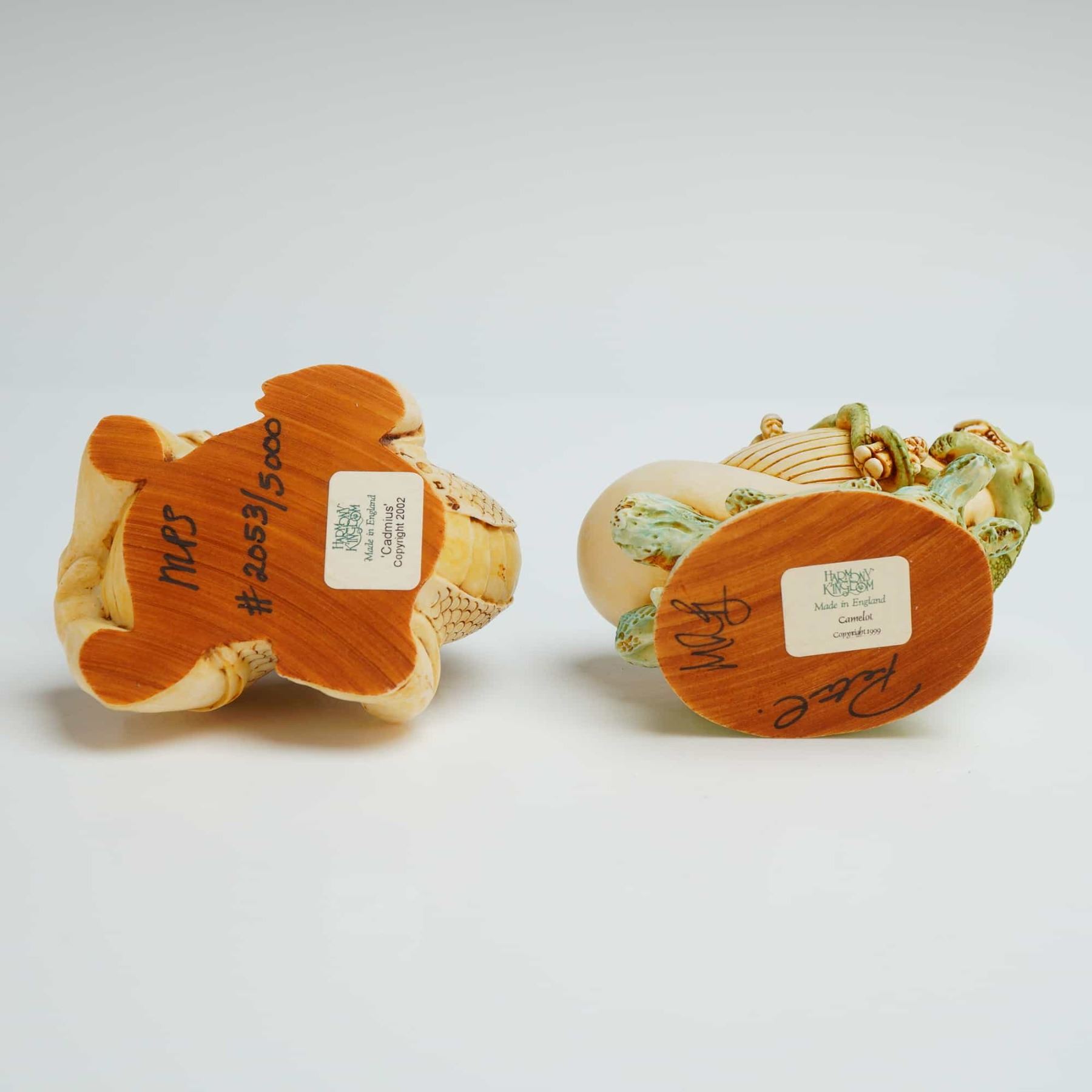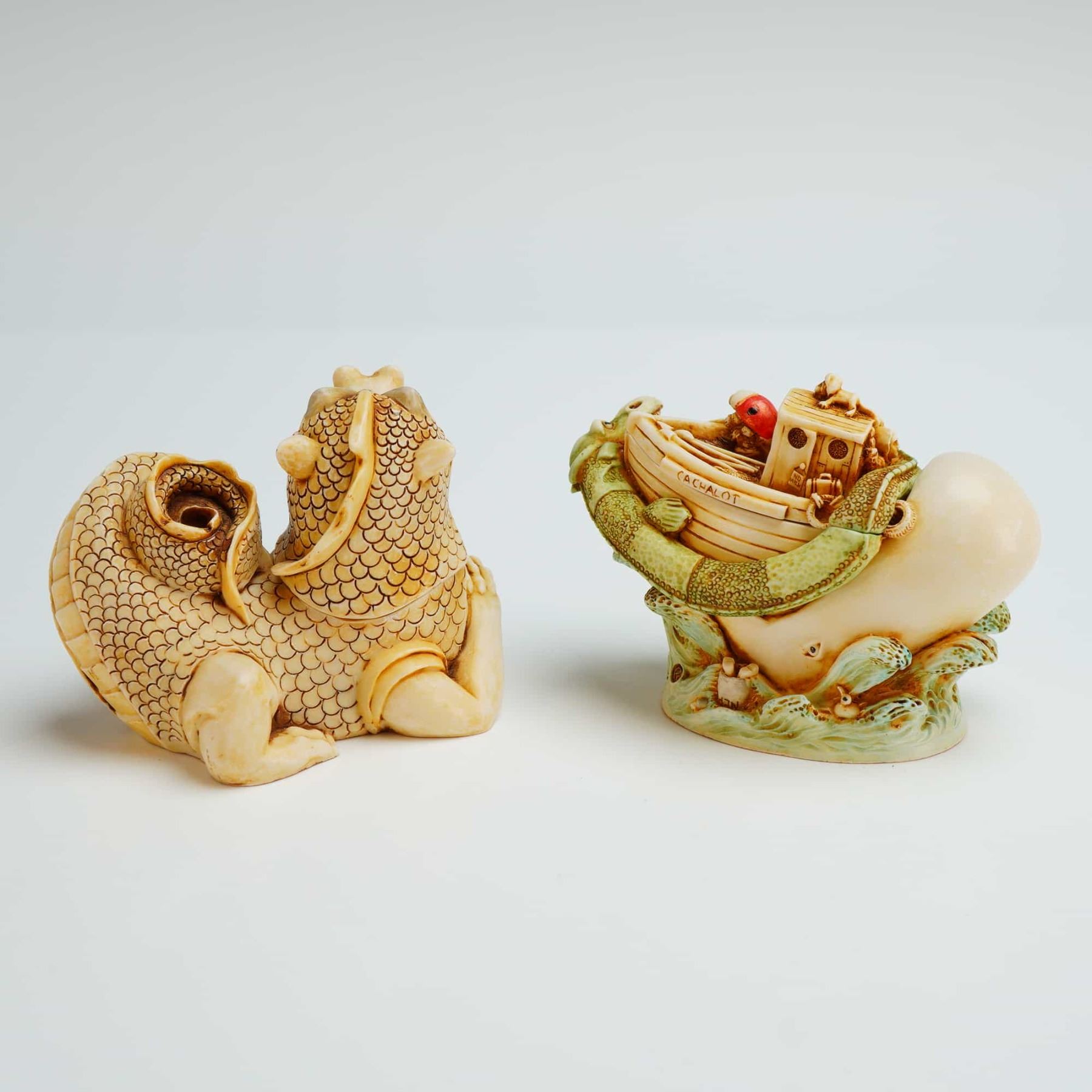 The first piece, titled Cadmius, depicts a reclining scaly dragon creature with a removable head lid. The base is hand-numbered and includes the artist initials. The second piece, titled Camelot, portrays a whale with a small vessel on its back, entwined by a green sea serpent. Both figurines feature detailed carvings with subtle color accents and removable lids revealing hollow interiors with hidden secondary carvings. Each item bears an original manufacturer sticker on the base alongside hand-written artist signatures and identification marks. The model numbers are TJMYLEYE & TJROSE99.
