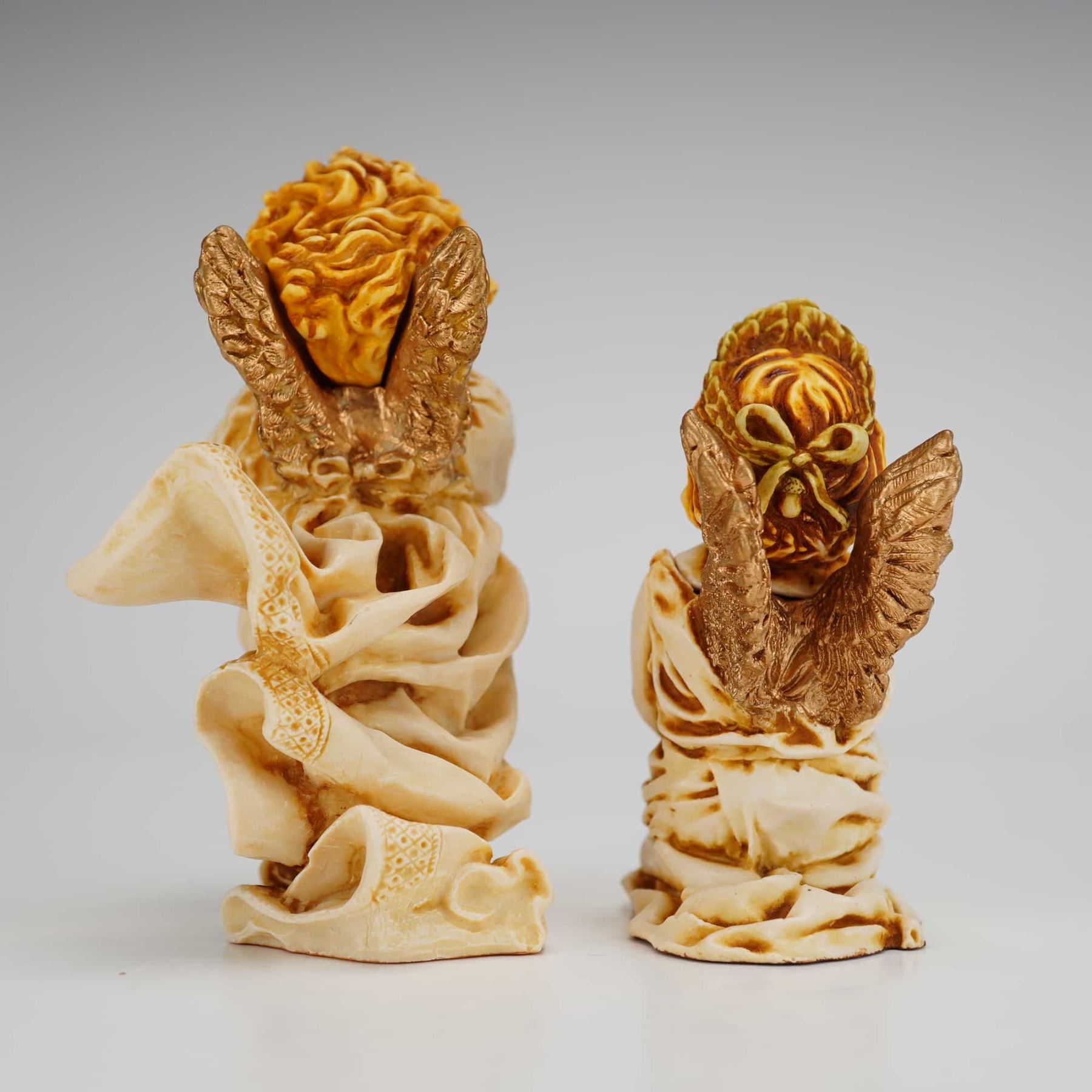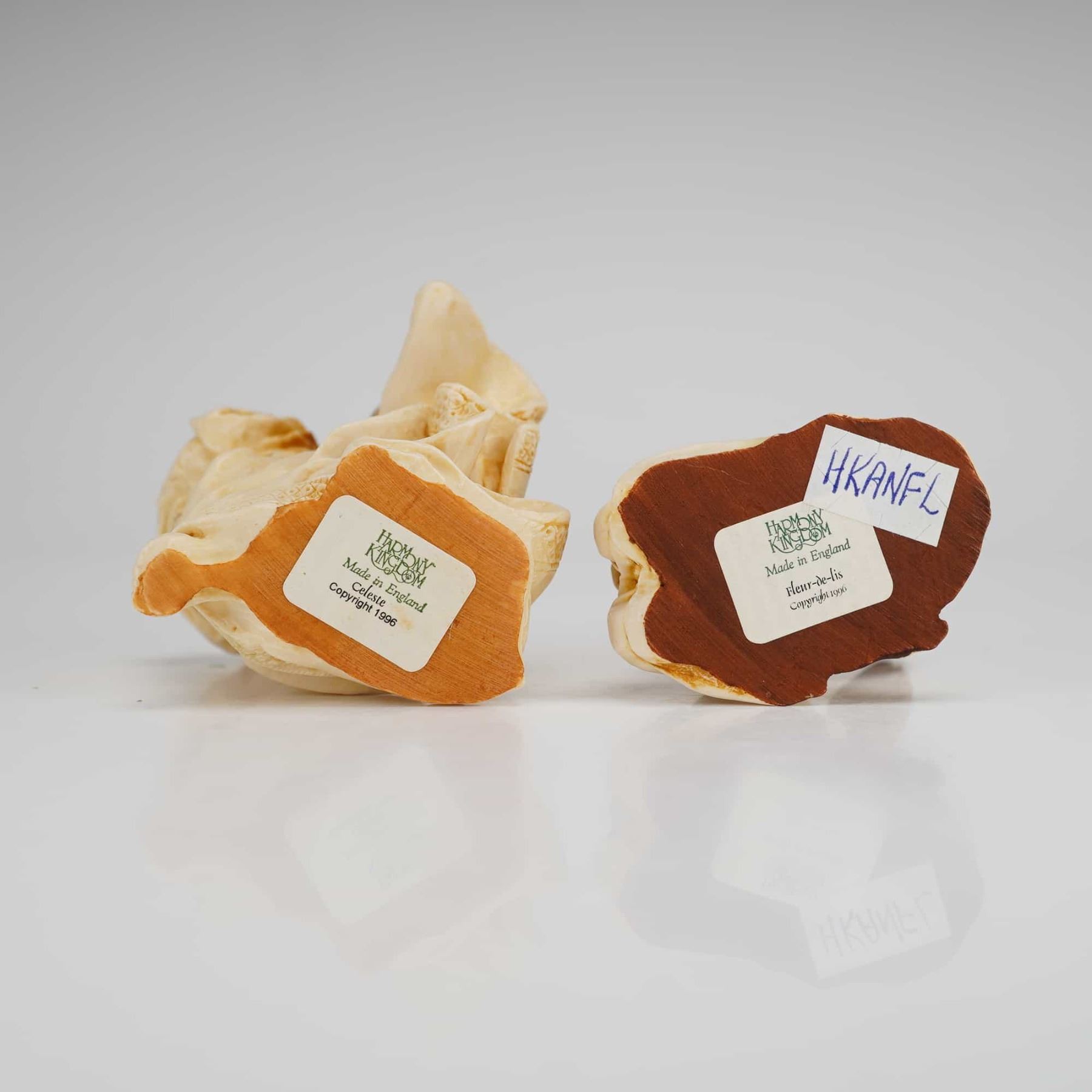 Both pieces are designed with removable heads that reveal small interior compartments. The Celeste figurine depicts a standing angel in cream-colored robes holding a gold-tone star, while the Fleur-de-lis figurine features a kneeling angel holding a bunch of pink flowers. Each figure is detailed with gold-finished wings and wavy hair. The undersides of both items bear original Harmony Kingdom labels stating they were made in England and carry a copyright date. A small black hallmark is visible on the interior of each removable head section. For cataloging purposes, the weight is recorded as a combined weight, and measurements are taken from the largest item. The model numbers are ANCE97 & ANFL.