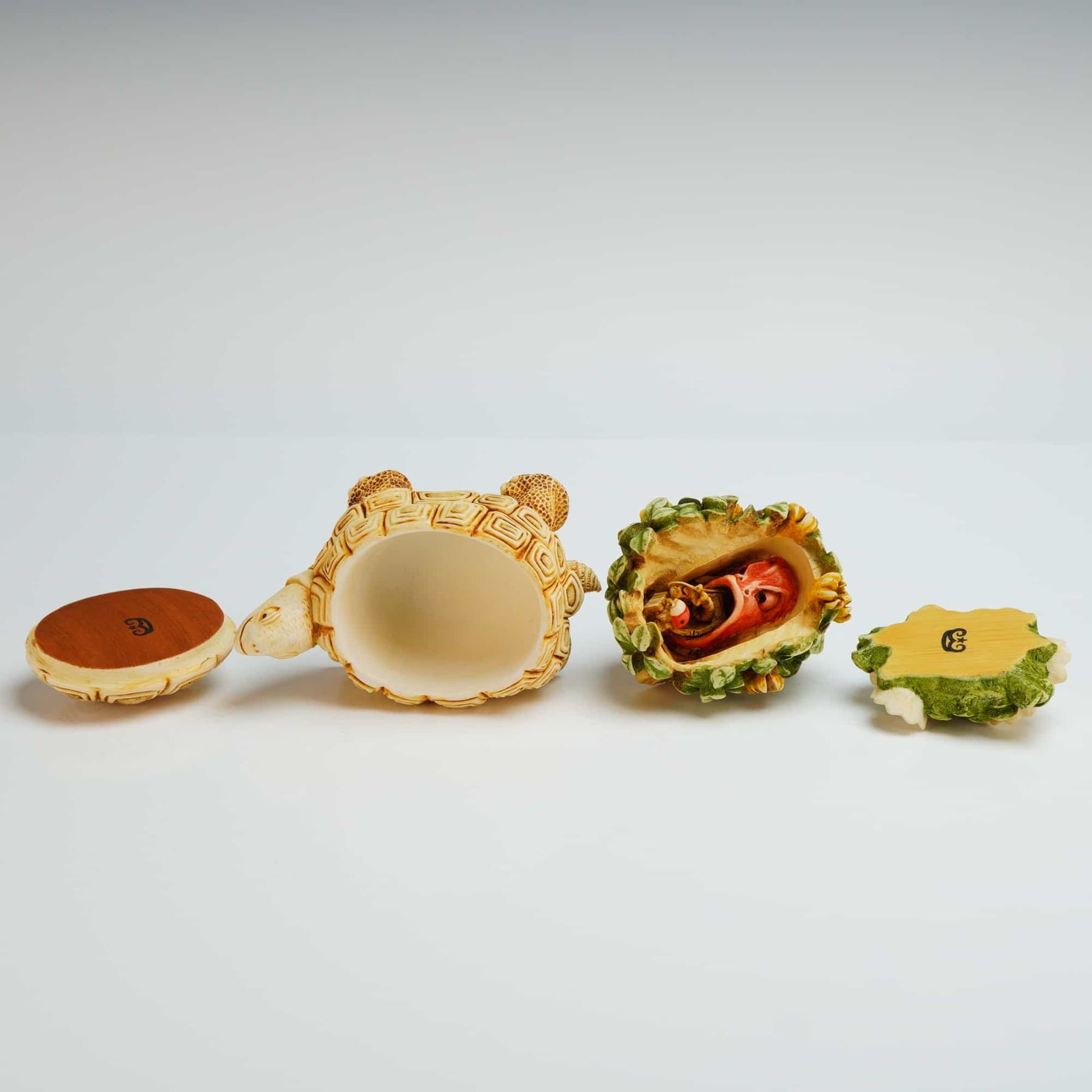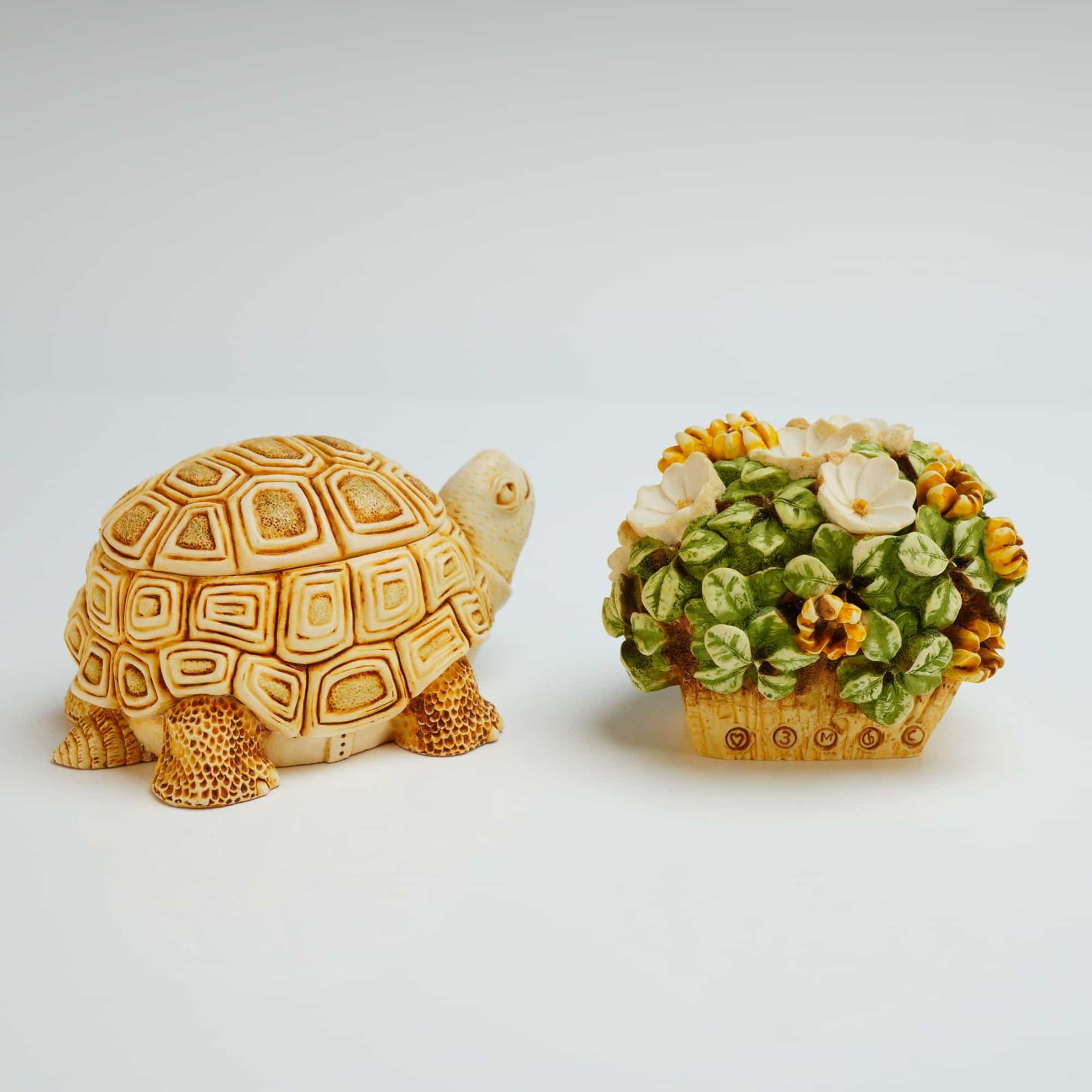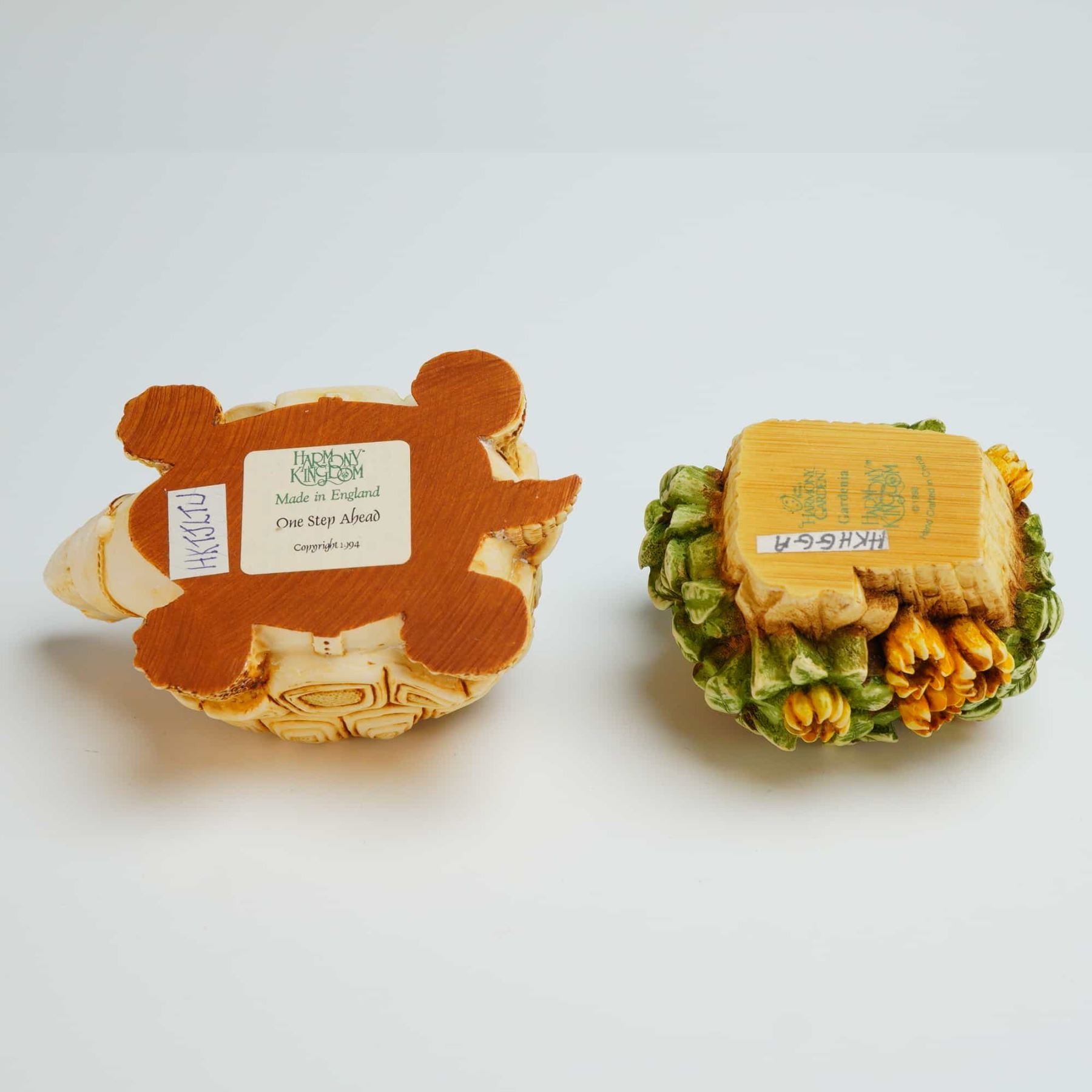The first item is a tortoise figurine titled One Step Ahead, featuring a cream-colored, detailed shell that lifts to reveal a small interior compartment. The underside of the tortoise is labeled Made in England with a copyright. The second item is a Harmony Garden floral box titled Gardenia, depicting a dense arrangement of white and yellow blossoms with green variegated foliage set in a basket-style base. The base of the floral box is marked with a copyright. The interior of the Gardenia box contains a small carved creature. Both pieces exhibit a characteristic matte, textured finish and include their respective lids. The model numbers are HGGA & TJLTU.