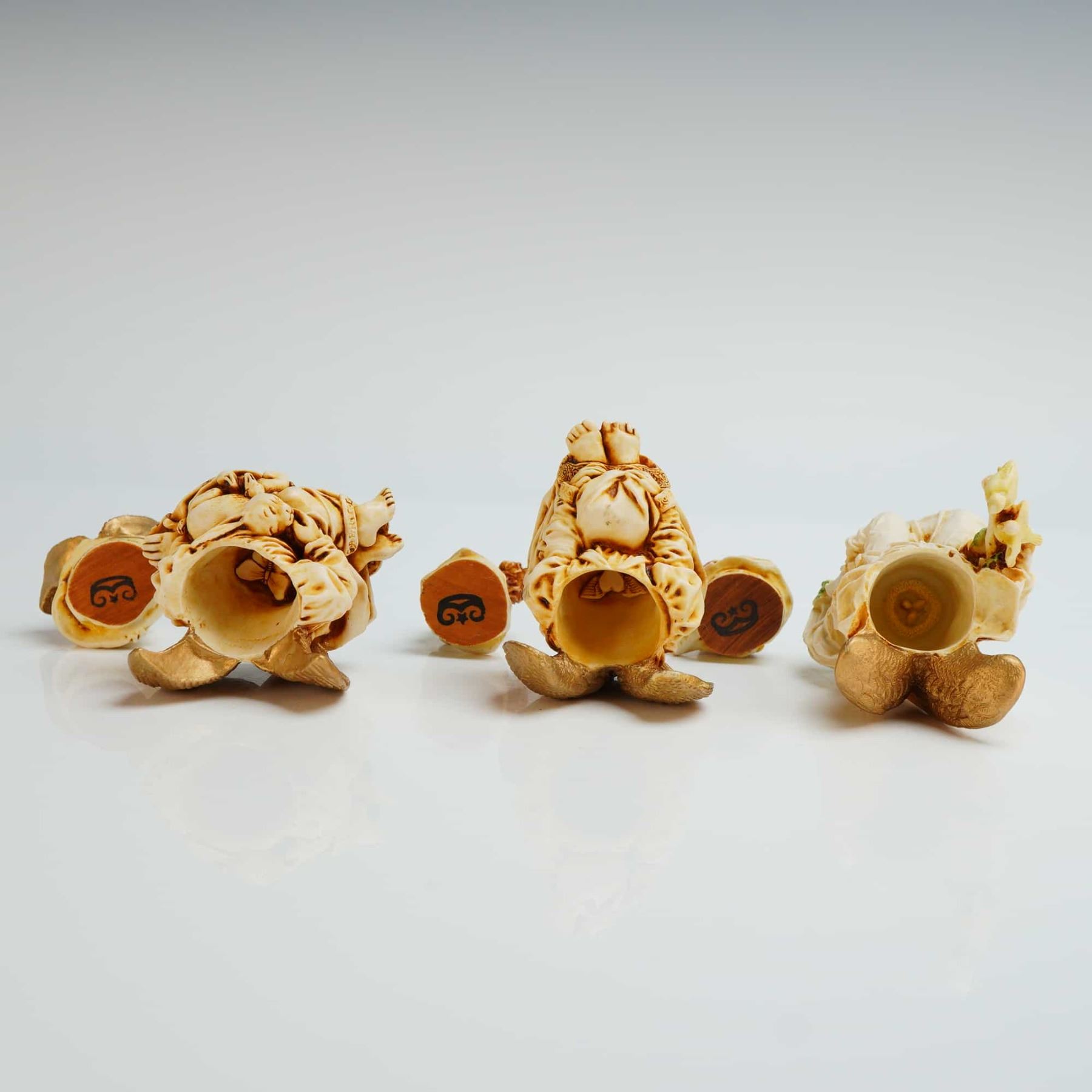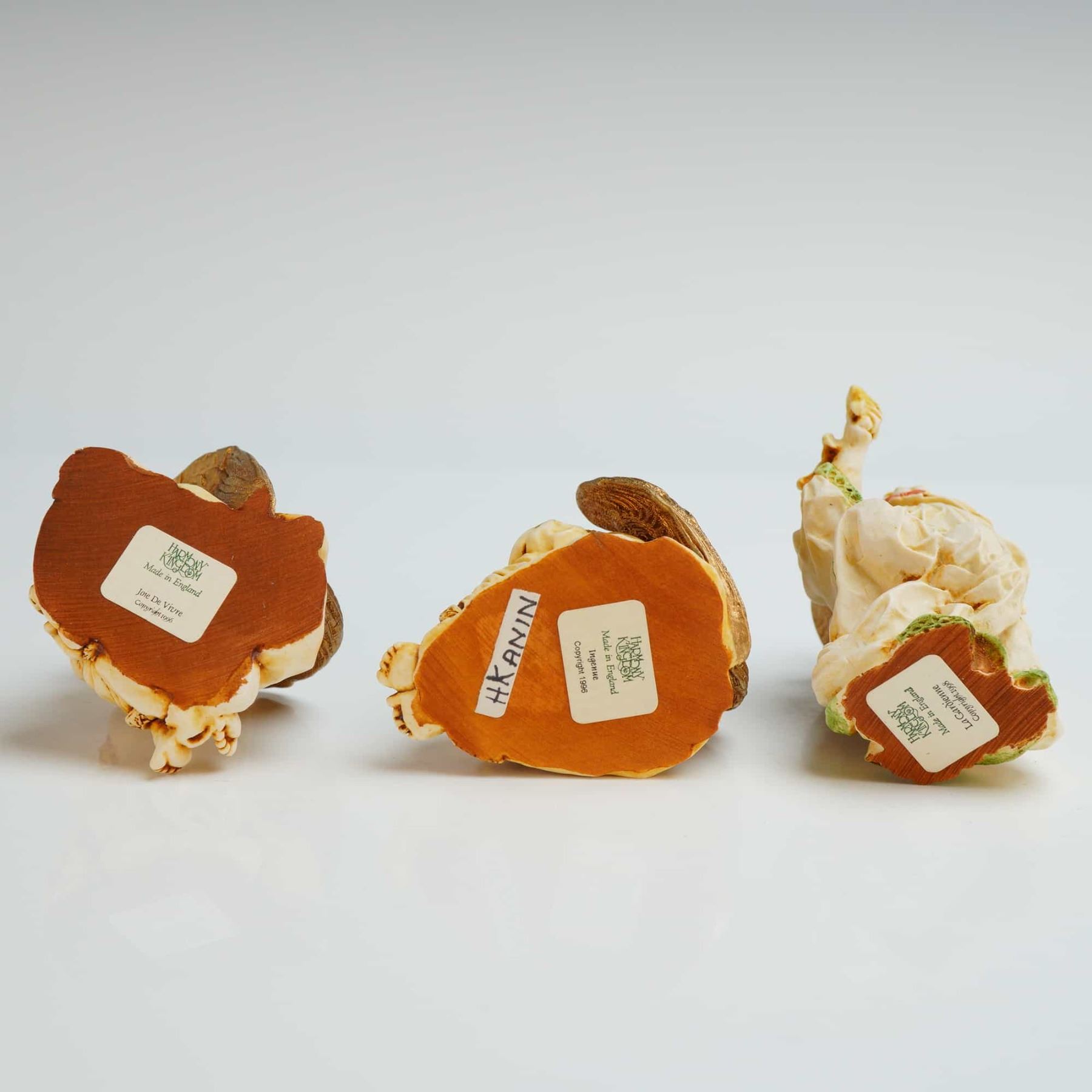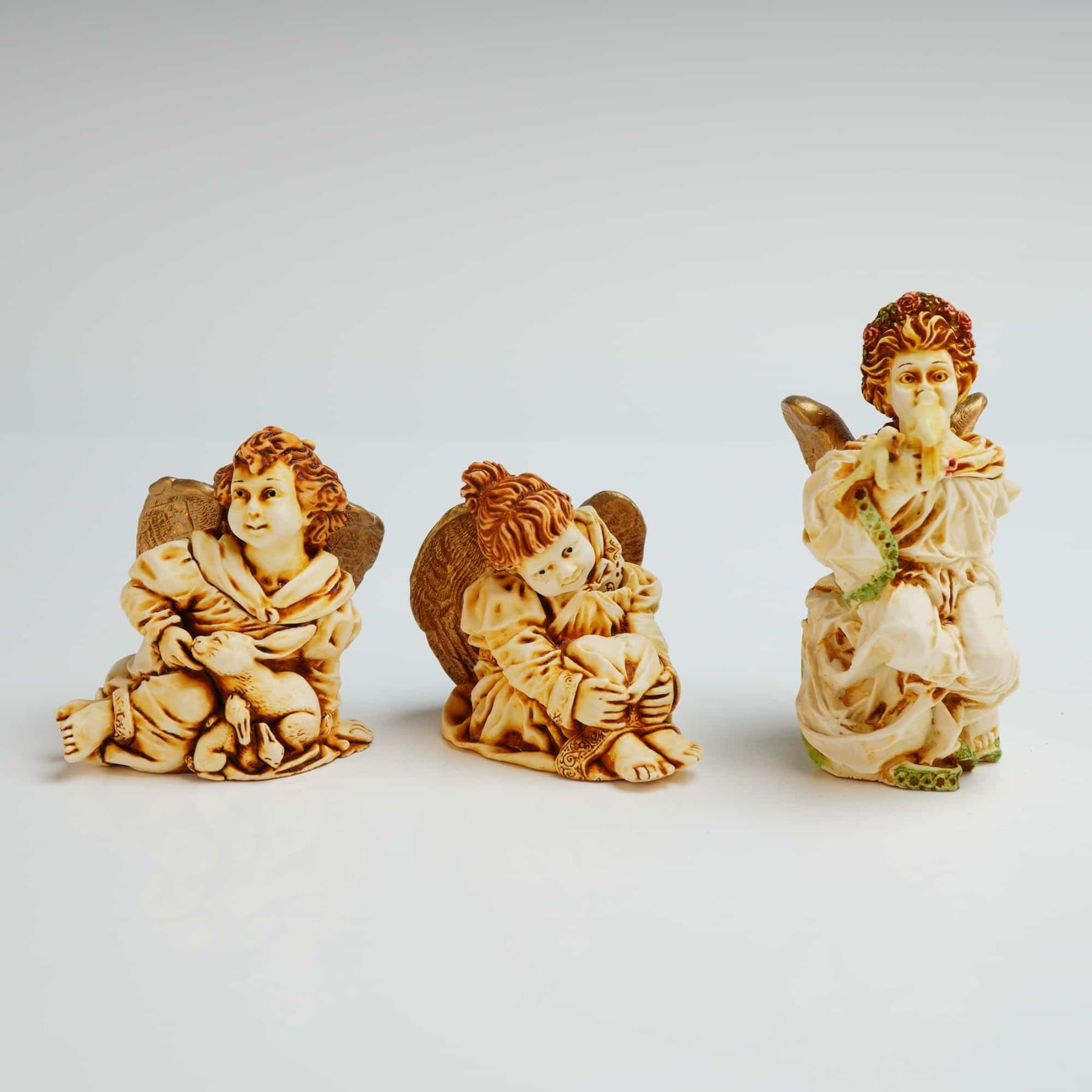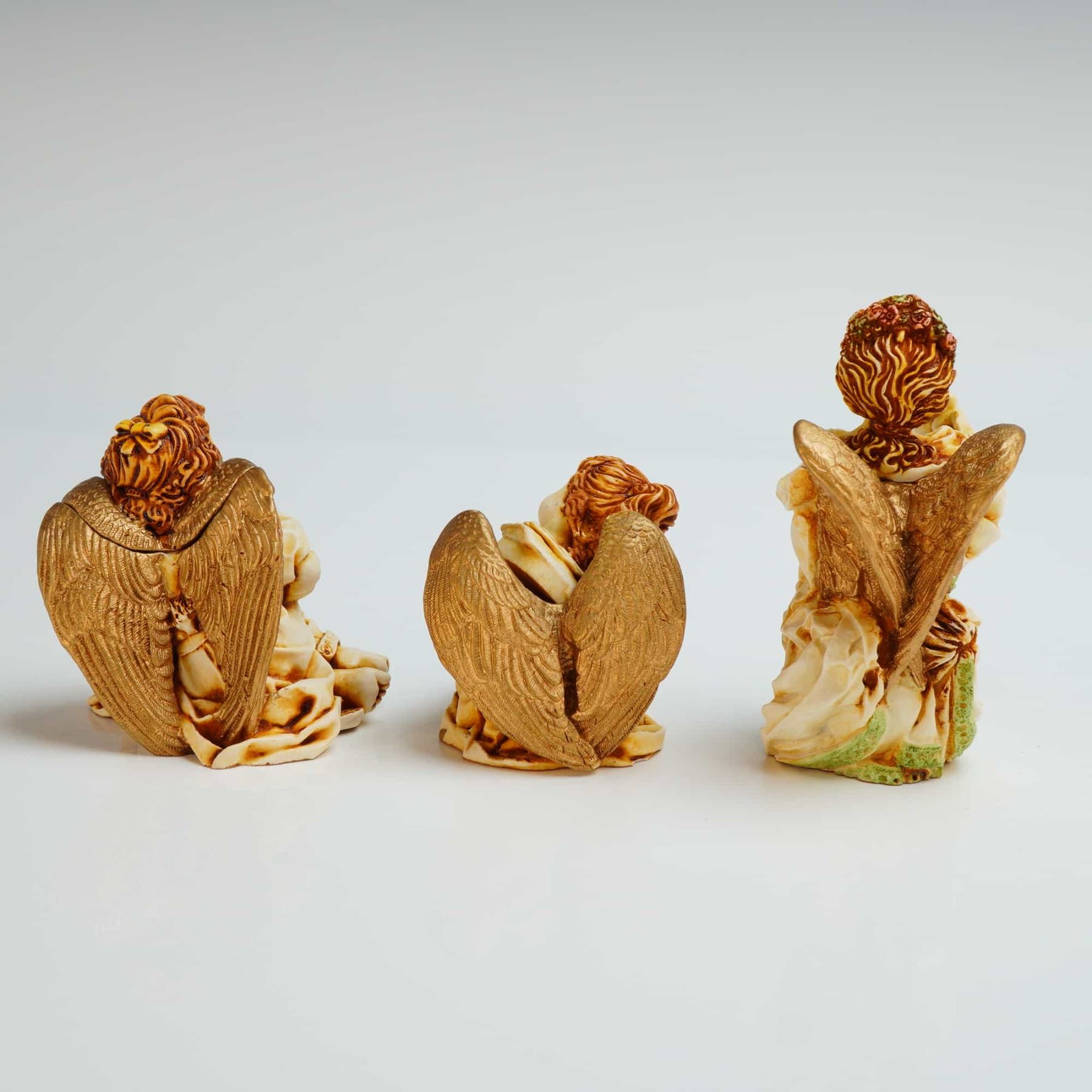 This lot features three Harmony Kingdom Angelique series trinket boxes, including the models La Gardienne, Joie de Vivre, and Ingenue. The Joie de Vivre box depicts a seated angel cradling a small animal. The Ingenue box, shows a seated angel in a contemplative pose. The La Gardienne box, features a standing angel adorned with a floral crown and a sash. Each figurine functions as a small box with a removable lid that reveals a hollow interior compartment. The underside of each base retains the original manufacturer label. The interior of each lid is marked with the brand signature crown hallmark. The model numbers are ANSE98, ANJO, ANIN.