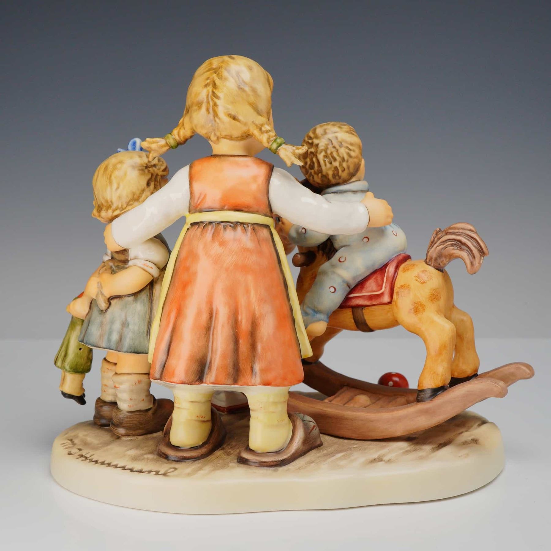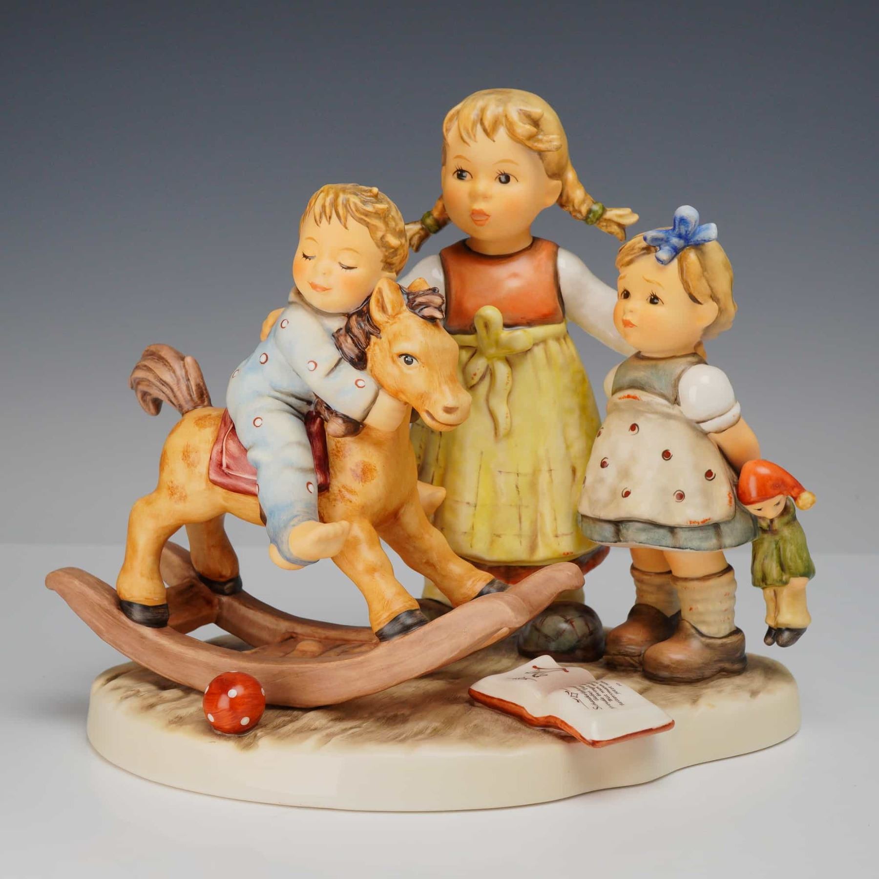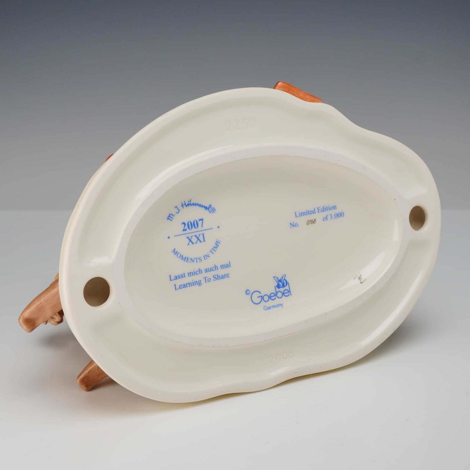 This large-scale Goebel M.I. Hummel (hum) figurine, titled Learning to Share and known in German as Lasst mich auch mal, is a significant release from the Moments in Time collection. The multi-figure polychrome group depicts a charming nursery scene with a boy on a rocking horse, an older girl in a yellow dress, and a younger girl holding a doll. The base features an open storybook and a red and white polka-dot ball. The underside is marked with the blue Goebel TMK-8 Bumblebee factory mark, the m. J. Hummel signature, the year 2007, and the Roman numeral XXI. This hand-painted ceramic piece is a limited edition, numbered 0768 of 3,000, produced shortly before the Goebel factory ceased Hummel production. Height: 7.5 inches.