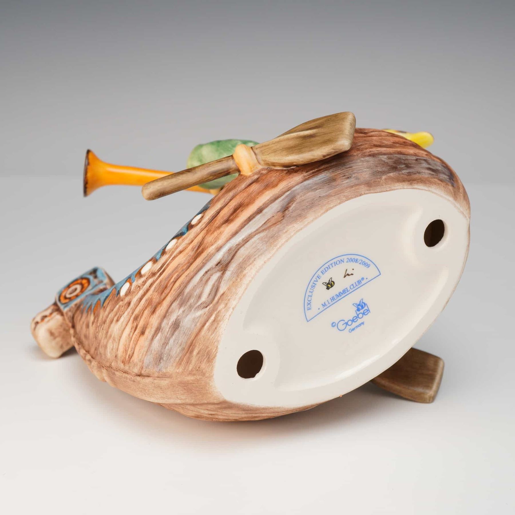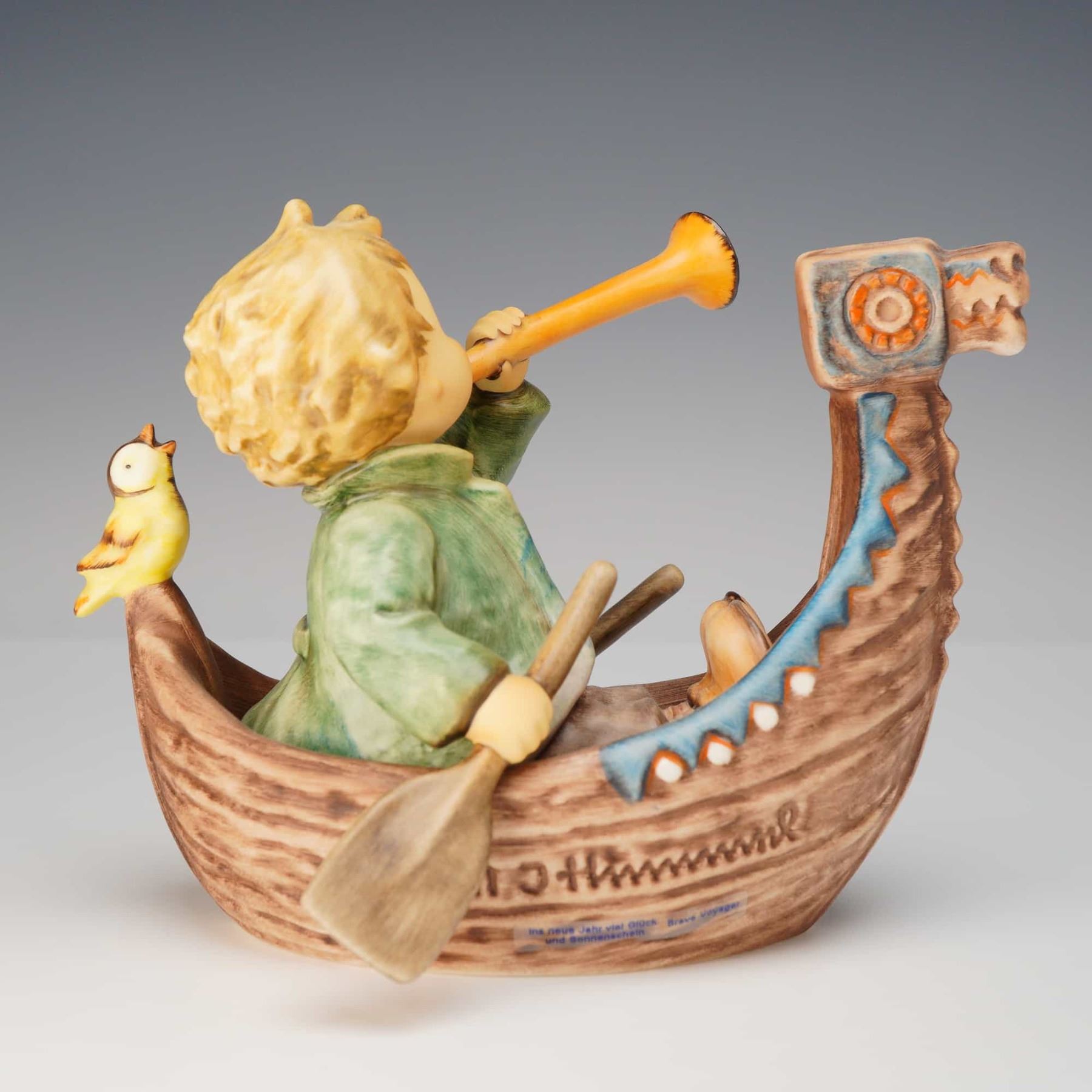 This hand-painted ceramic figurine, titled Brave Voyager, was produced by Goebel as an exclusive edition for the M. I. Hummel Club. The piece depicts a young boy with blonde hair wearing a green coat and an orange satchel, seated in a boat with a dragon-head prow. He is shown blowing a long yellow horn while holding two oars. A small yellow bird is perched on the stern. The boat features decorative blue and white patterns along the gunwale. The side of the boat bears an incised M. I. Hummel signature along with two blue printed labels reading Brave voyager and ins neue Jahr viel Glück und Sonnenschein. The underside of the base features a blue printed circular mark for the M. I. Hummel Club Exclusive Edition 2008/2009, a Goebel Germany trademark with a stylized V and bumblebee, and a small blue handwritten mark reading hi. The figurine is constructed from a combination of glazed and bisque ceramic.