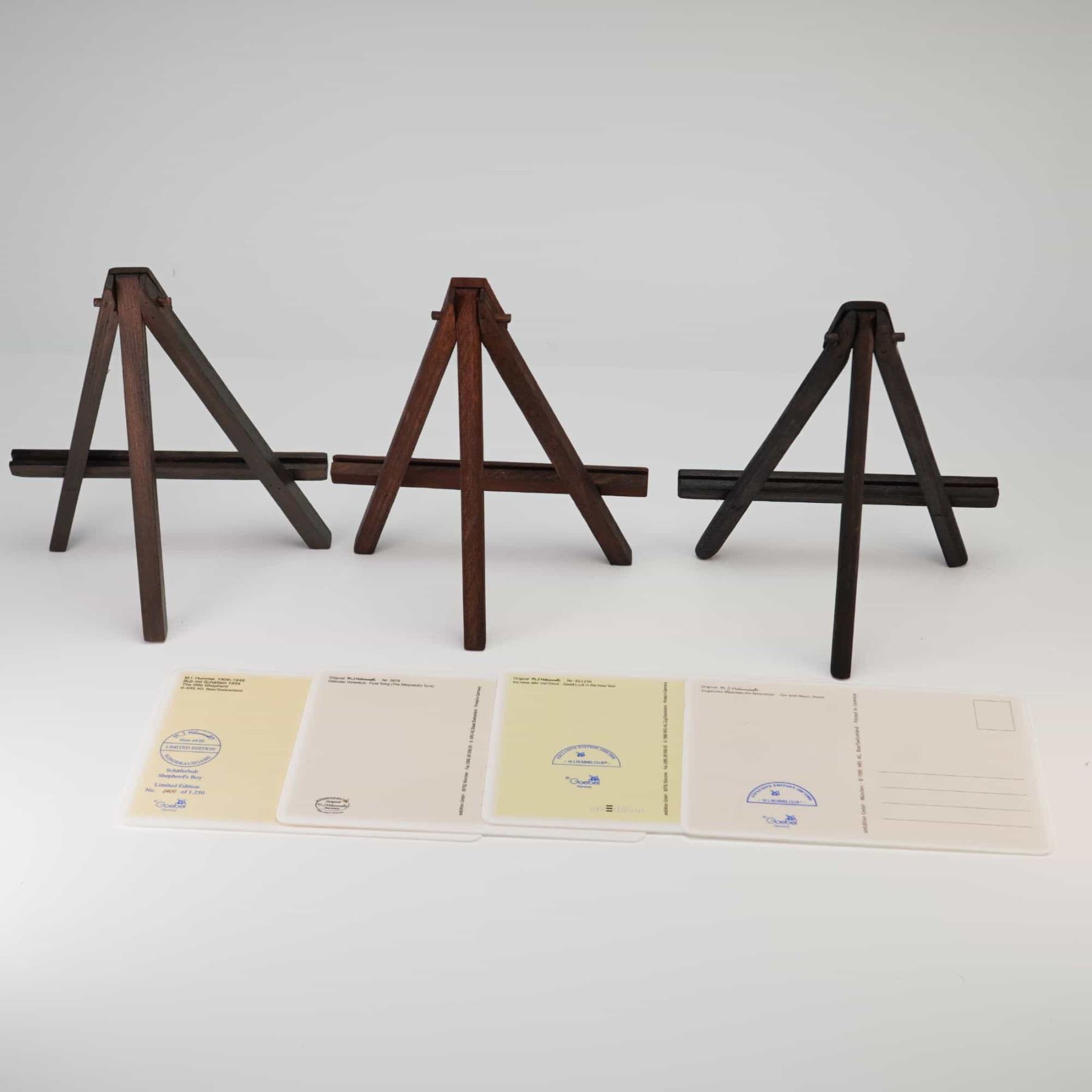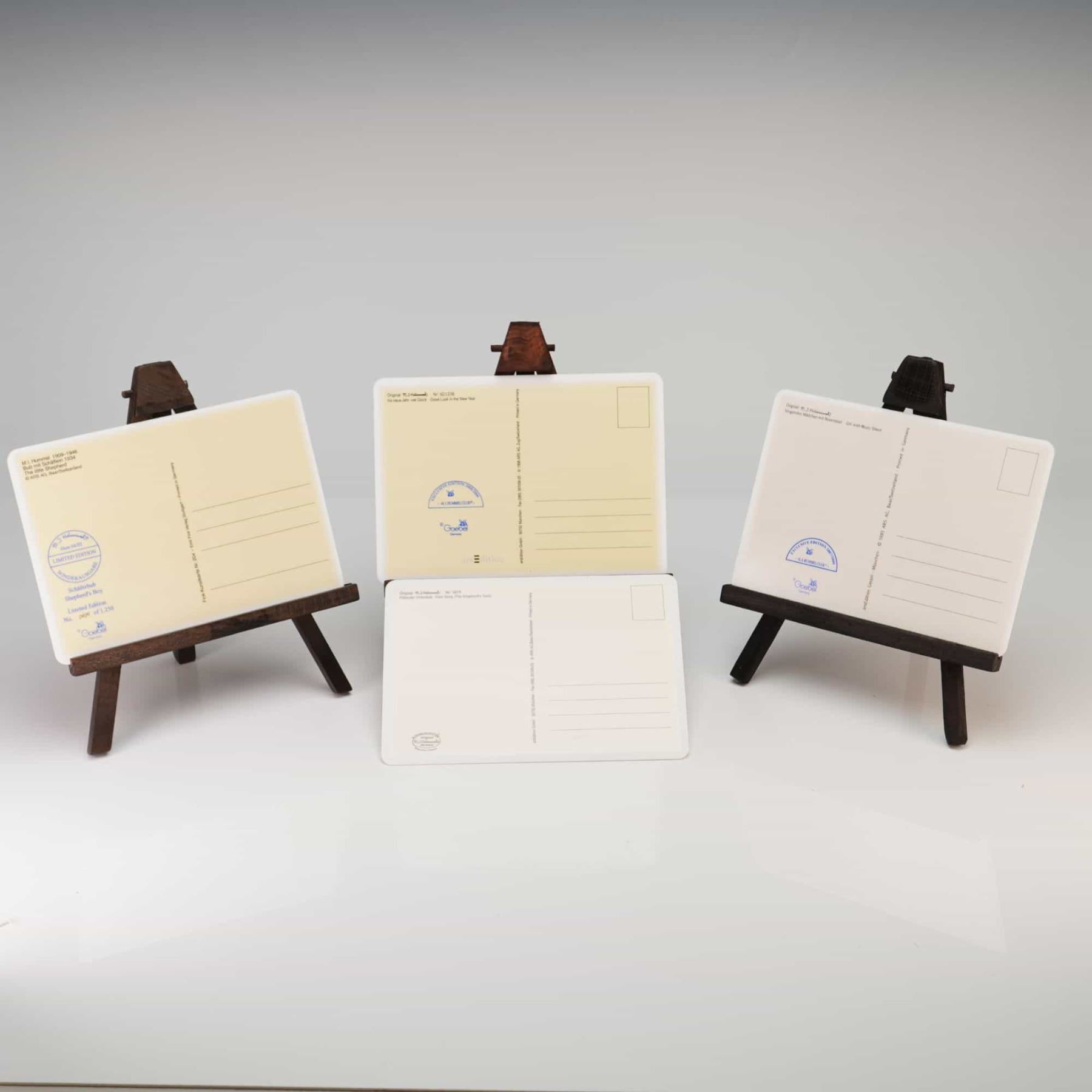 A set of four porcelain plaques produced by Goebel, Germany, featuring transfer-printed illustrations after the original designs of Sister Maria Innocentia Hummel. Each plaque is designed in the form of a postcard with a simulated correspondence layout on the reverse, including address lines and a designated stamp area. The collection consists of the following subjects: The Little Shepherd (Schäferbub), a limited edition numbered 0401 of 1,250; Good Luck in the New Year (Viel neue Jahr viel Glück und Sonnenschein), an exclusive edition for the M.I. Hummel Club 1998/1999; Flute Song (Flötender Hirtenbub); and Girl with Music Sheet (Singendes Mädchen mit Notenblatt), an exclusive edition for the M.I. Hummel Club 1994/1995. The reverse of each piece is marked with the Goebel Germany blue backstamp featuring the stylized bumblebee and V mark, alongside specific pattern numbers and edition details. The set is accompanied by three dark-stained wooden display easels.
