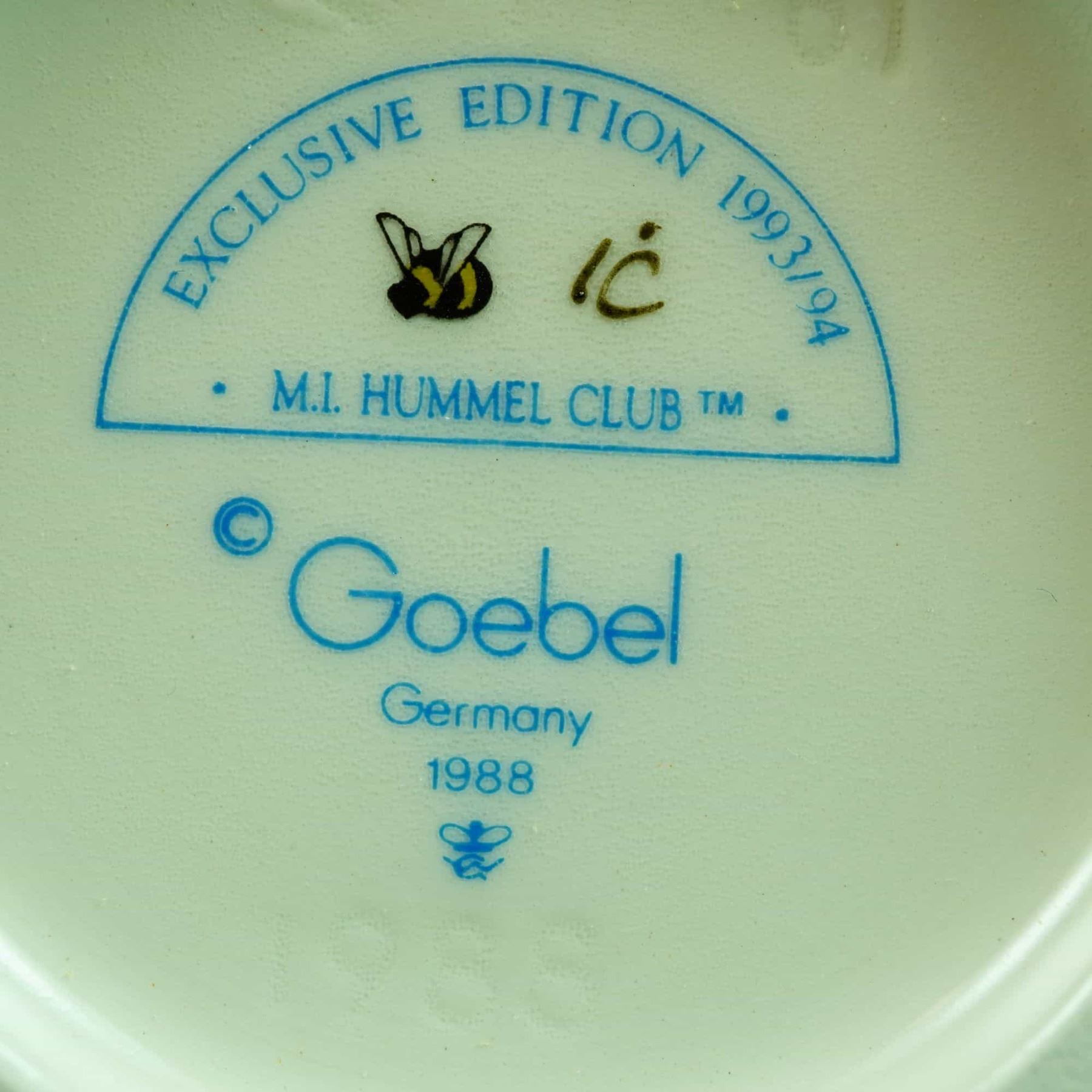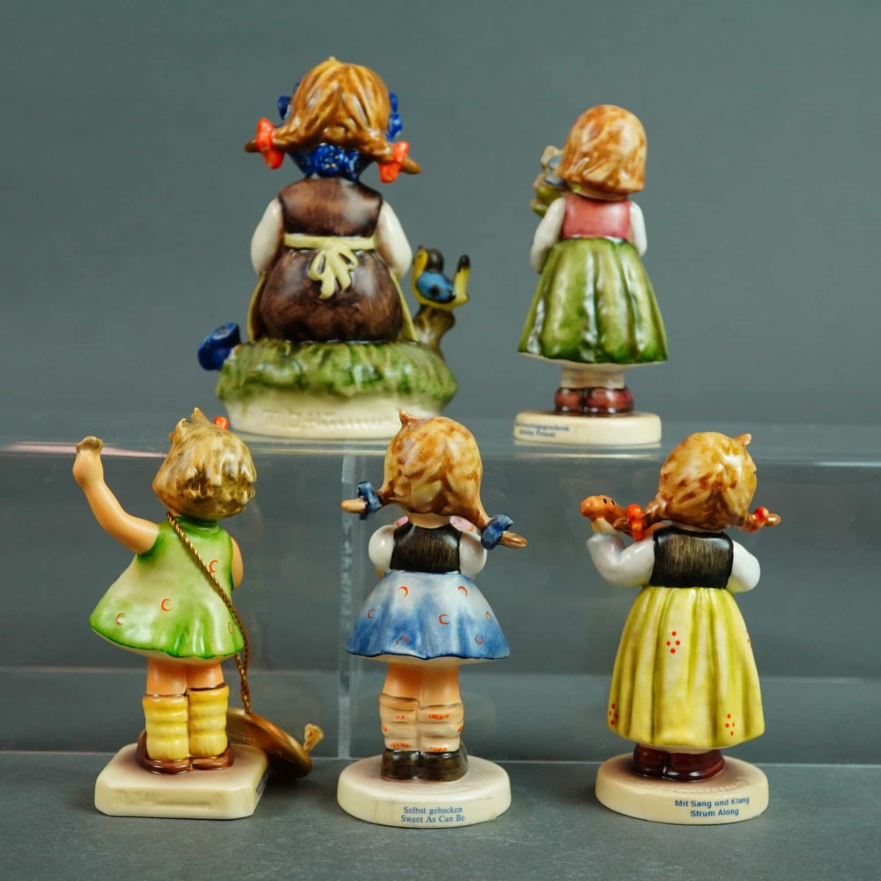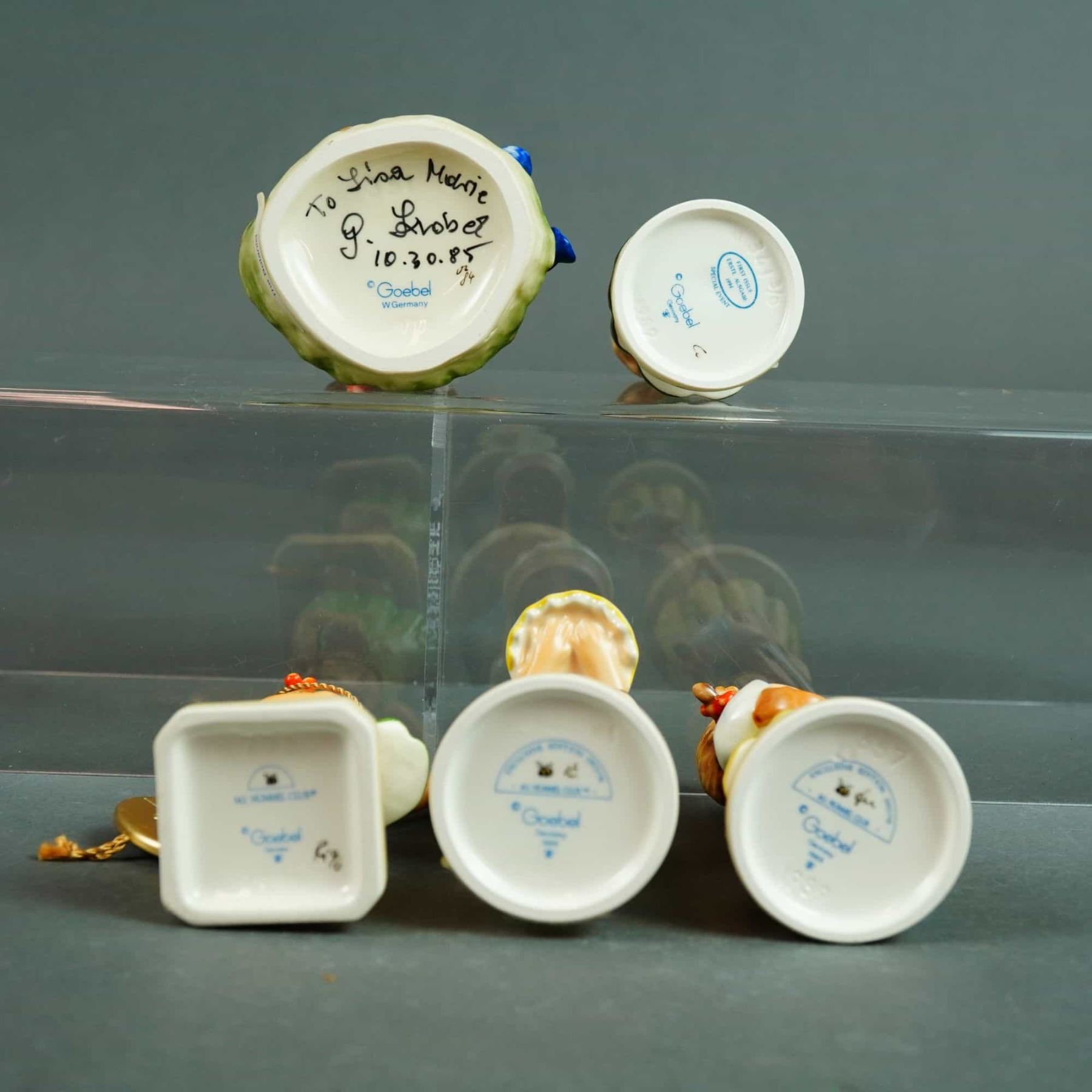 This collection consists of five hand-painted ceramic figurines manufactured by Goebel in Germany, featuring the characteristic style of M.I. Hummel. The group includes various depictions of young girls in matte polychrome finishes. The first figurine depicts a seated girl wearing a crown of blue flowers with a bird perched on a nearby stump; the base features a handwritten dedication in black ink reading To Lisa Marie, signed G. Goebel and dated 10.30.85, alongside a blue printed Goebel W. Germany mark. The second figurine shows a standing girl holding a terracotta-colored pot with blue flowers, marked as an M.I. Hummel Club Exclusive Edition 1993/94 with a 1988 copyright. The third figurine depicts a girl holding a chain of red and yellow flowers, marked as an M.I. Hummel Club Exclusive Edition 1996/97 with a 1995 copyright; this piece includes an attached gold-toned metal tag identifying it as a First Issue (Erste Ausgabe). The fourth figurine, titled Sweet As Can Be (Selbst gebacken), depicts a girl holding a birthday cake and is marked as an M.I. Hummel Club Exclusive Edition 1997/98 with a 1996 copyright. The fifth figurine, titled Strum Along (Mit Sang und Klang), depicts a girl playing a lute and is marked as an M.I. Hummel Club Exclusive Edition 1998/99 with a 1997 copyright. All items bear the Goebel factory marks, including the stylized bee symbols and M.I. Hummel Club designations.