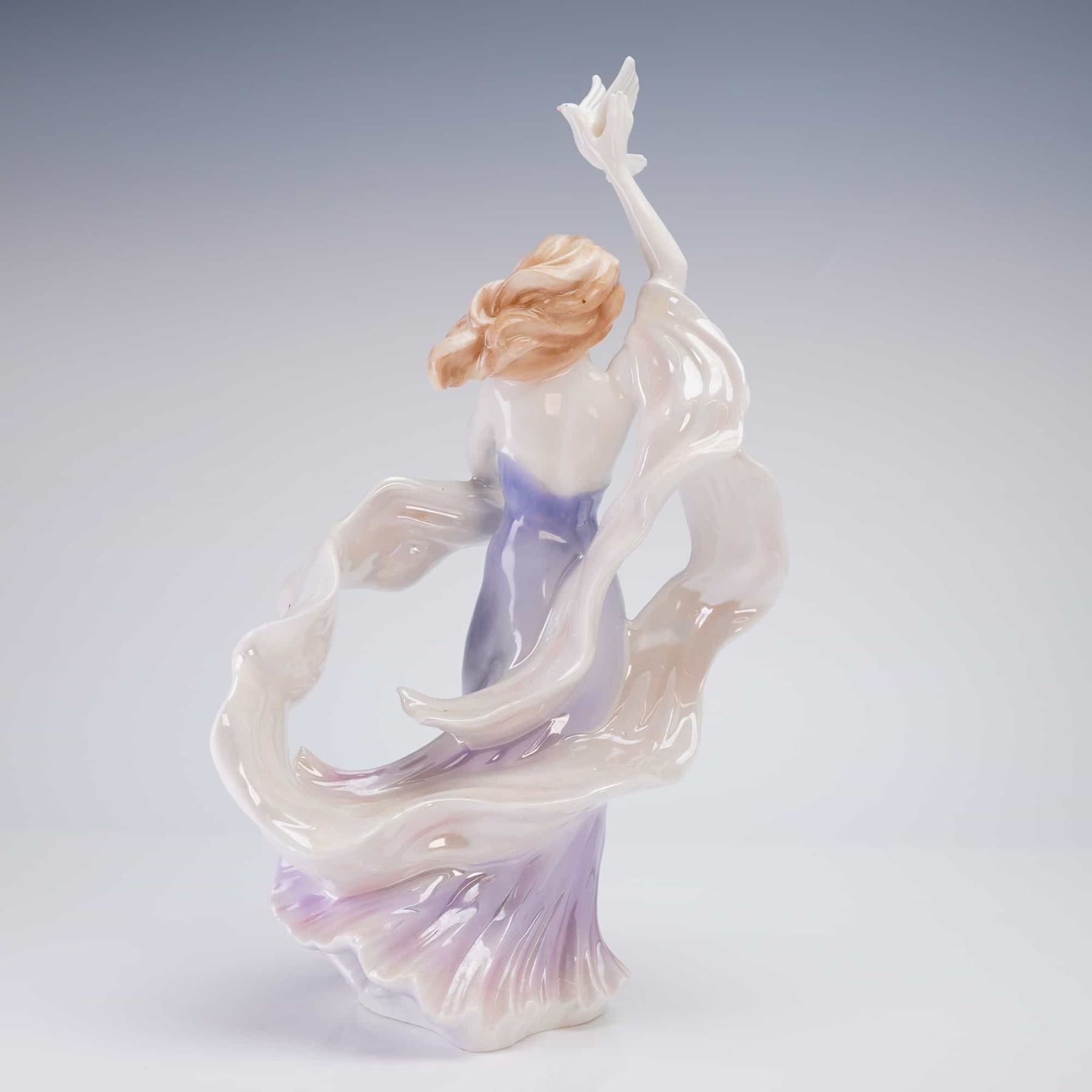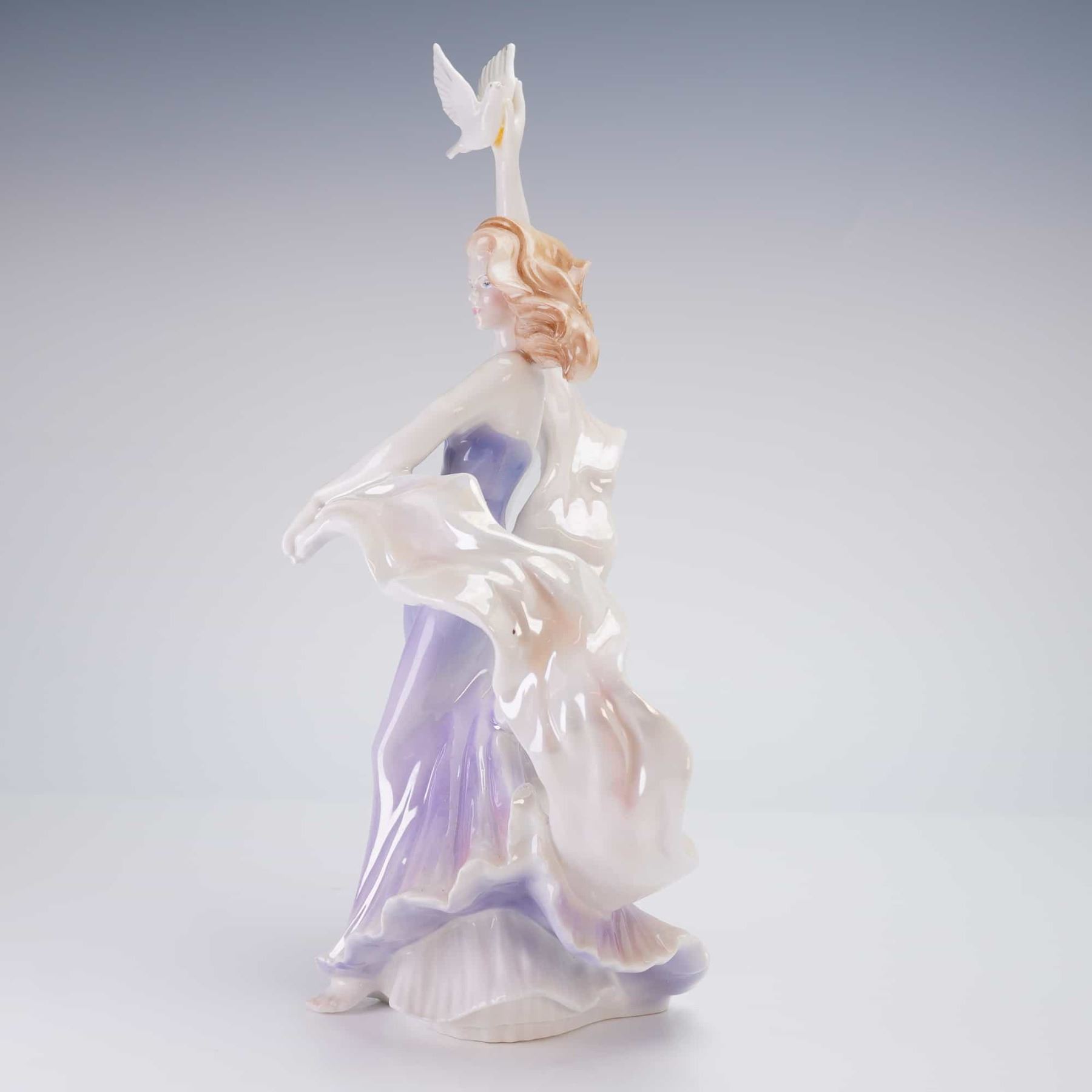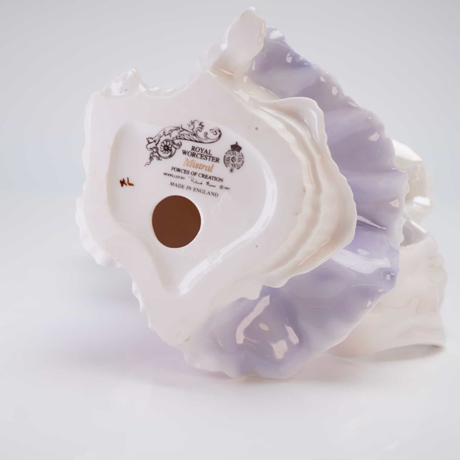 The figurine depicts a standing female figure with reddish-blonde hair, dressed in a flowing lavender and purple gown. She is dramatically posed with voluminous, iridescent white fabric swirling around her, holding a white dove aloft in her raised right hand. The piece utilizes a high-gloss finish, with a mother-of-pearl luster glaze applied to the fabric elements. The base is marked with the printed Royal Worcester standard mark, the title "Mistral," the series name "Forces of Creation," a copyright date (circa 1990s), and the inscription "MADE IN ENGLAND."