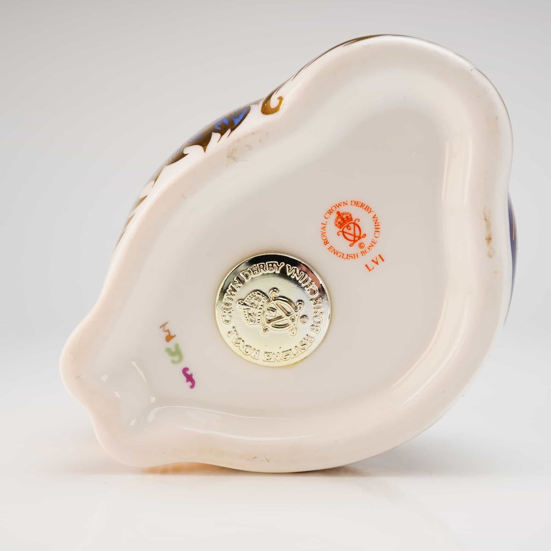 A Royal Crown Derby paperweight depicting a King Charles Spaniel, crafted from English bone china. The figure is decorated in an Imari-influenced pattern featuring cobalt blue and gold gilding over a white ground, with light blue accents. The underside bears the red Royal Crown Derby backstamp, the Roman numeral date code LVI for 1993, and hand-painted artist initials. The piece is fitted with a gold-colored metal stopper. This item is accompanied by its original branded presentation box.