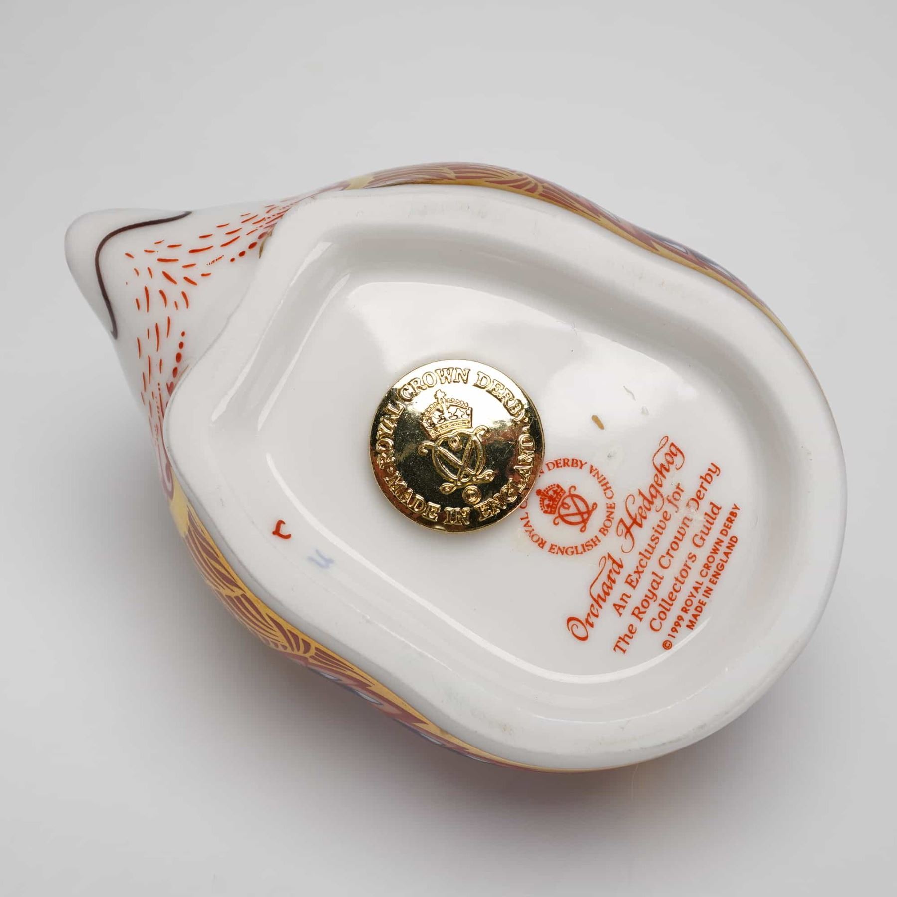 This Royal Crown Derby English bone china paperweight, titled Orchard Hedgehog, was produced as an exclusive for the Royal Crown Derby Collectors Guild in 1999. The figurine features Imari-style decoration in shades of iron red, cobalt blue, and 22-karat gold gilding. The pattern depicts apples and leaves over a feather-like background. The base is marked with the maker stamp, the title of the piece, the 1999 copyright date, and includes a gold-colored metal stopper. The item is accompanied by its original navy blue branded box.