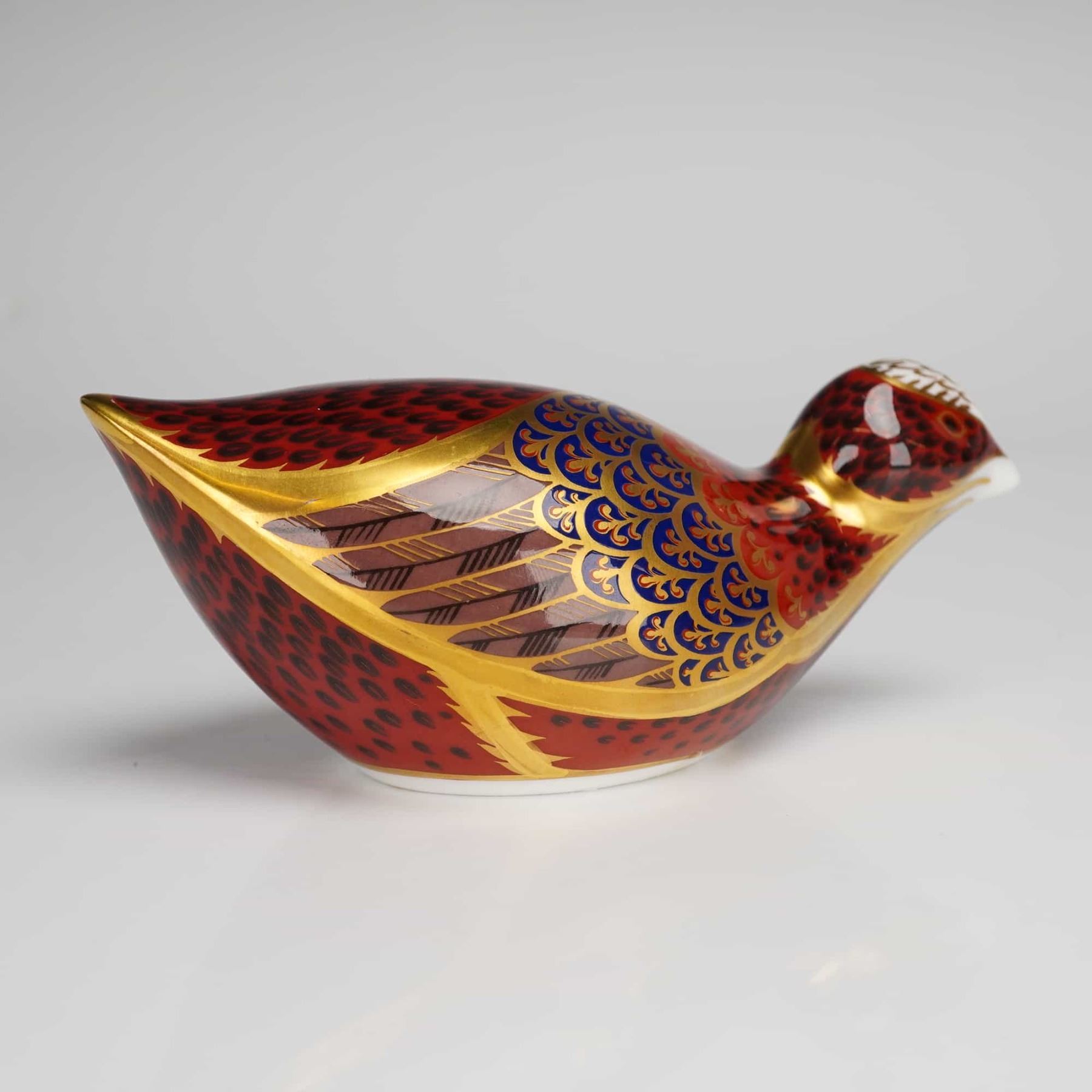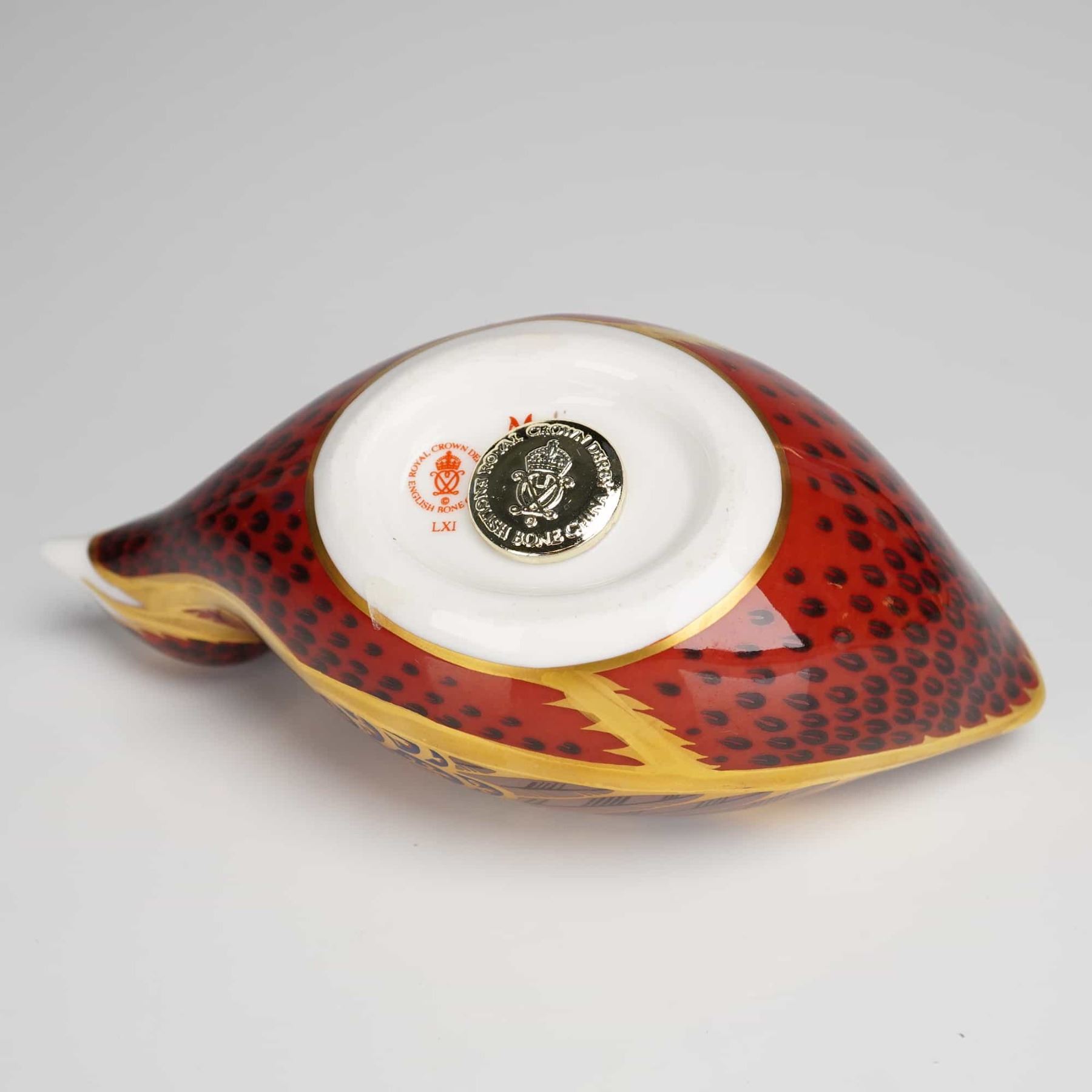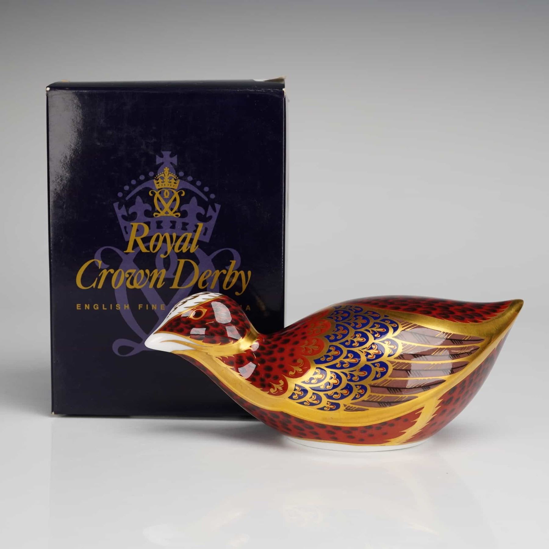 A Royal Crown Derby English fine bone china paperweight modeled as a coot. The figurine is decorated in the traditional Imari style with intricate patterns in cobalt blue, iron red, and 22kt gold gilding. The underside is marked with a red factory stamp including the Roman numeral date code LXI for 1998, alongside a signature gold-toned brand stopper. The item is accompanied by its original blue presentation box, which is printed with Royal Crown Derby English Fine Bone China and the company crest in gold.