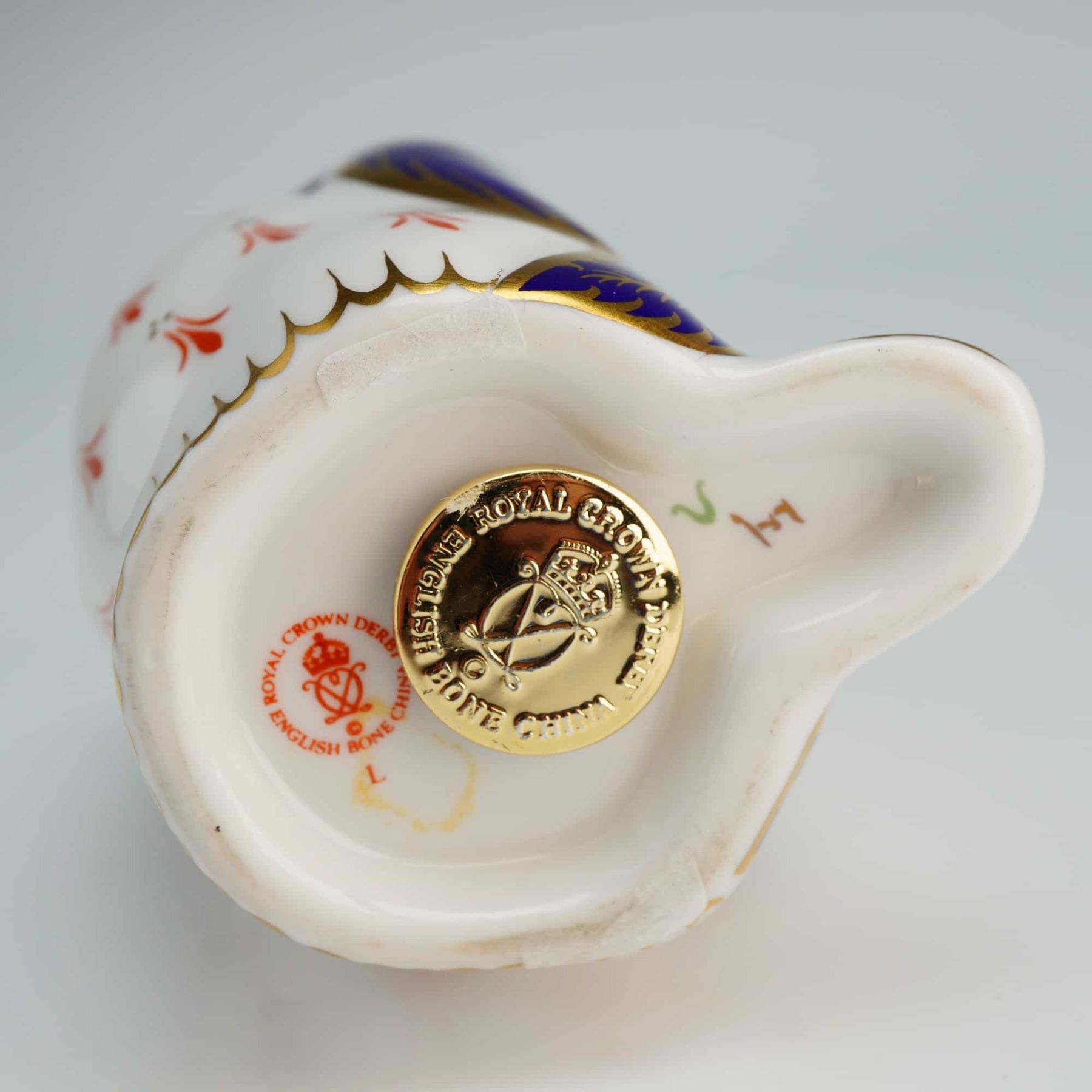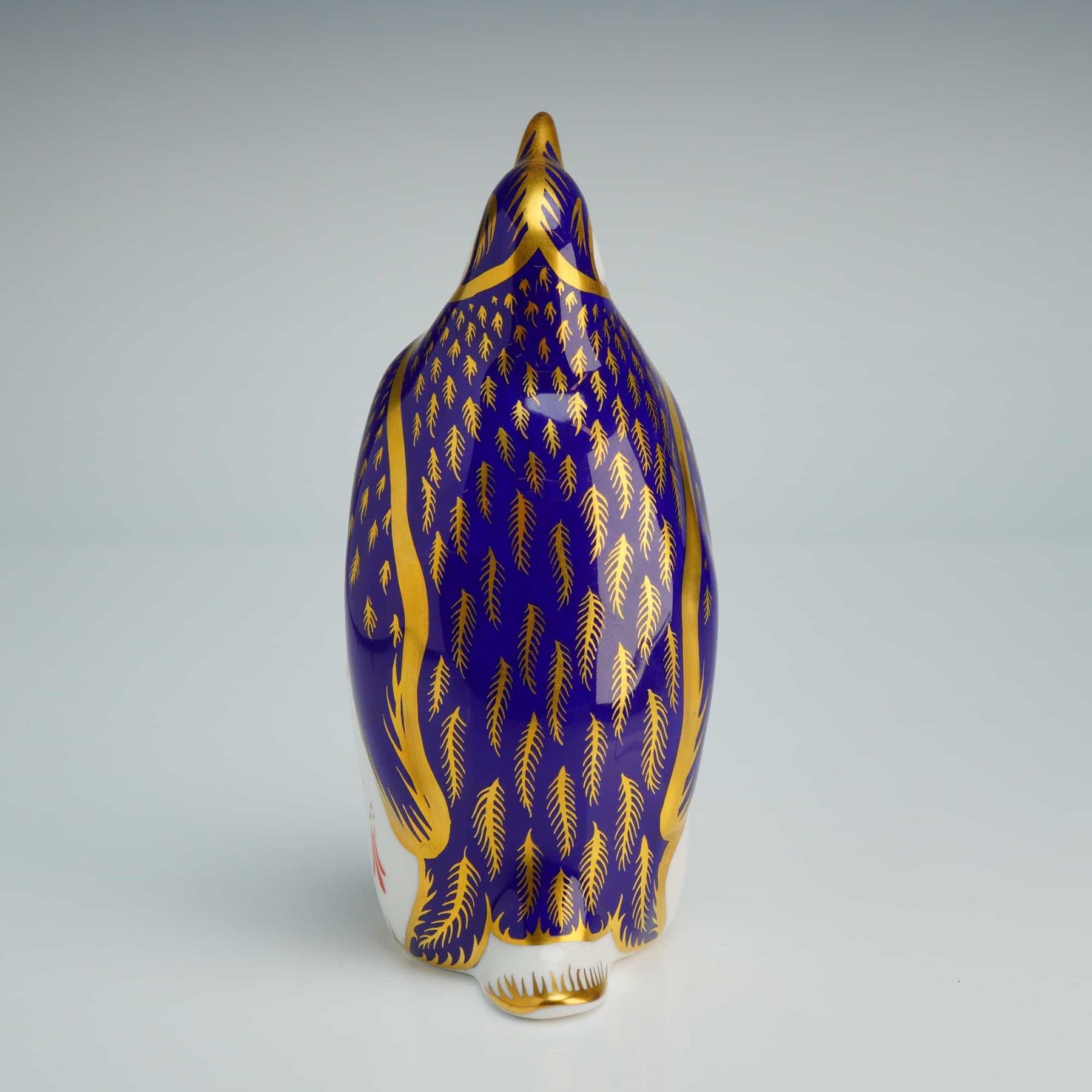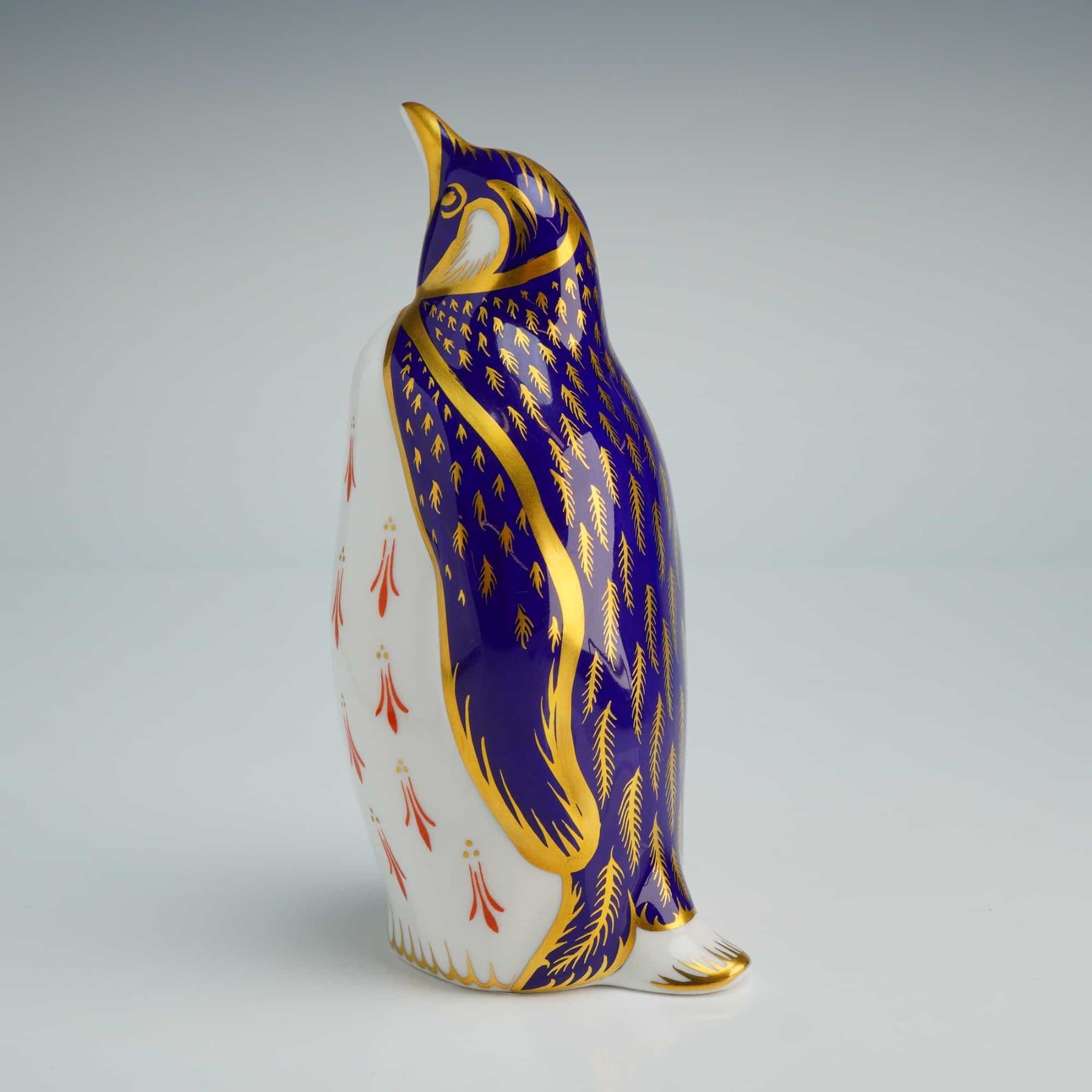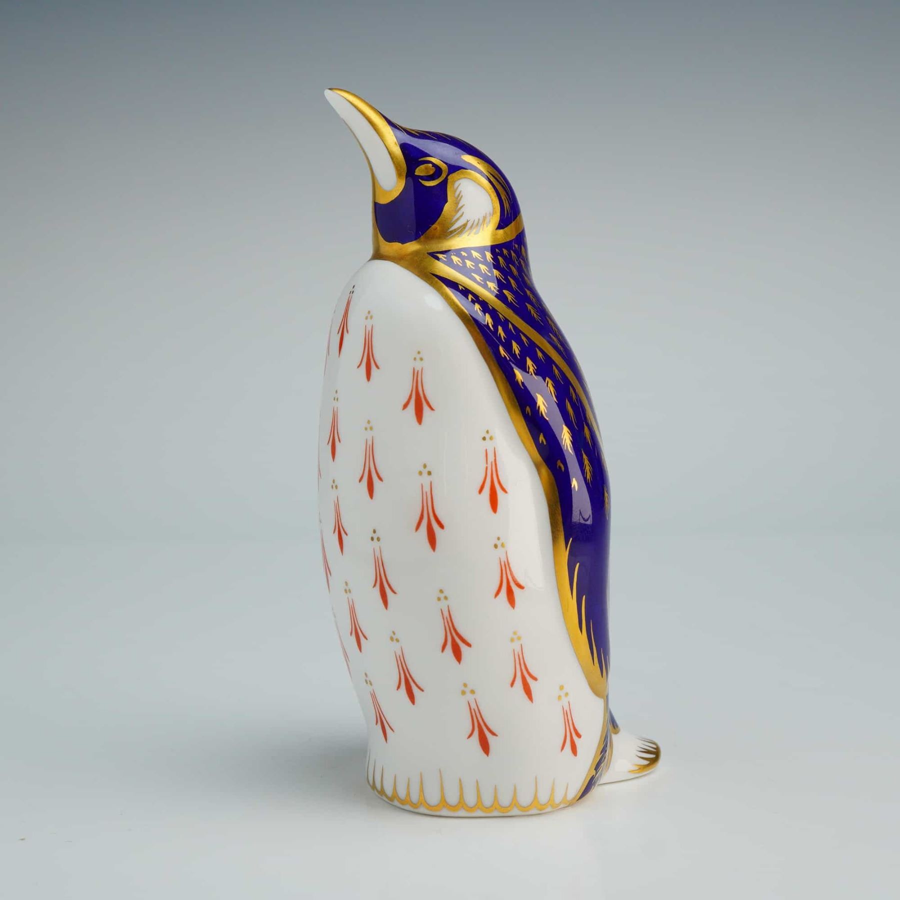The figure is decorated in a traditional Imari palette of cobalt blue, iron red, and gold. The piece features 22kt gold-gilded feather detailing across the deep blue back and head, while the white breast is accented with stylized red floral motifs and gold highlights. The underside is marked with the Royal Crown Derby red backstamp, a gold-toned signature stopper, and various hand-painted marks.