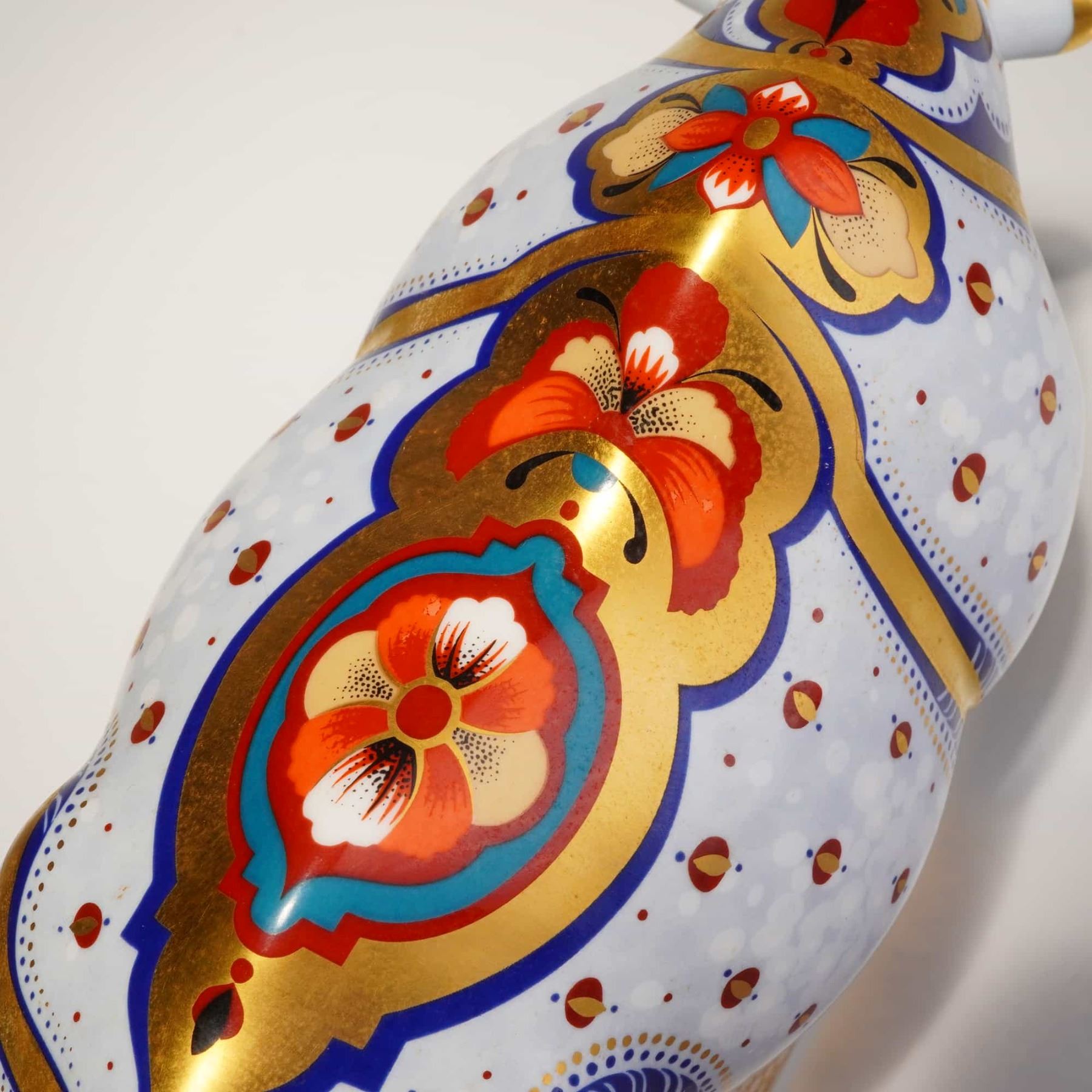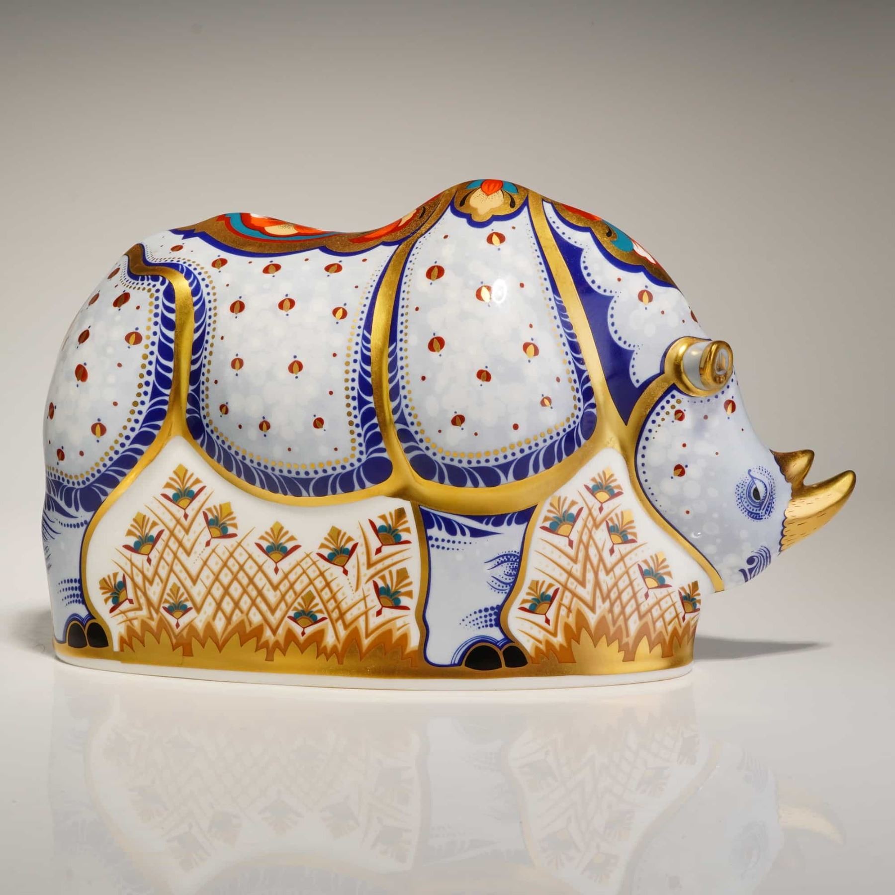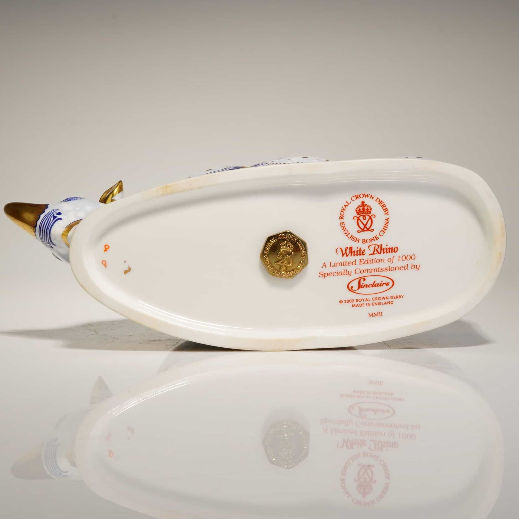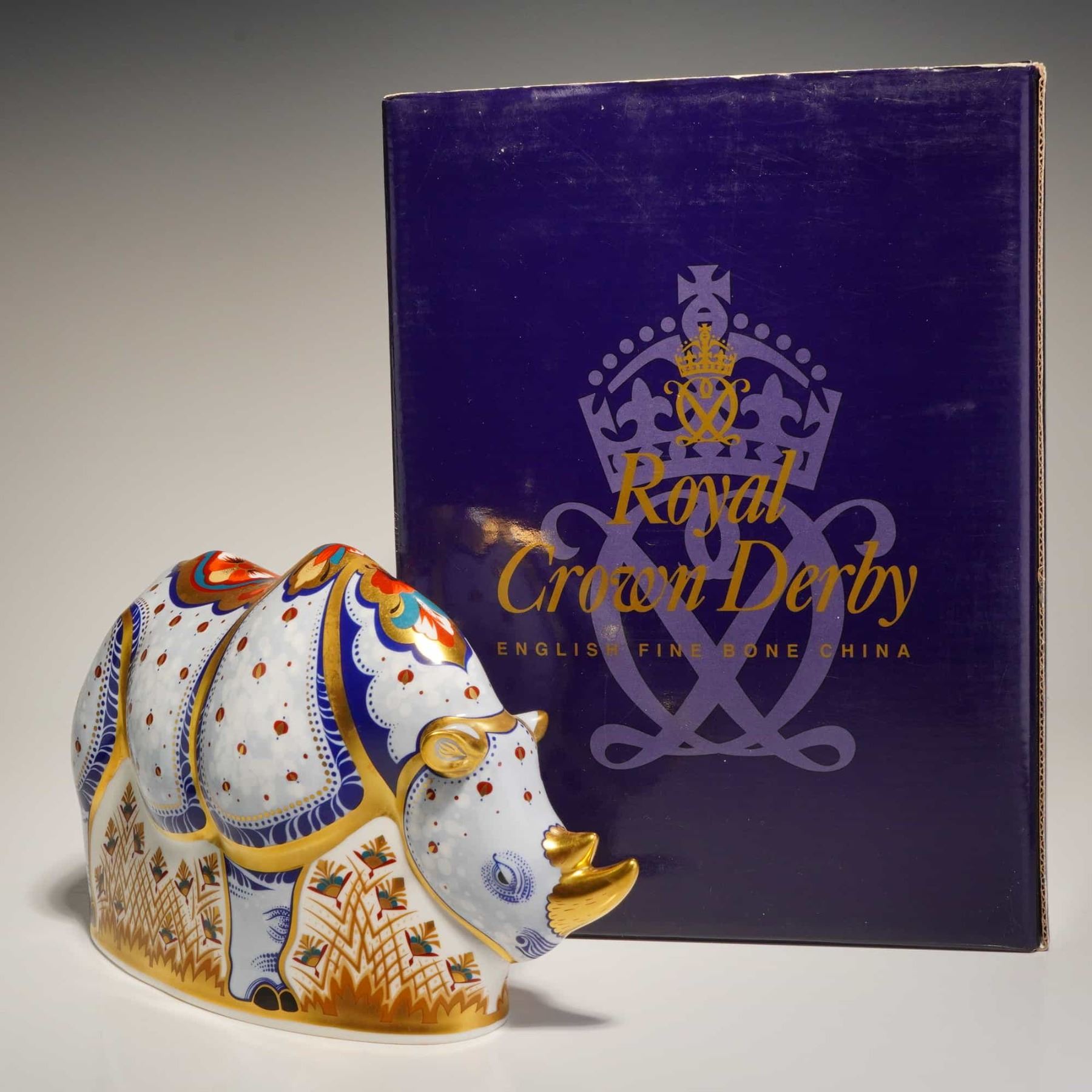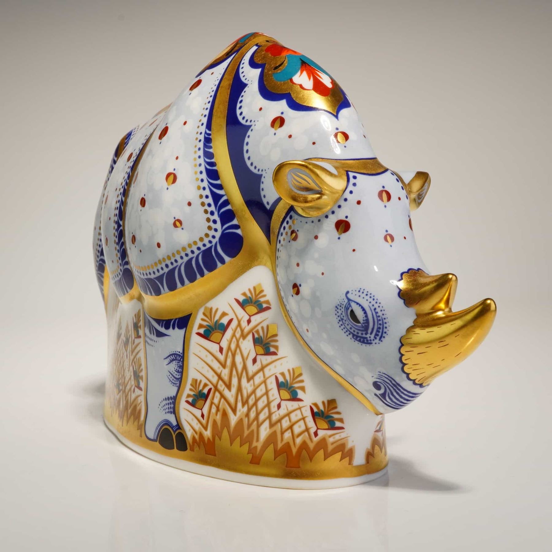 A Royal Crown Derby fine bone china paperweight titled White Rhino, produced as a limited edition of 1,000 specially commissioned by Sinclairs. This piece is part of the Endangered Species series. The figurine is decorated in an Imari-inspired style using a color palette of cobalt blue and iron red, with gold gilding. The pattern includes floral panels on the back, dotted texturing on the body, and stylized botanical motifs along the lower sections. The rhinoceros features two gilded horns. The base retains the red factory backstamp, the date code MMII for 2002, and identifying text for the limited edition and Sinclairs commission. It includes a gold-toned stopper and is accompanied by the original purple branded presentation box.