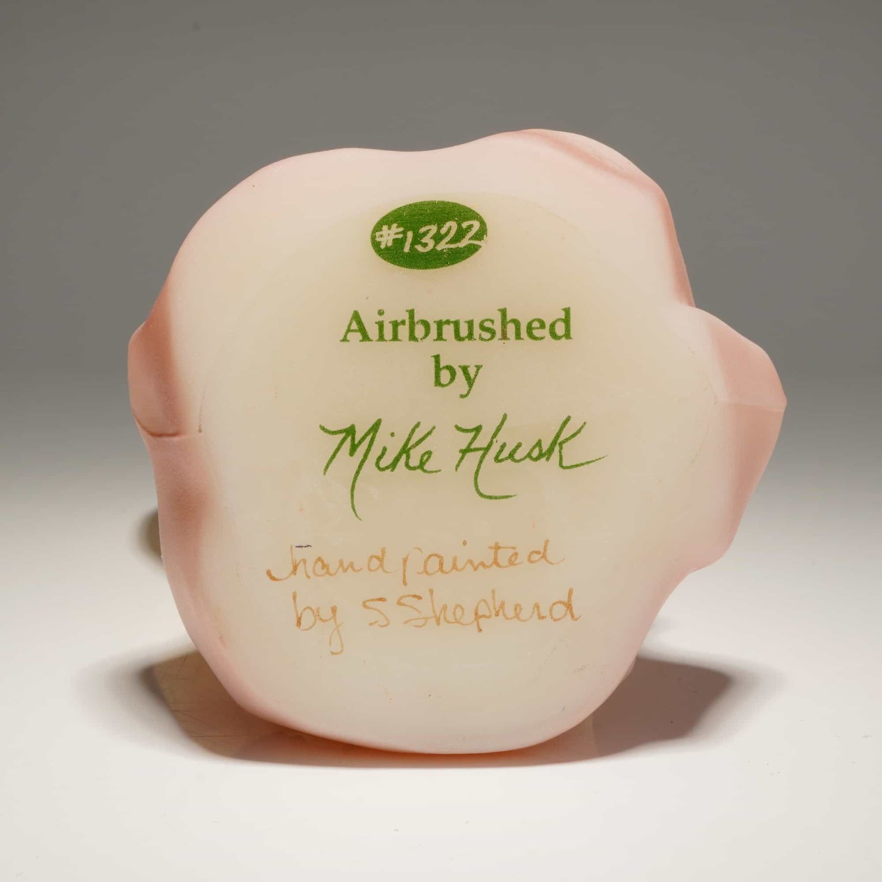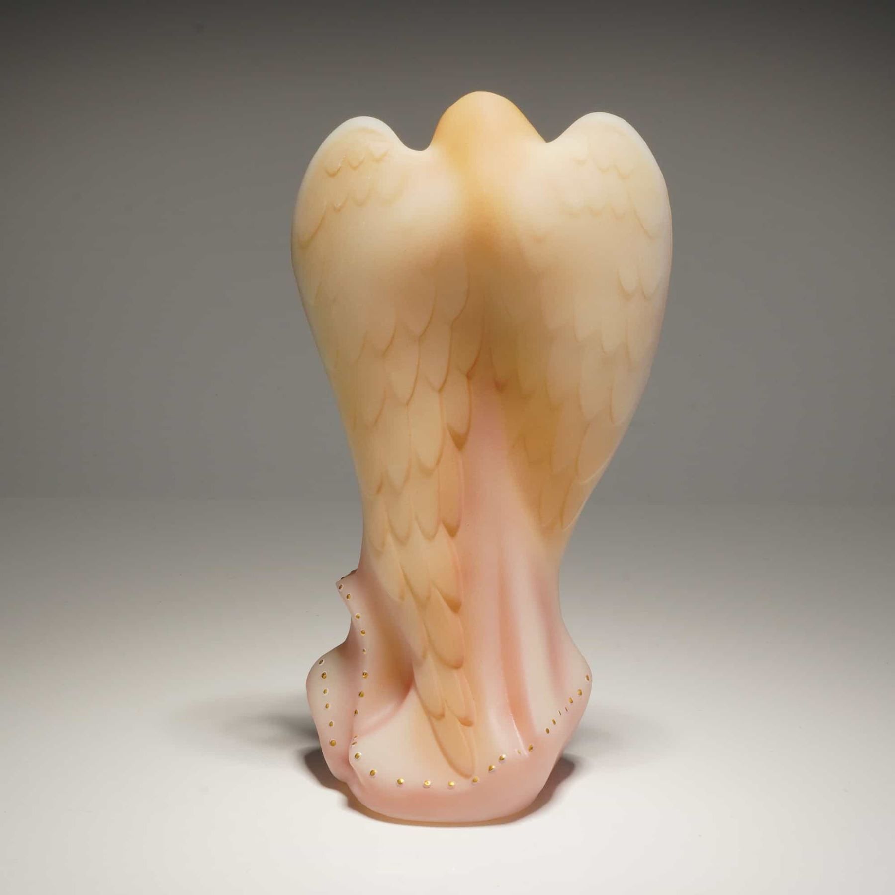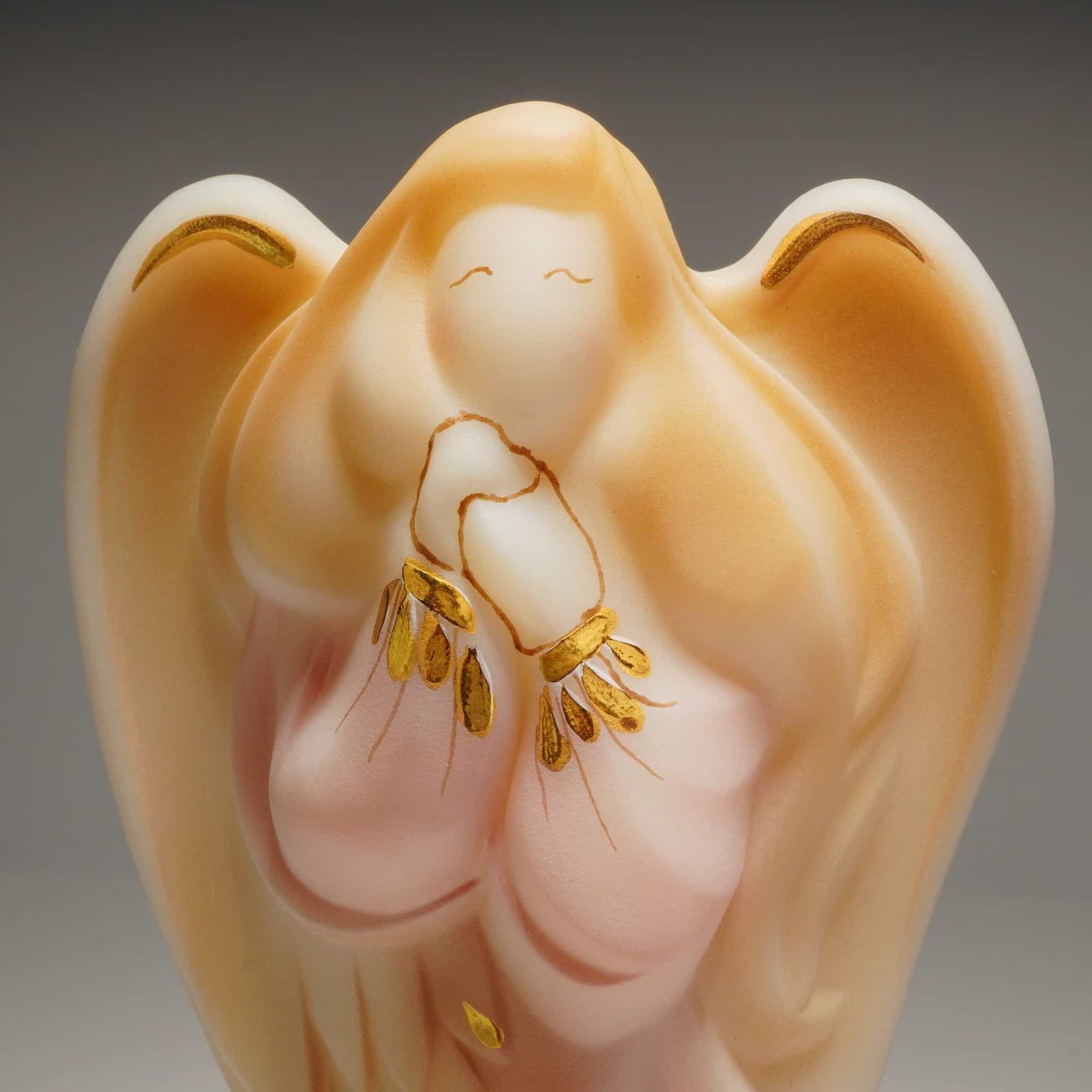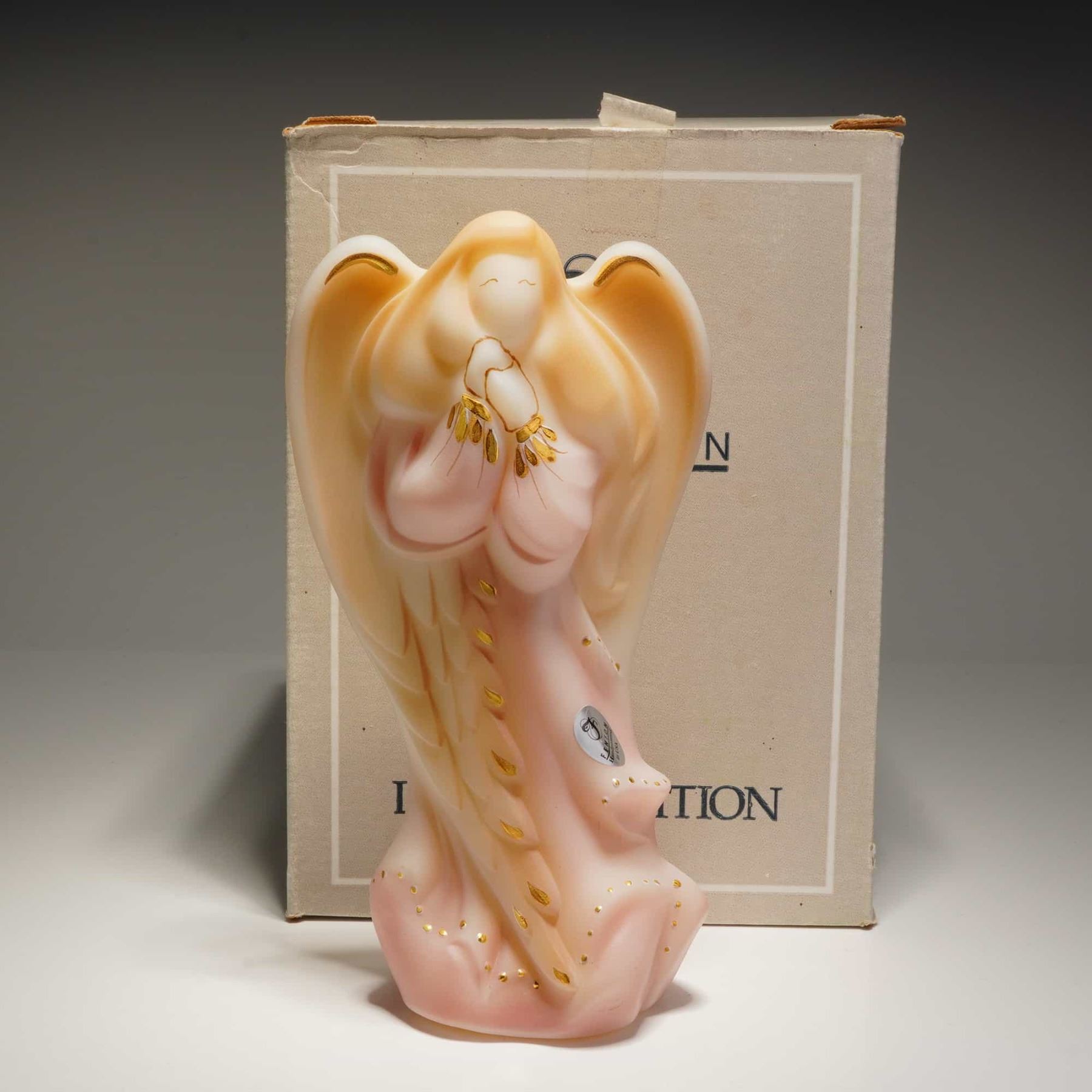 A Fenton Radiant Angel Figurine model number 5542HJ, #1322, made of peach and pink satin glass with gold accents, airbrushed by Mike Husk and hand painted by S Shepherd, shown with its original box.