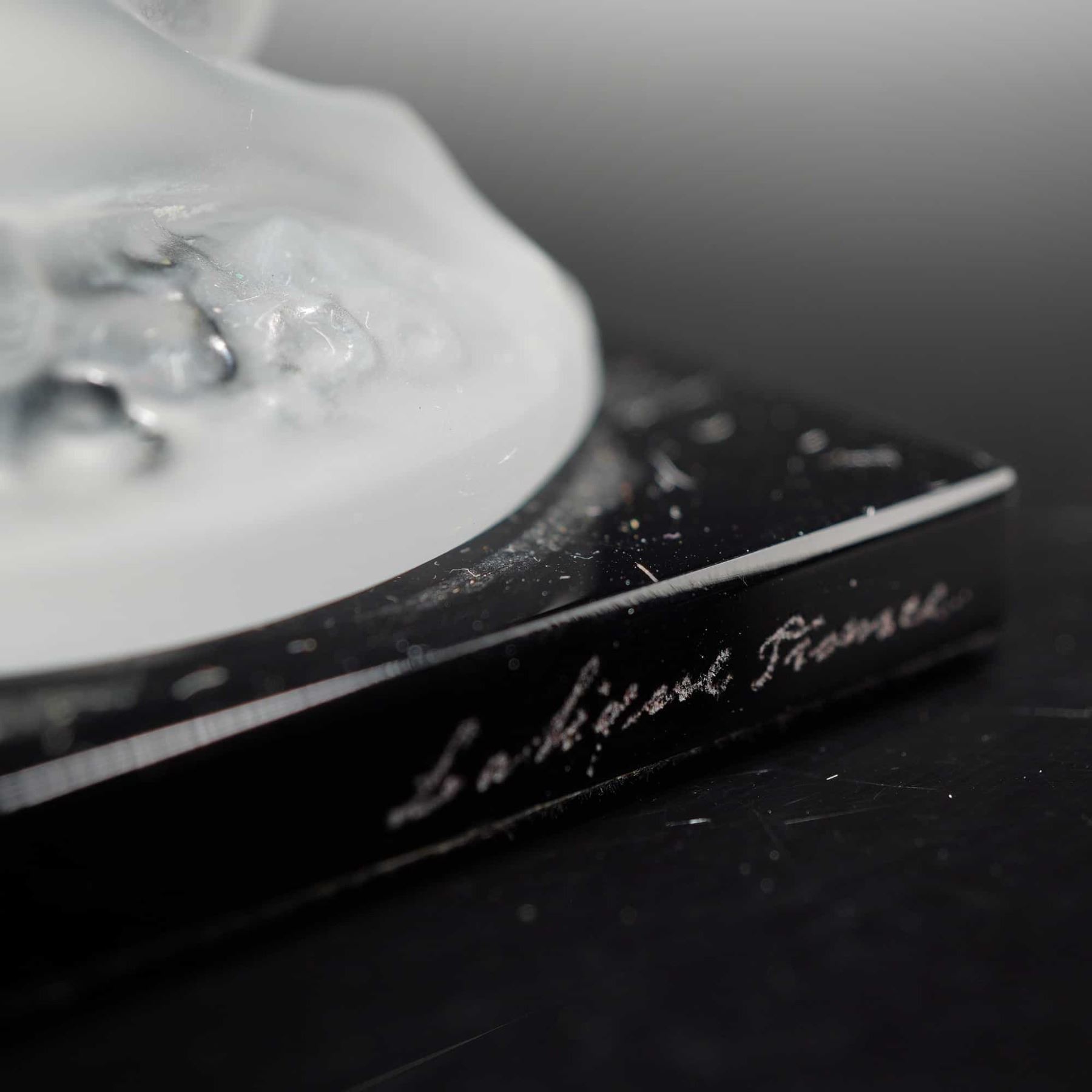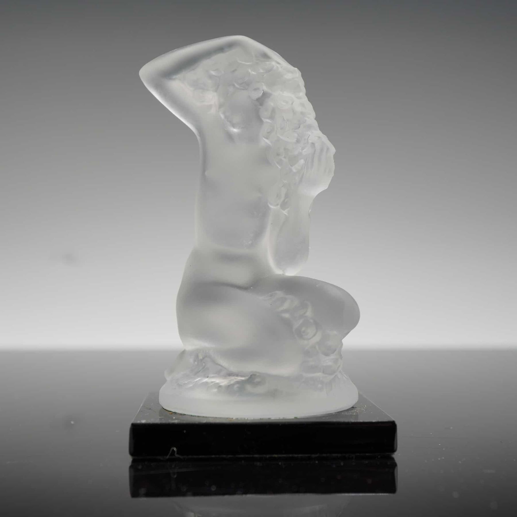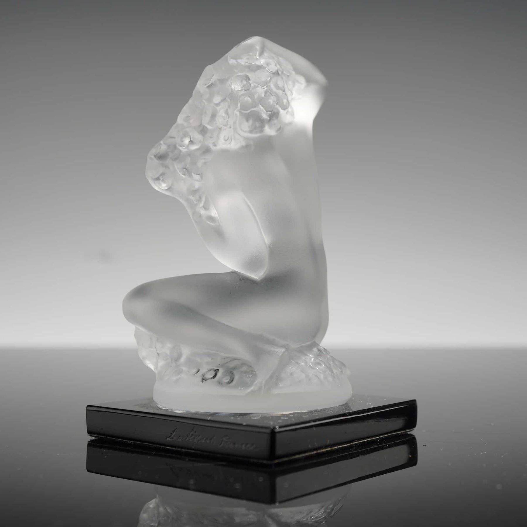 The sculpture depicts a kneeling nude female figure with floral motifs in her hair, executed in frosted glass with a characteristic satin finish. The figure is mounted on a square black glass base. The side of the base is hand-etched with the signature Lalique France. The design is rendered in the Art Deco style.