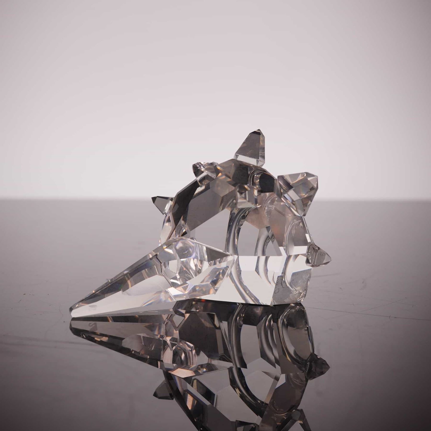 A Swarovski "Silver Crystal" figurine titled "South Sea Shell," model number 7624 072. This piece is part of the brand's marine-themed collections and is expertly crafted from clear, high-lead faceted crystal. The design features a stylized, spiraling marine shell form accented by numerous sharp, machine-cut protrusions and spikes designed to maximize light refraction and internal brilliance. The figurine bears the authentic laser-etched Swarovski swan logo on the underside of the pointed tip. This item is accompanied by its original cylindrical Swarovski "Silver Crystal" branded packaging with protective foam inserts. Dimensions: Approximately 2 inches in length.