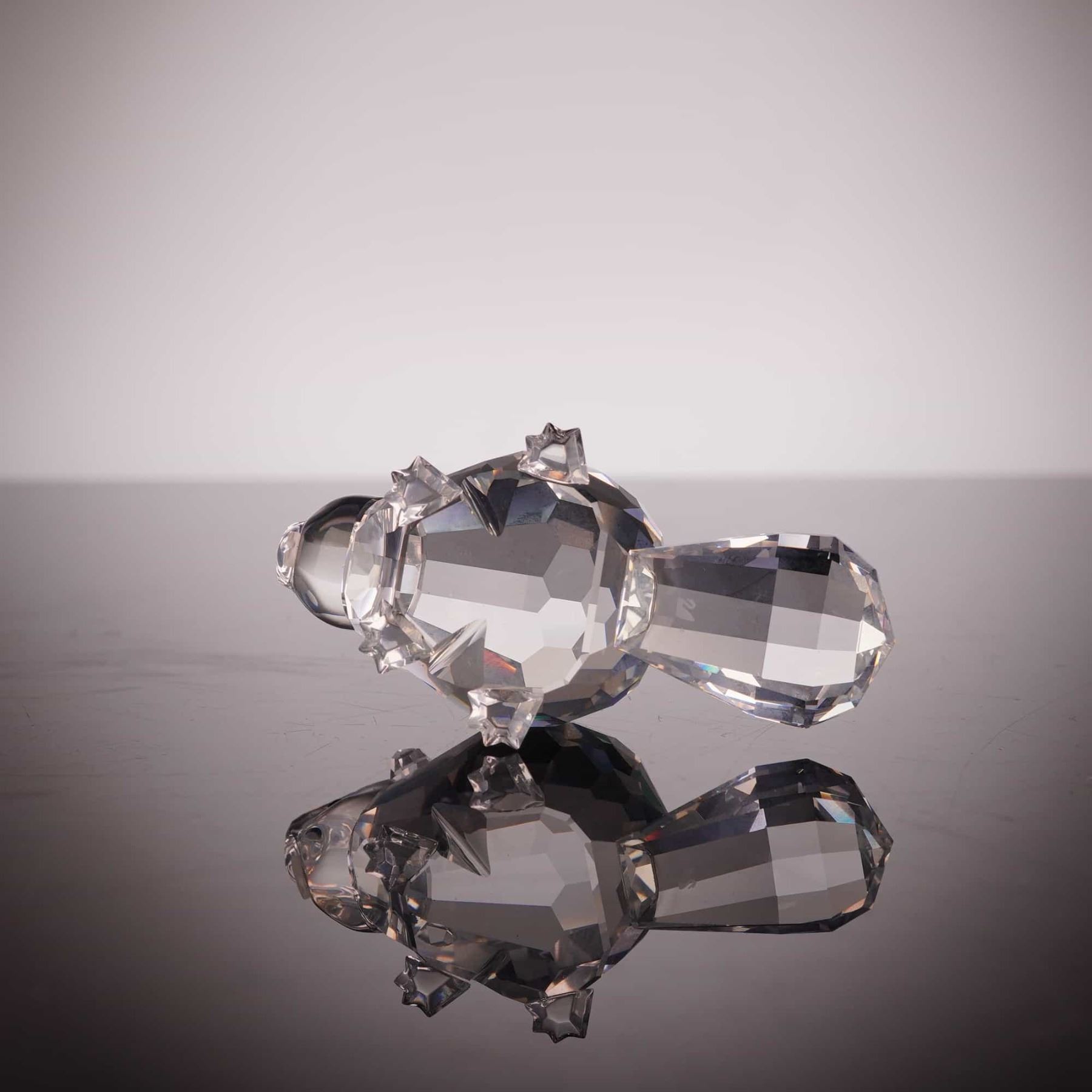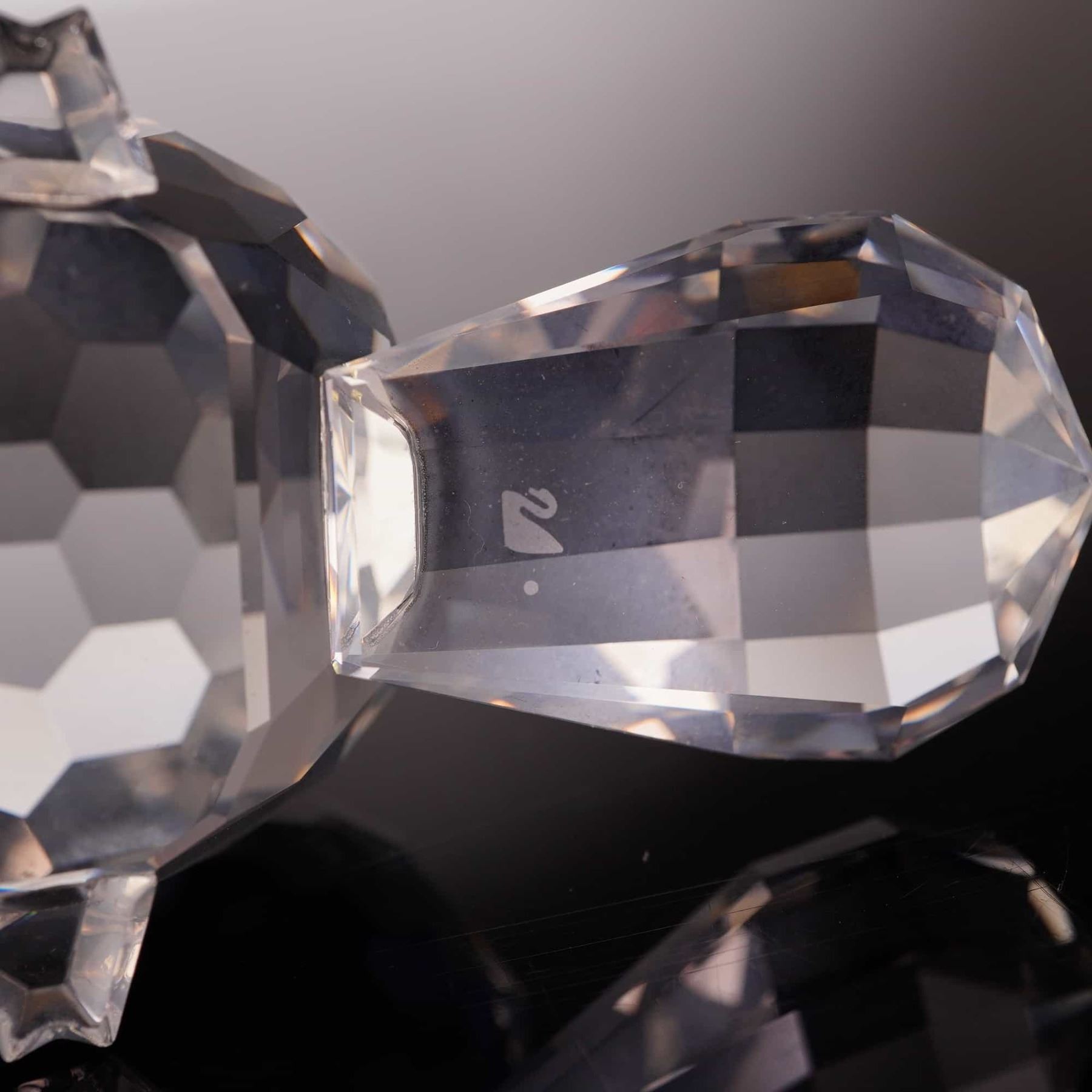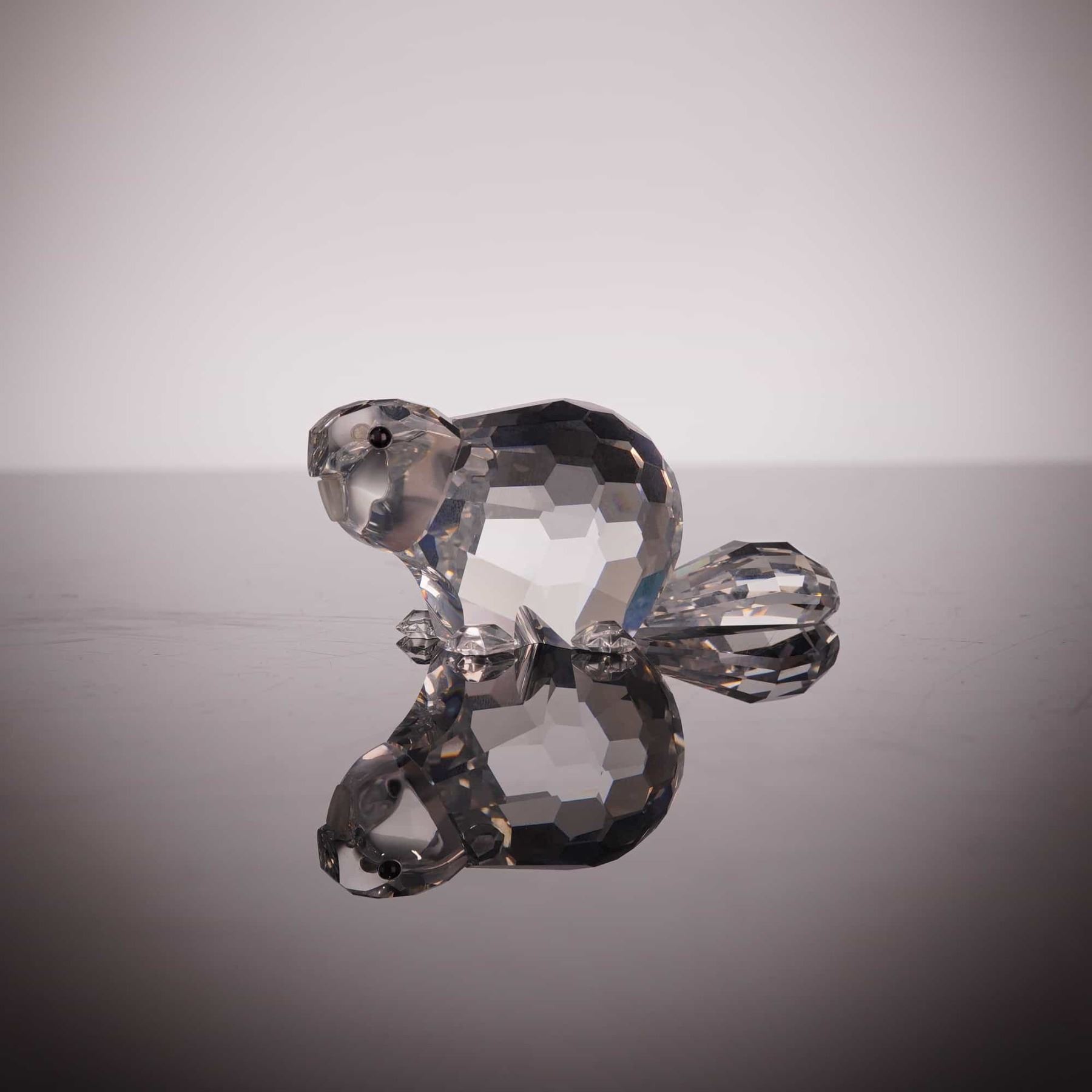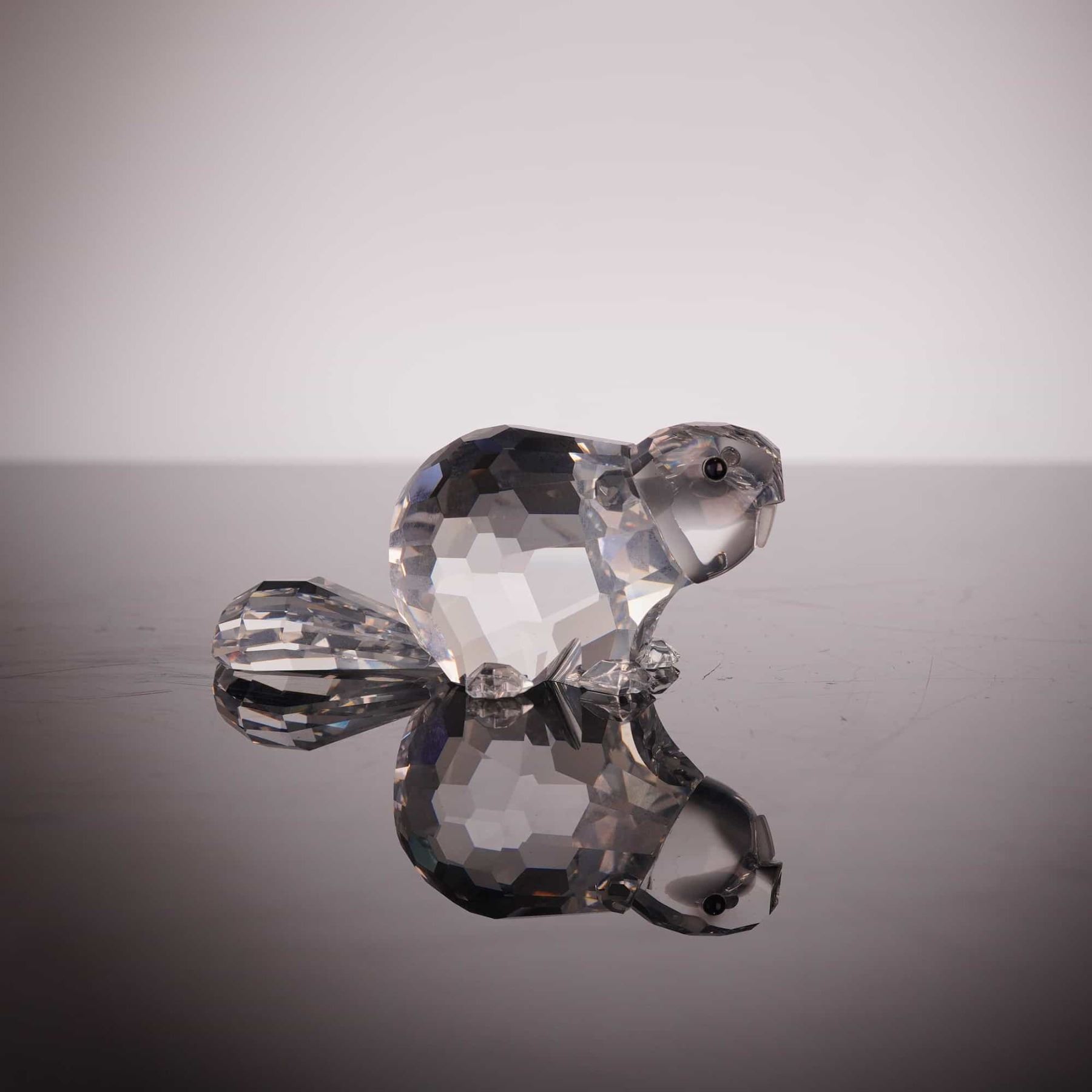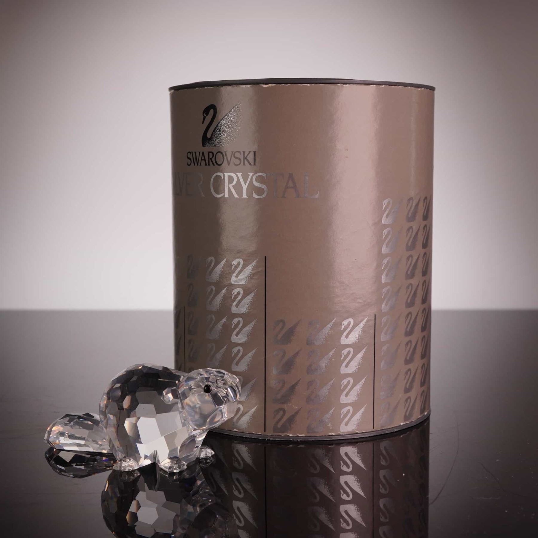 Swarovski. This faceted lead crystal figurine depicts a beaver, part of the Silver Crystal Wildlife collection and identified as the Mother Beaver. The piece is crafted with a clear faceted body, a wide flattened tail, and four small crystal feet. The head features fixed black bead eyes and a frosted crystal snout. The underside of the tail is marked with the acid-etched Swarovski swan logo. The figurine is accompanied by its original cylindrical Silver Crystal branded box with a swan logo pattern. Height: 1.75 inches.