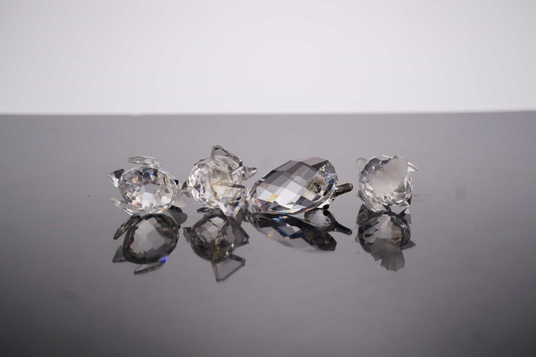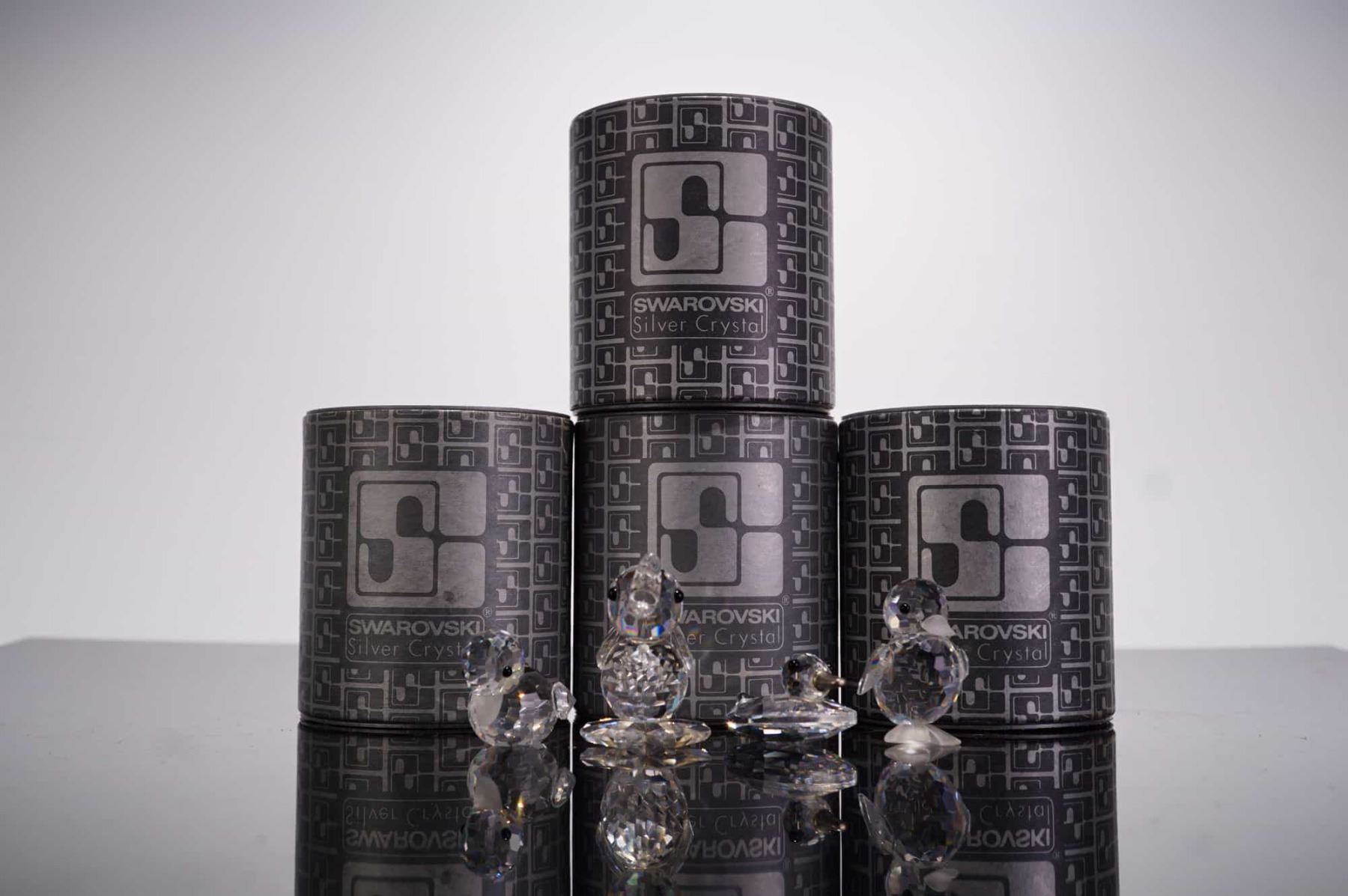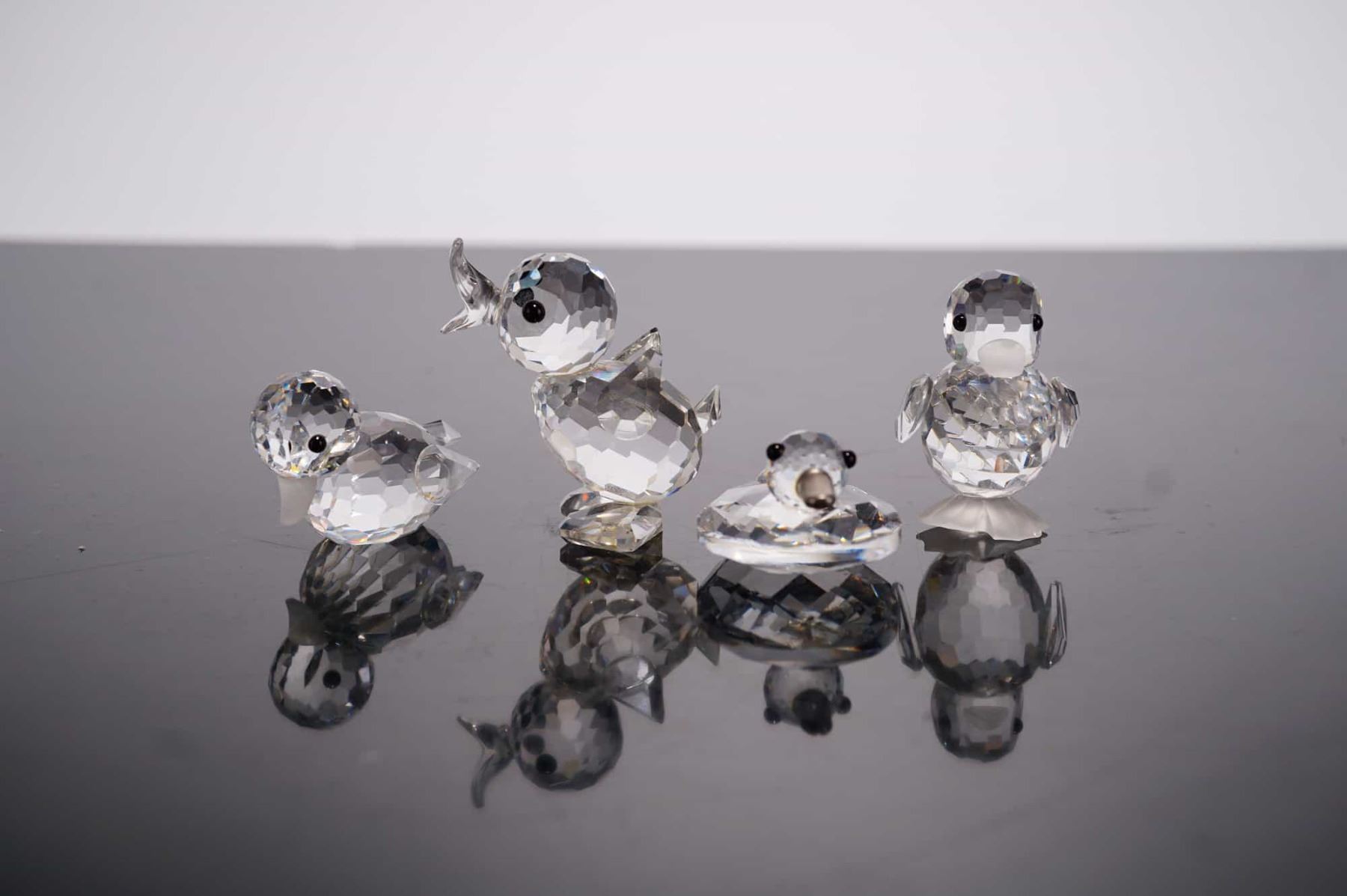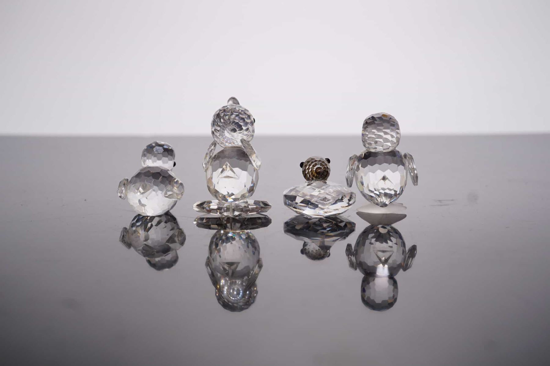 Swarovski Silver Crystal miniature figurines. This collection features four faceted lead crystal ducklings in various animated poses, including a swimming duckling, a standing duckling with an open beak, a standing duckling with outstretched wings, and a standard standing duckling. Each figurine is detailed with applied fixed black crystal bead eyes. The set is accompanied by four original cylindrical gray Swarovski Silver Crystal boxes featuring the brand's logo. While the swan logo is not clearly visible in the provided base photographs, the manufacturer is confirmed by the original packaging. Height: 0.75 in to 1.25 in.