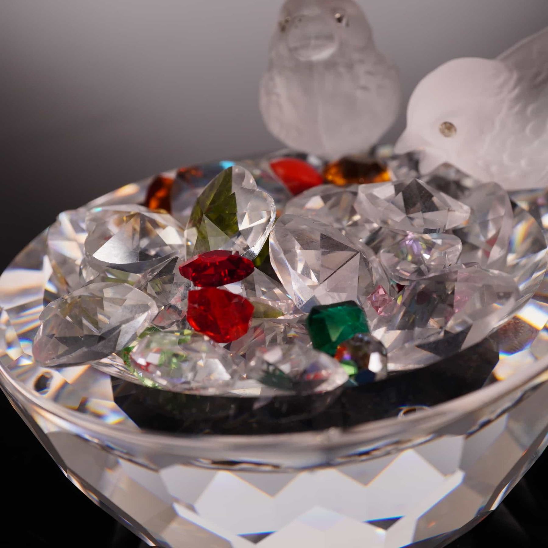 This Swarovski crystal figurine, titled Bird Bath (model number 10029 / 7460 NR 108), is a retired piece from the Feathered Beauties collection. The design features a brilliant, faceted clear crystal bowl with two delicately frosted crystal birds perched upon the rim. The interior of the bowl is filled with a collection of loose, multi-colored decorative stones in the form of faceted crystals, including shades of ruby red, emerald green, amber, and clear. The side of the bowl is clearly marked with the etched Swarovski swan logo and the word SWAROVSKI in uppercase serif font. Height: 1.5 inches.