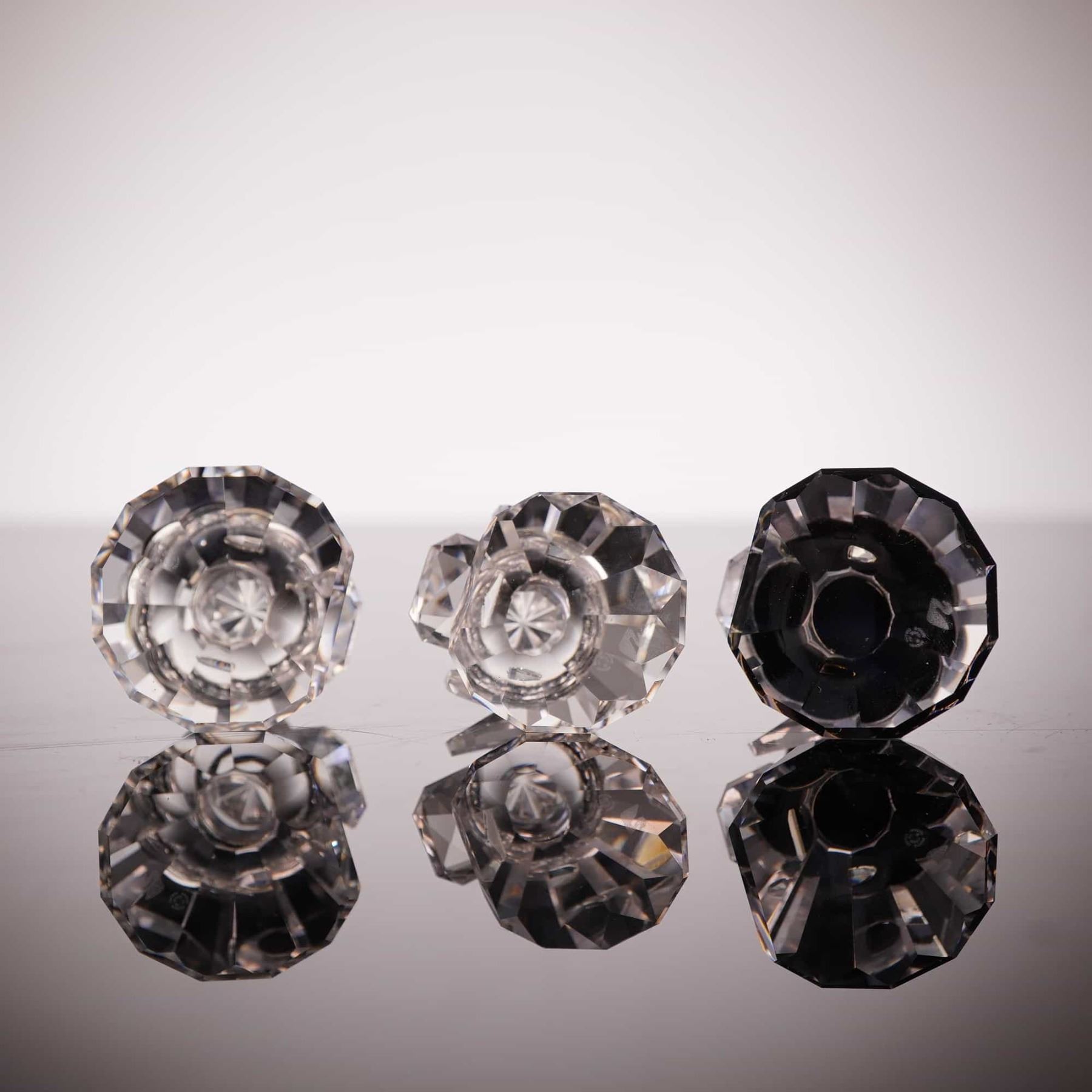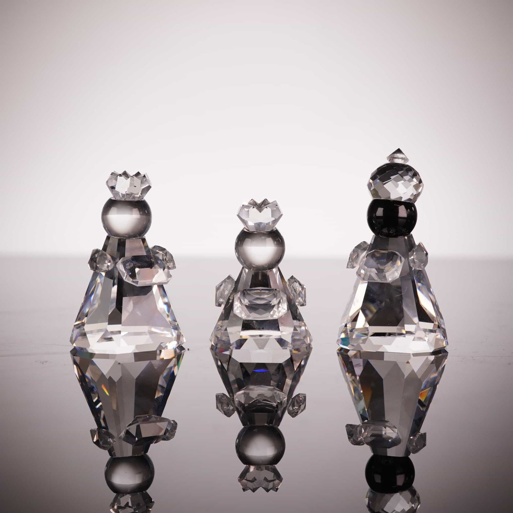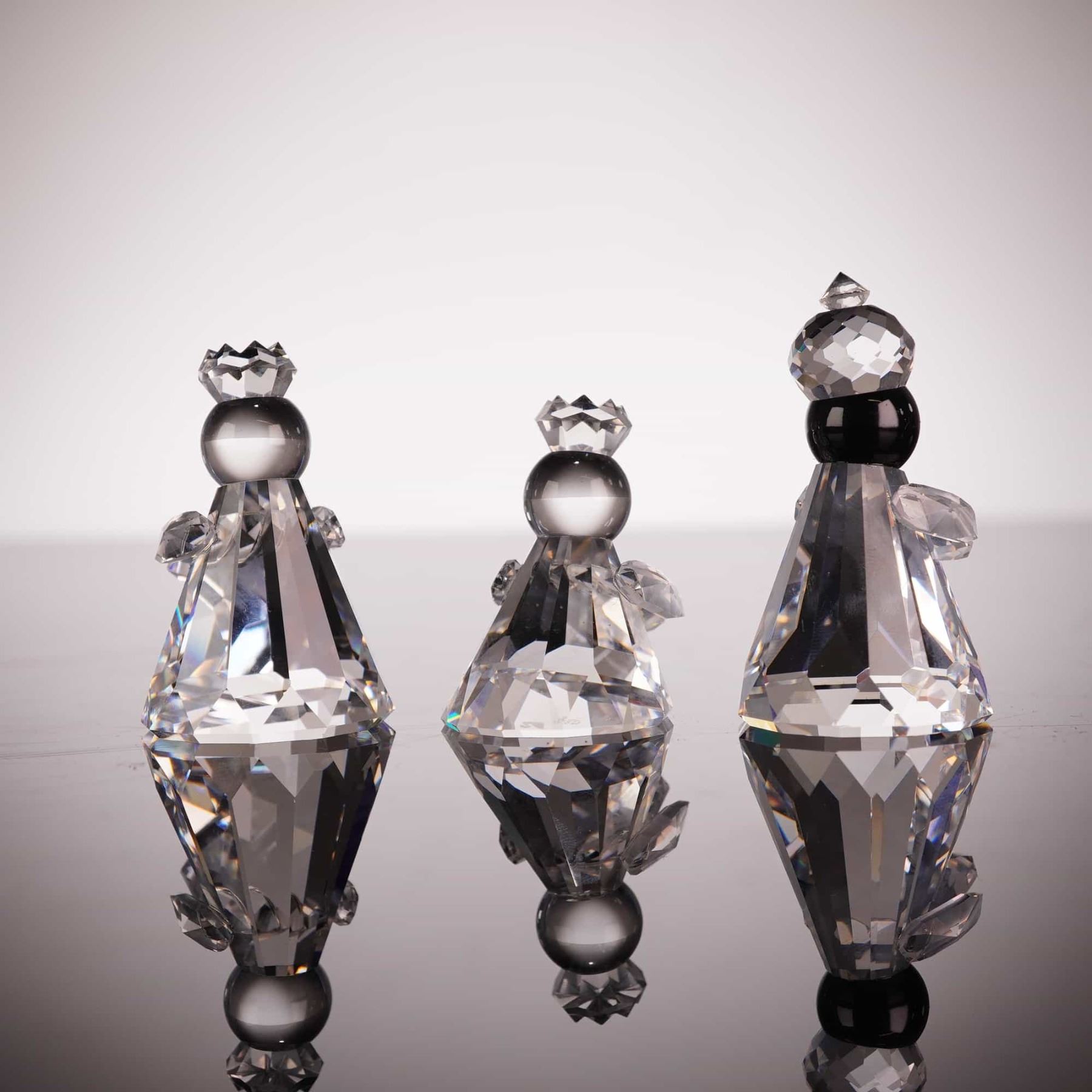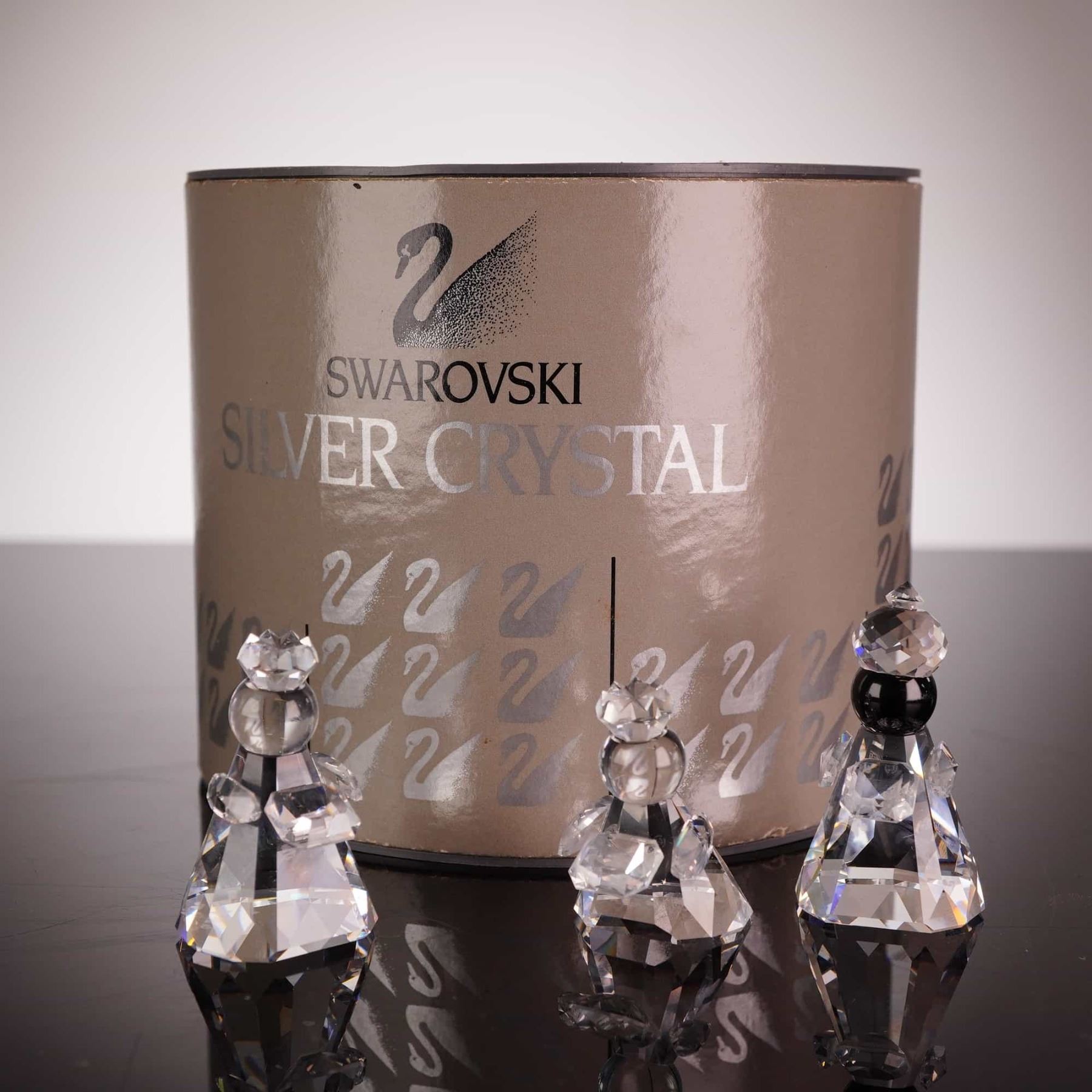 This set of three Swarovski Silver Crystal figurines from the Nativity collection depicts the Three Wise Men: Melchior, Caspar, and Balthazar. Each figure is crafted from faceted lead crystal with conical bodies and spherical heads topped with faceted crowns. Balthazar is distinguished by a Jet black crystal head. The set includes Melchior (model 171457), Caspar (model 171458), and Balthazar (model 171459), collectively cataloged under set number 166165. Each piece features the Swarovski swan logo acid-etched on the base. The set is accompanied by its original Swarovski Silver Crystal cylindrical storage box with foam inserts. Height of the largest figure: 2.375 inches.