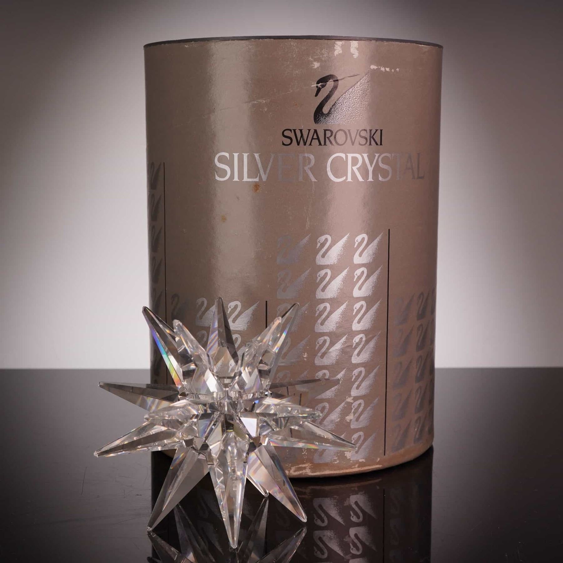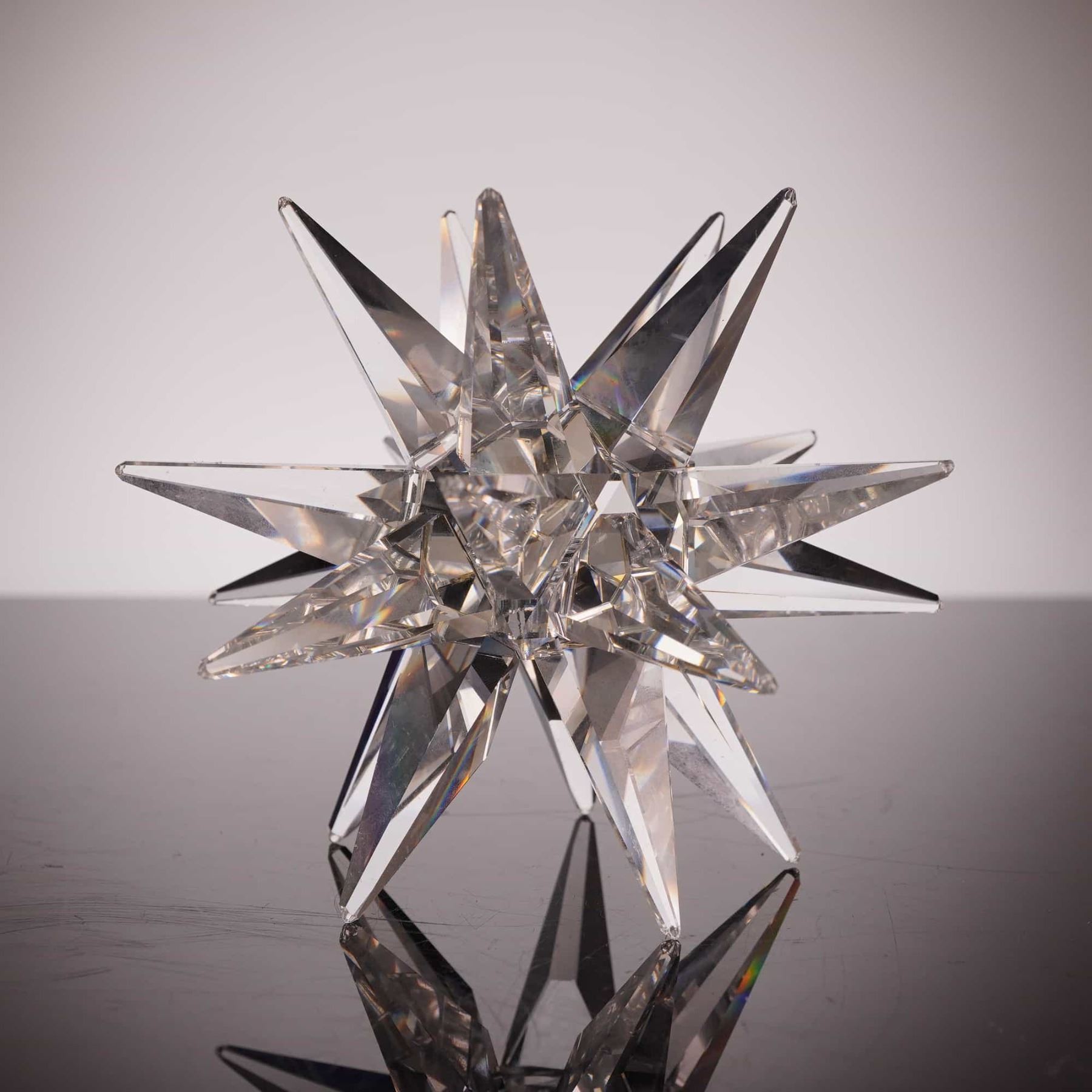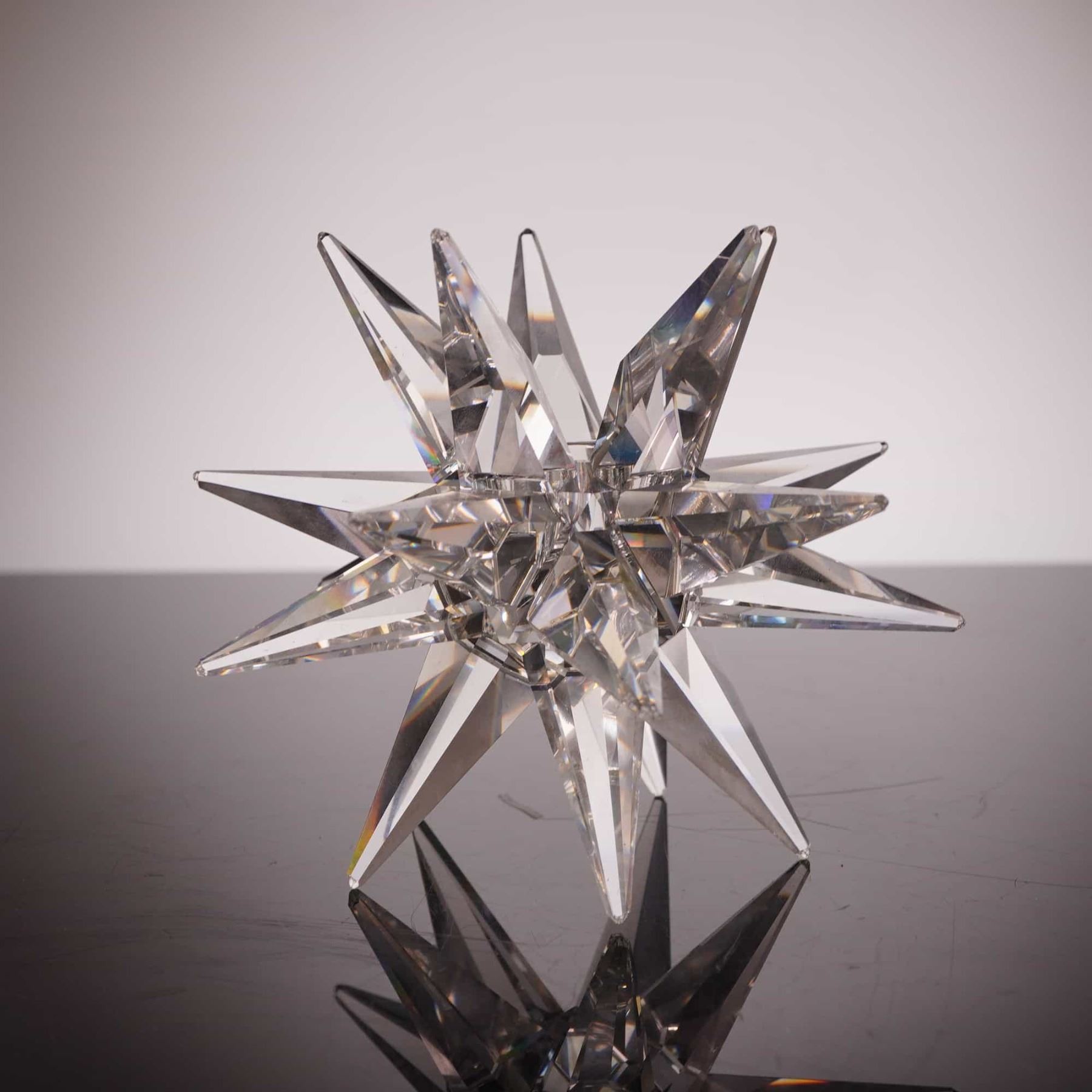 This lot features a precision-cut lead crystal candleholder from the Swarovski Silver Crystal collection. The piece is designed in a complex stellated octahedron or Moravian star shape, composed of eighteen multifaceted, elongated pyramidal points radiating from a central core. Each facet is precision-machine cut to maximize light refraction and prismatic "fire," a hallmark of Swarovski’s high-lead Austrian crystal production. The center of the star features a recessed well designed to hold a candle. The item bears the authentic laser-etched Swarovski swan logo on one of the crystal facets and is accompanied by its original cylindrical "Swarovski Silver Crystal" branded packaging. Dimensions: Approximately 4.5 inches in diameter.