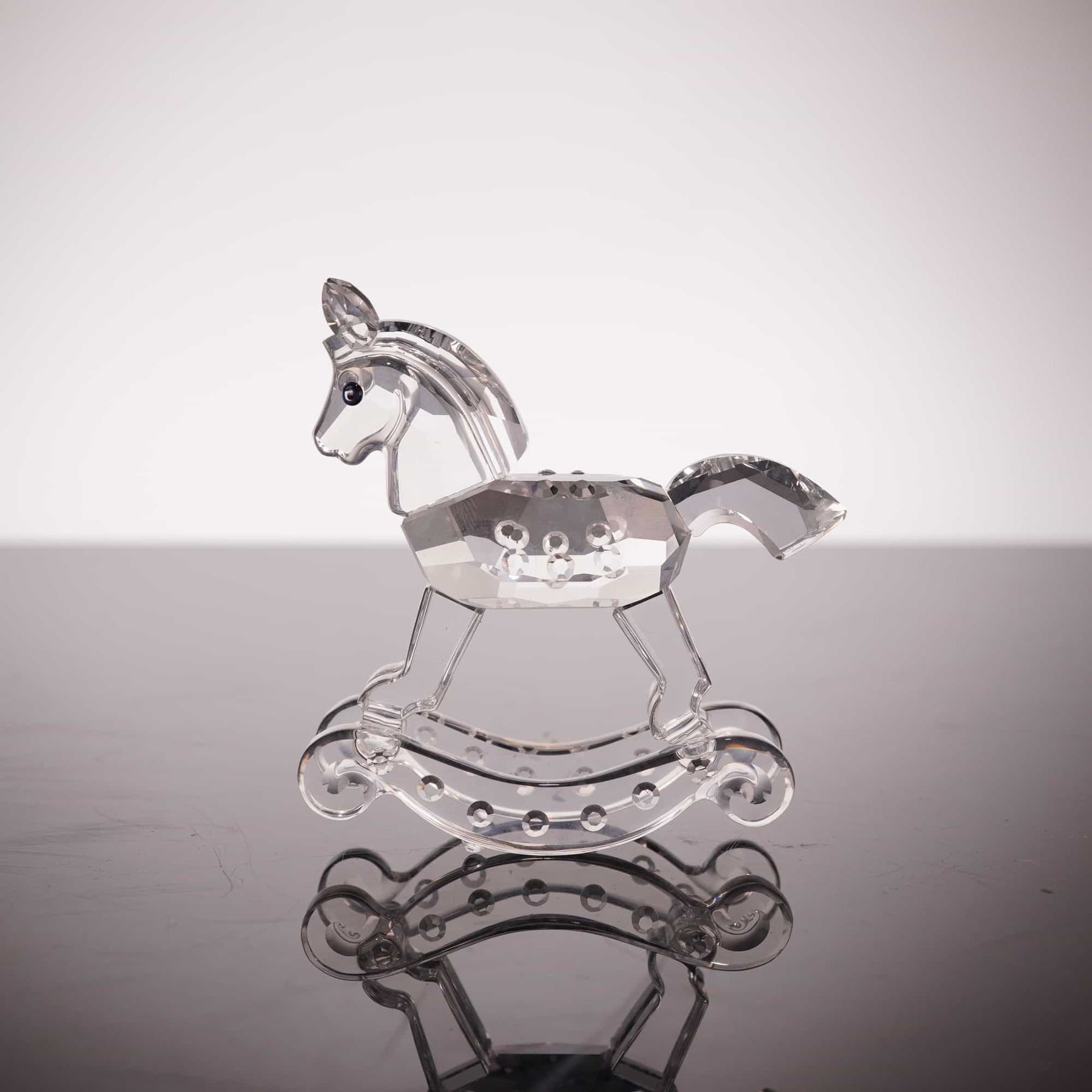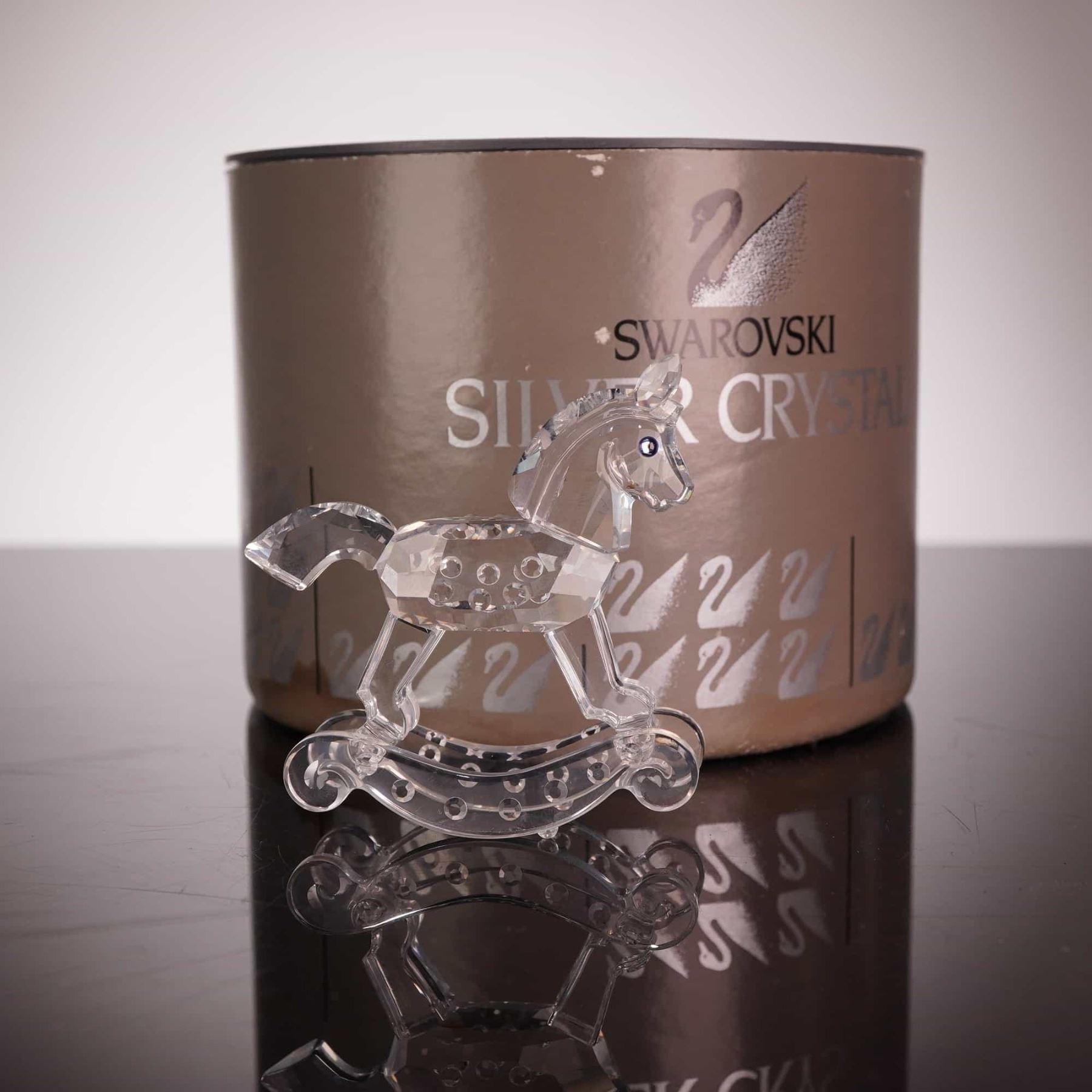 A Swarovski Silver Crystal figurine titled Rocking Horse, model number 183270 (also cataloged as 7475 000 003). This piece was originally part of the When We Were Young collection and was retired in 2004. The figurine is meticulously crafted from faceted and frosted lead crystal, featuring a faceted body and tail, a frosted head and mane, and small blue crystal eyes. The horse is mounted on curved clear crystal rockers accented with decorative circular elements. The Swarovski acid-etched swan logo is clearly visible on the underside of the tail. This item is accompanied by its original cylindrical Swarovski Silver Crystal cardboard box featuring the swan logo. Height: 1 5/8 inches (41 mm).