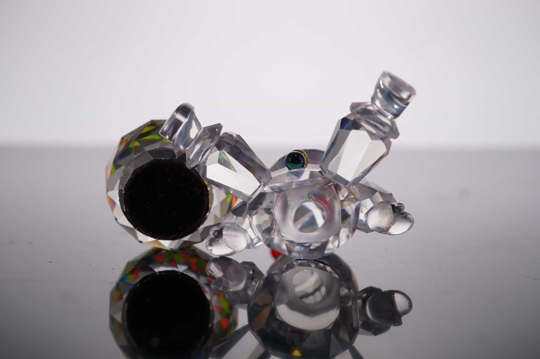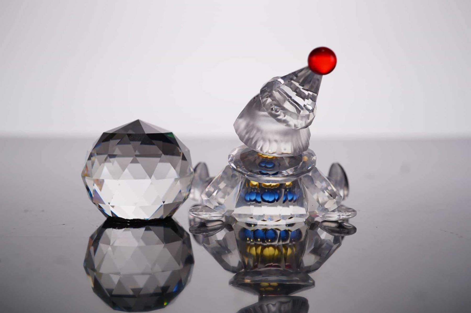 This Swarovski Silver Crystal figurine, known as the Puppet (model 217207), was released as part of the When We Were Young collection. The seated figure features a frosted crystal face and a clear faceted body, accented by three colored crystal buttons in red, yellow, and blue. A red crystal pom-pom sits atop the clown's conical hat. The lot includes a separate, large faceted crystal ball. The underside of the figurine is marked with the etched Swarovski swan logo, indicating production after 1988. This item is accompanied by its original cylindrical Swarovski Silver Crystal presentation box. Height: 1.7 inches.