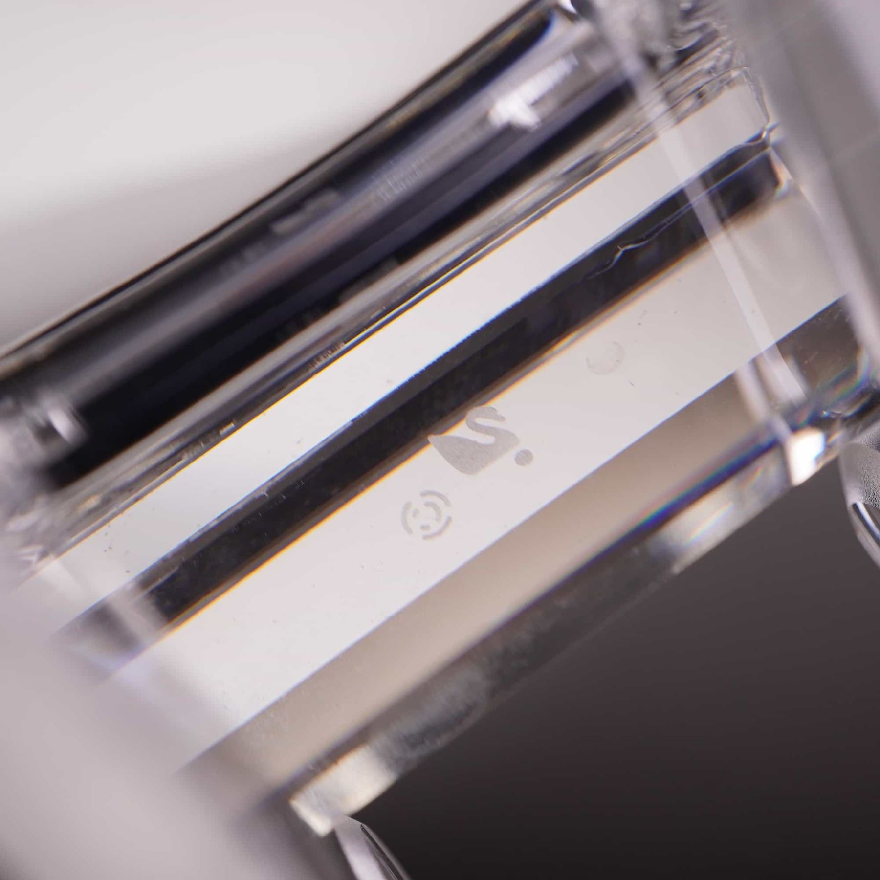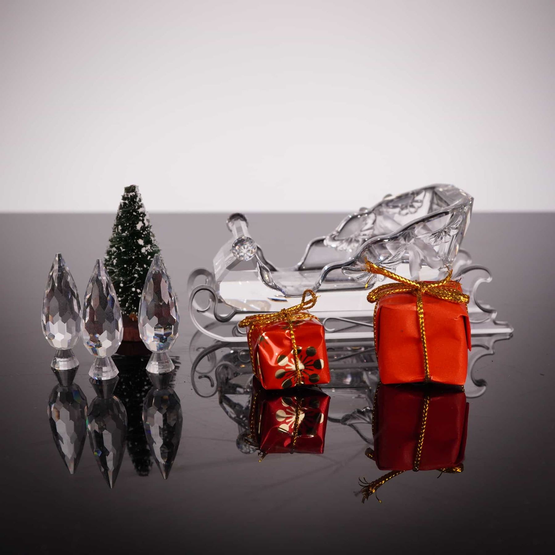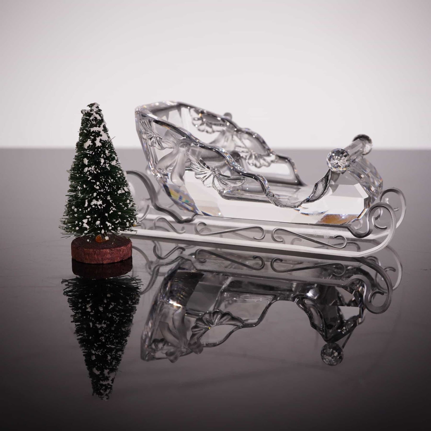 This fine lead crystal holiday figurine is the Santa’s Sleigh from the Swarovski When We Were Young collection, model number 205830. Designed by Anton Hirzinger, the piece was introduced in 1996 and retired in 2007. The sleigh features a combination of faceted and frosted finishes, with decorative frosted ribbons and bows on the sides. It is set upon clear crystal scrolled runners. The underside of the central crystal block bears the authentic Swarovski swan logo. Accompanying the sleigh are Three small faceted crystal pine tree figurines by Swarovski. Additionally, the set includes decorative accessories including one miniature green bottle-brush tree with faux snow and a Pair of miniature foil-wrapped gift boxes. Height: 1.75 inches.