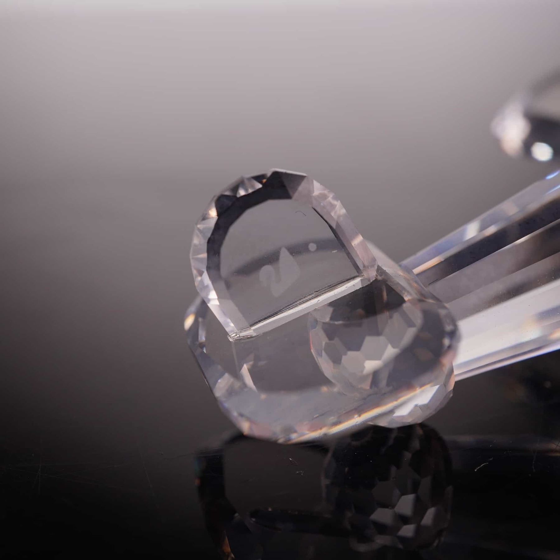 Swarovski Silver Crystal airplane figurine, model number 173 140 (system number 7473 000 001), from the When We Were Young collection. Designed by Adi Stocker, this faceted clear lead crystal piece depicts a propeller-driven aircraft with a stylized fuselage, wings, rotating-style propeller, and landing gear wheels. The figurine features the etched Swarovski swan logo on the underside of the horizontal tail stabilizer and is accompanied by its original cylindrical presentation box. Length: 2 inches.