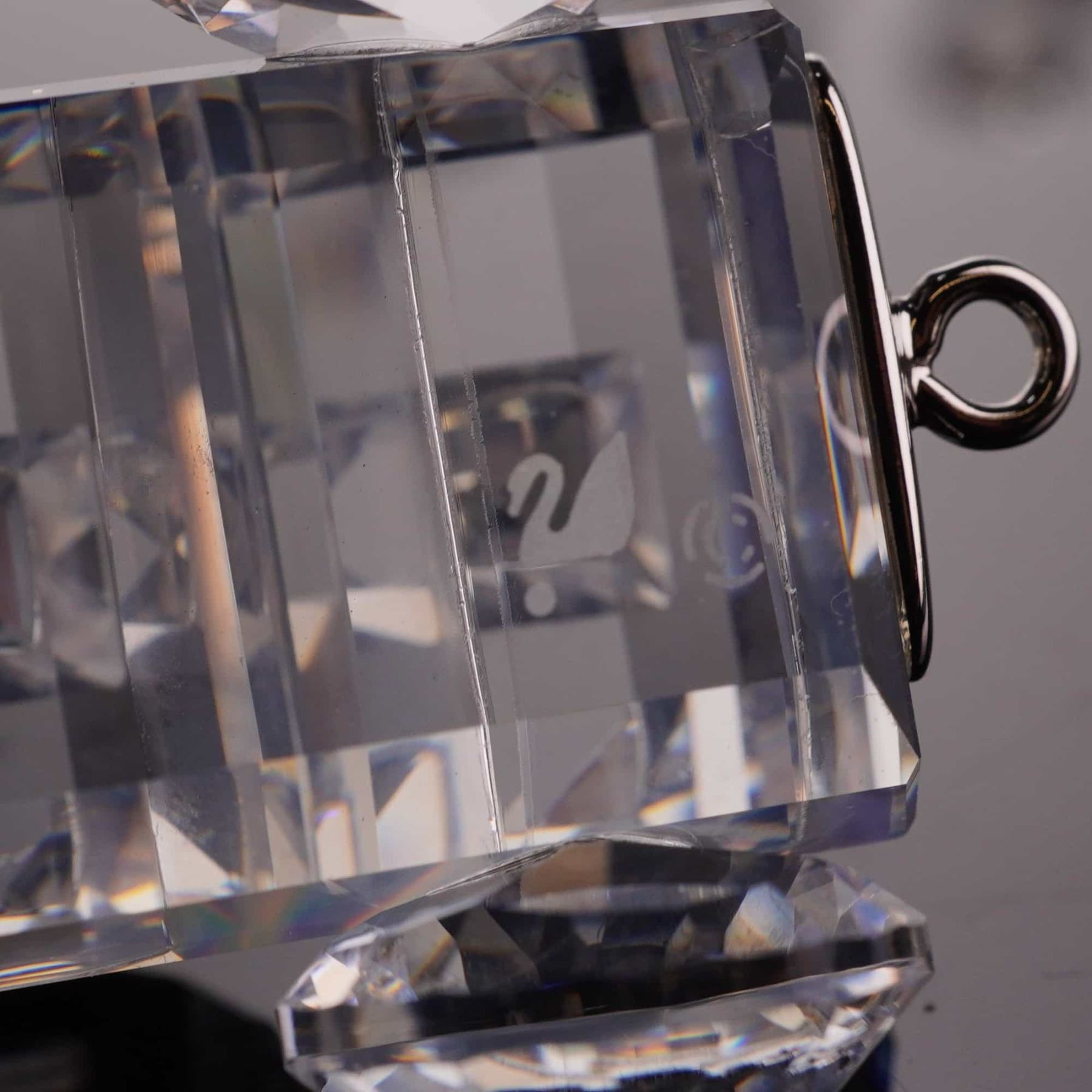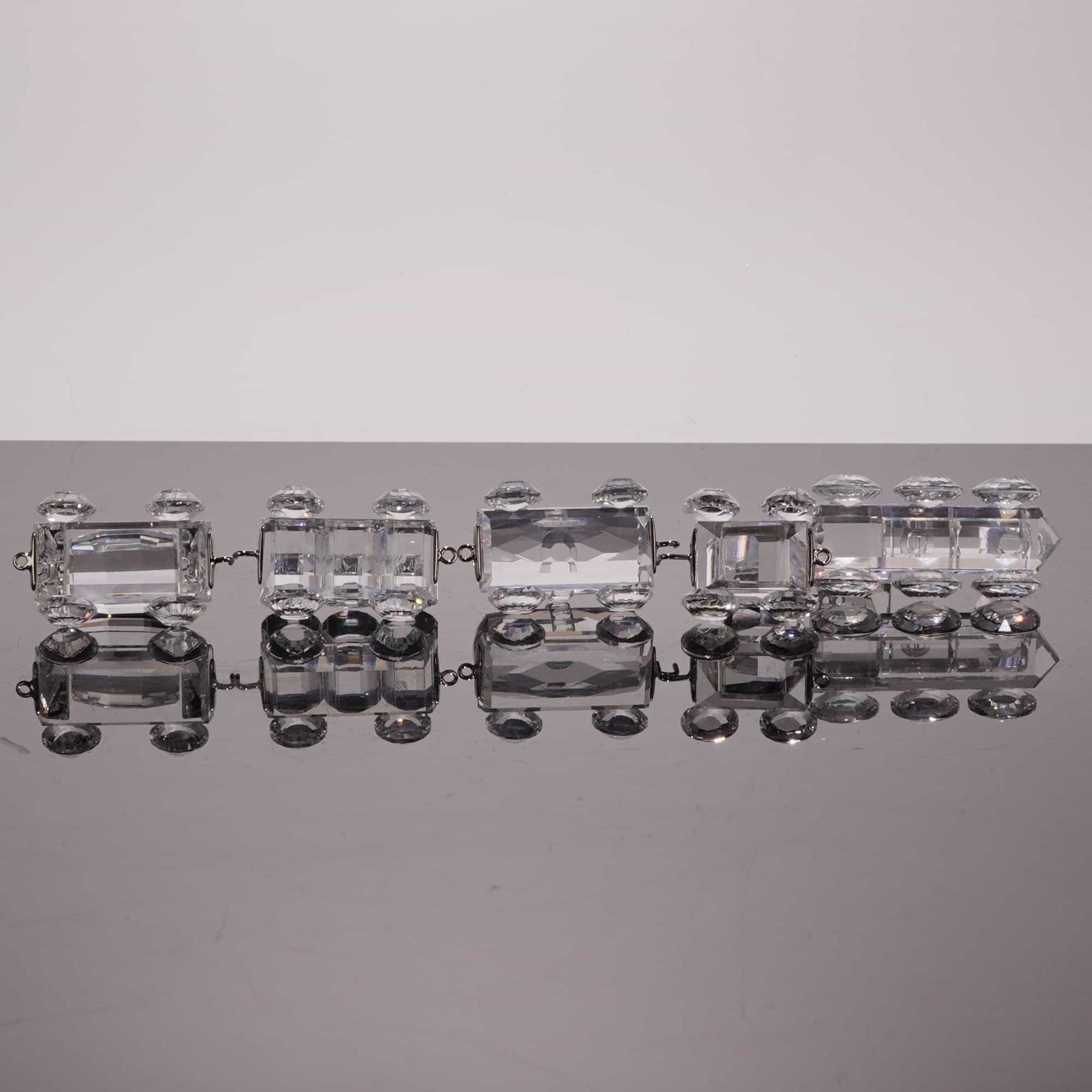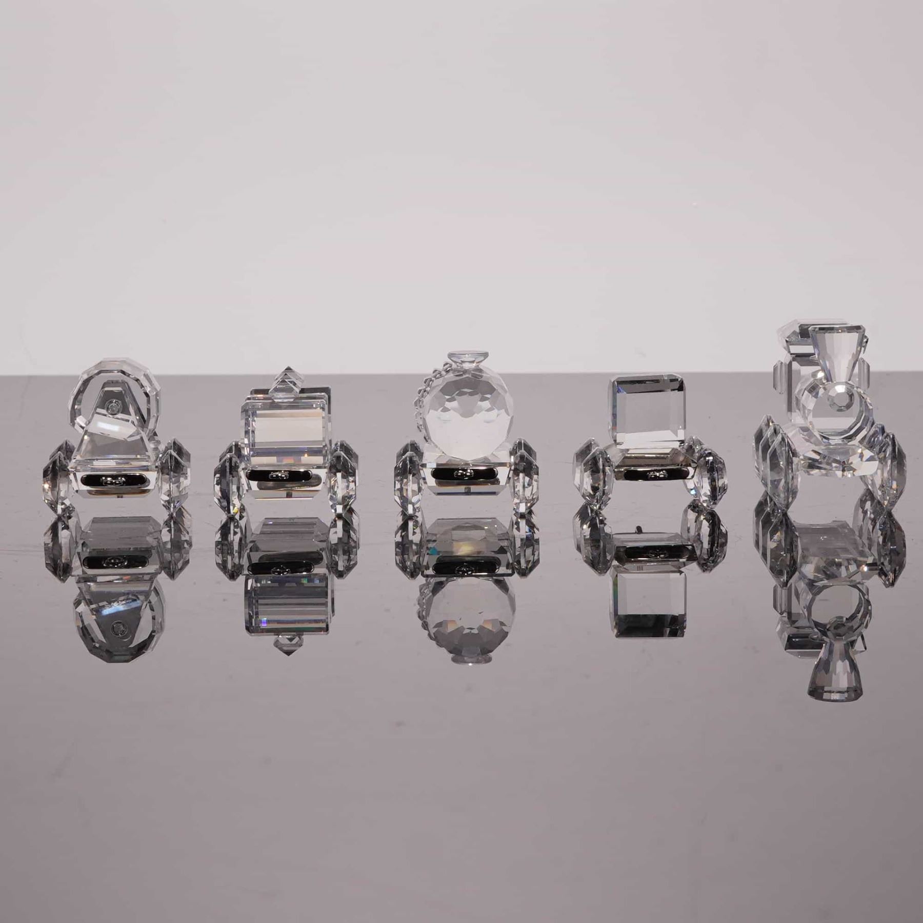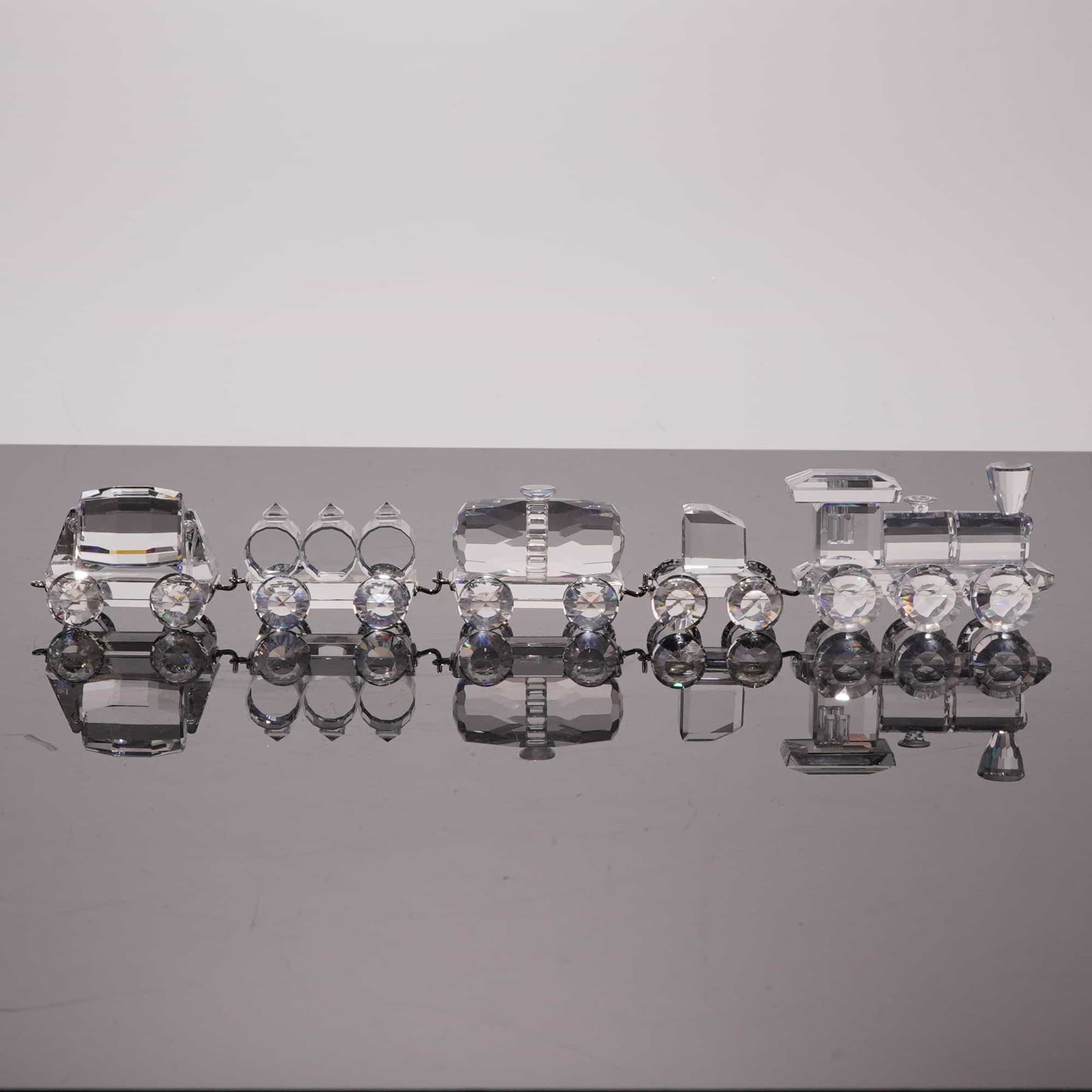 Swarovski. This five-piece miniature train set is from the When We Were Young collection, crafted from faceted lead crystal with silver-tone metal connecting hardware. Each piece features the etched Swarovski swan maker mark. The set includes a locomotive with a faceted boiler and smokestack, a rectangular tender, a tanker car with a spherical tank, a tipping wagon with three faceted containers, and a caboose. All pieces are equipped with multifaceted wheels and connected by silver-tone metal hooks and loops. 8.5 inches.