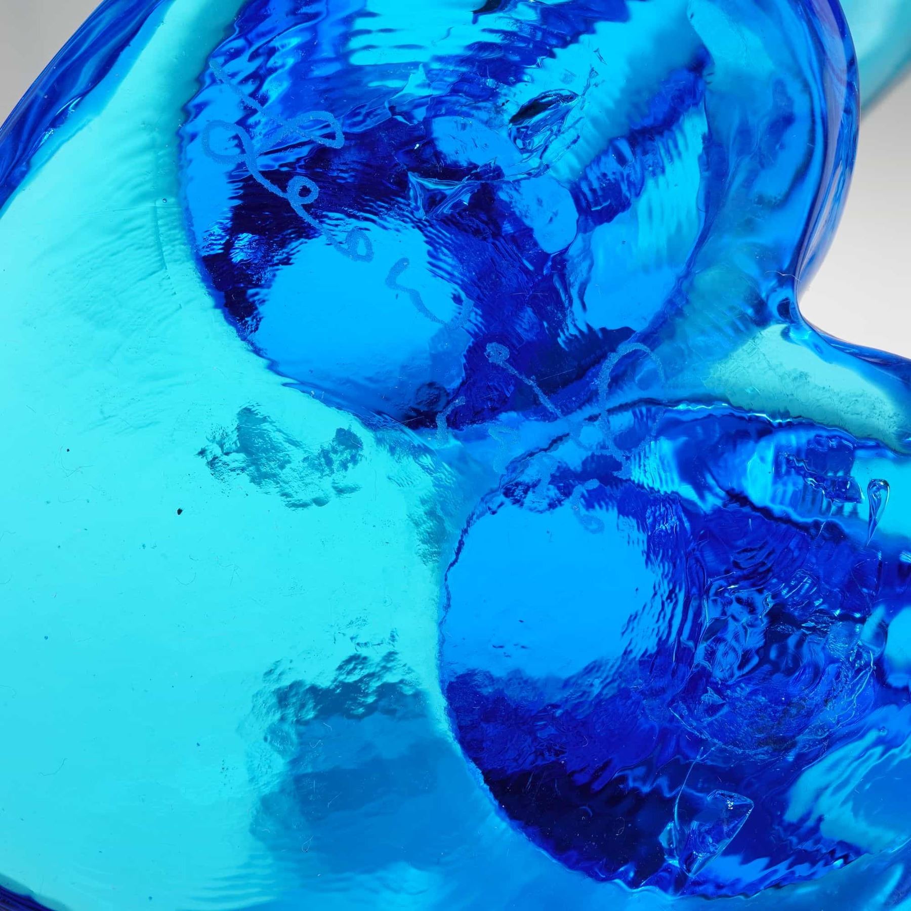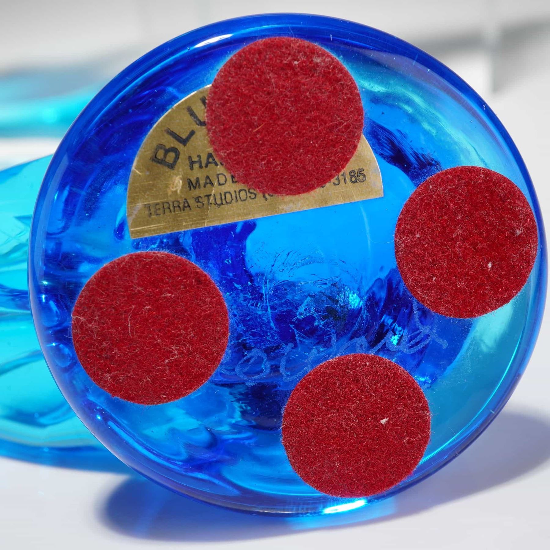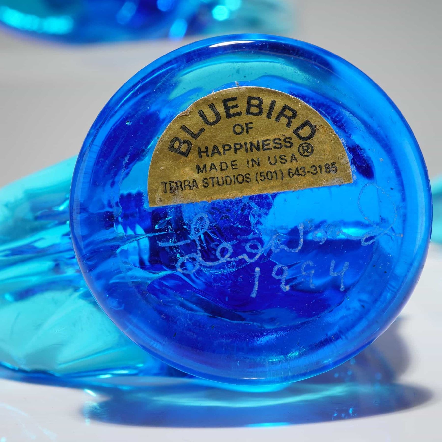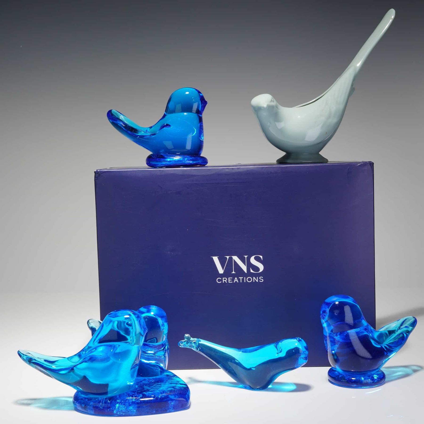 The collection includes four hand-blown art glass pieces from Terra Studios in a vibrant cobalt blue. Among these are two individual songbirds, a pair of birds perched on a single base, and one stylized whale figurine. The glass pieces are part of the Bluebird of Happiness series, with one bird featuring a hand-etched signature for Leo Ward dated 1994. The whale figurine includes a date and initials on the base. Several glass items retain their original gold foil manufacturer labels. Also included is a sleek, stylized ceramic bird by Lenox finished in a pale celadon glaze, bearing the green crown and wreath hallmark on the underside. The lot is accompanied by a navy blue VNS Creations presentation box.