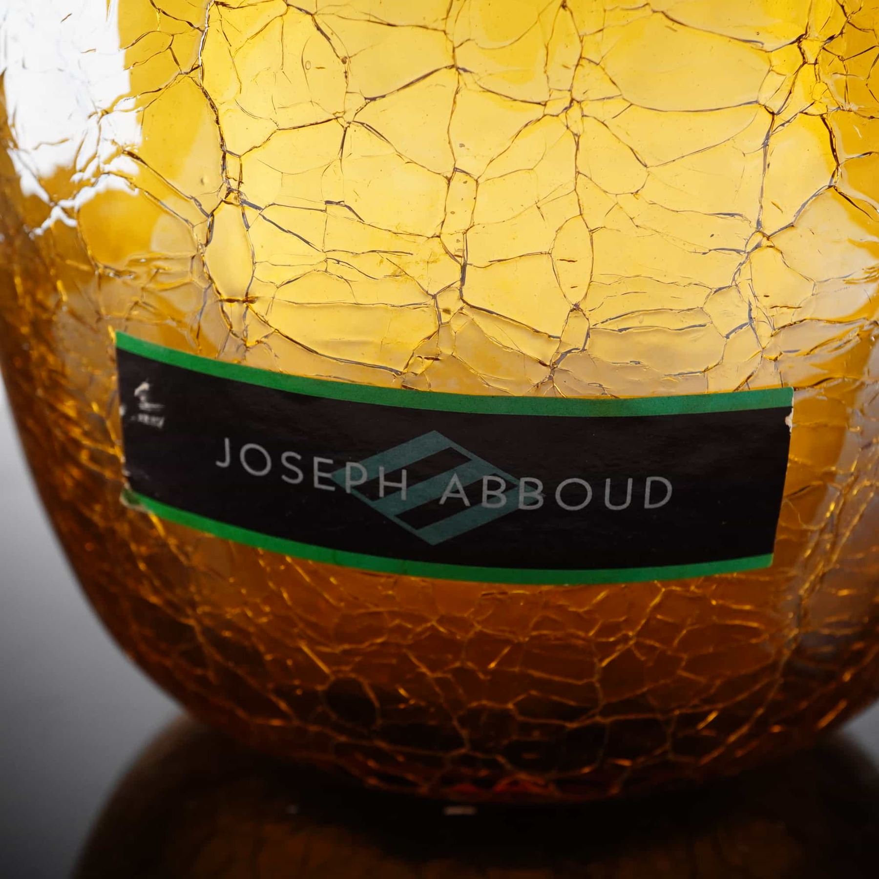 This vessel is rendered in a warm amber color with subtle internal mottling and tonal variations throughout the body. The exterior features a prominent crackle glass technique, which creates a web-like network of fine surface fractures through a thermal shock process during production. The form is a tall cylindrical ovoid with a rounded shoulder and a narrow circular rim. The vase retains its original adhesive brand label near the base with the Joseph Abboud logo in white and green on a black background.