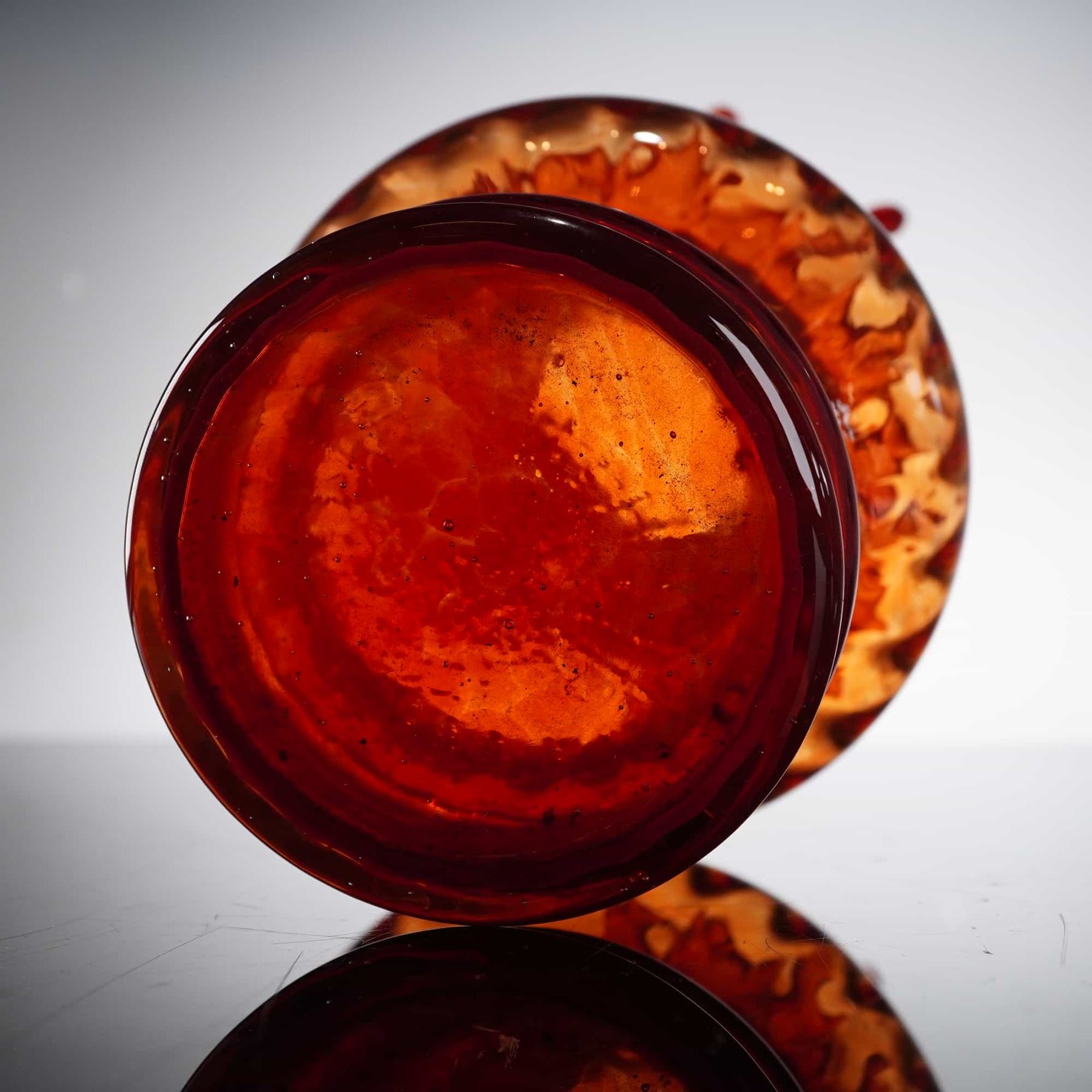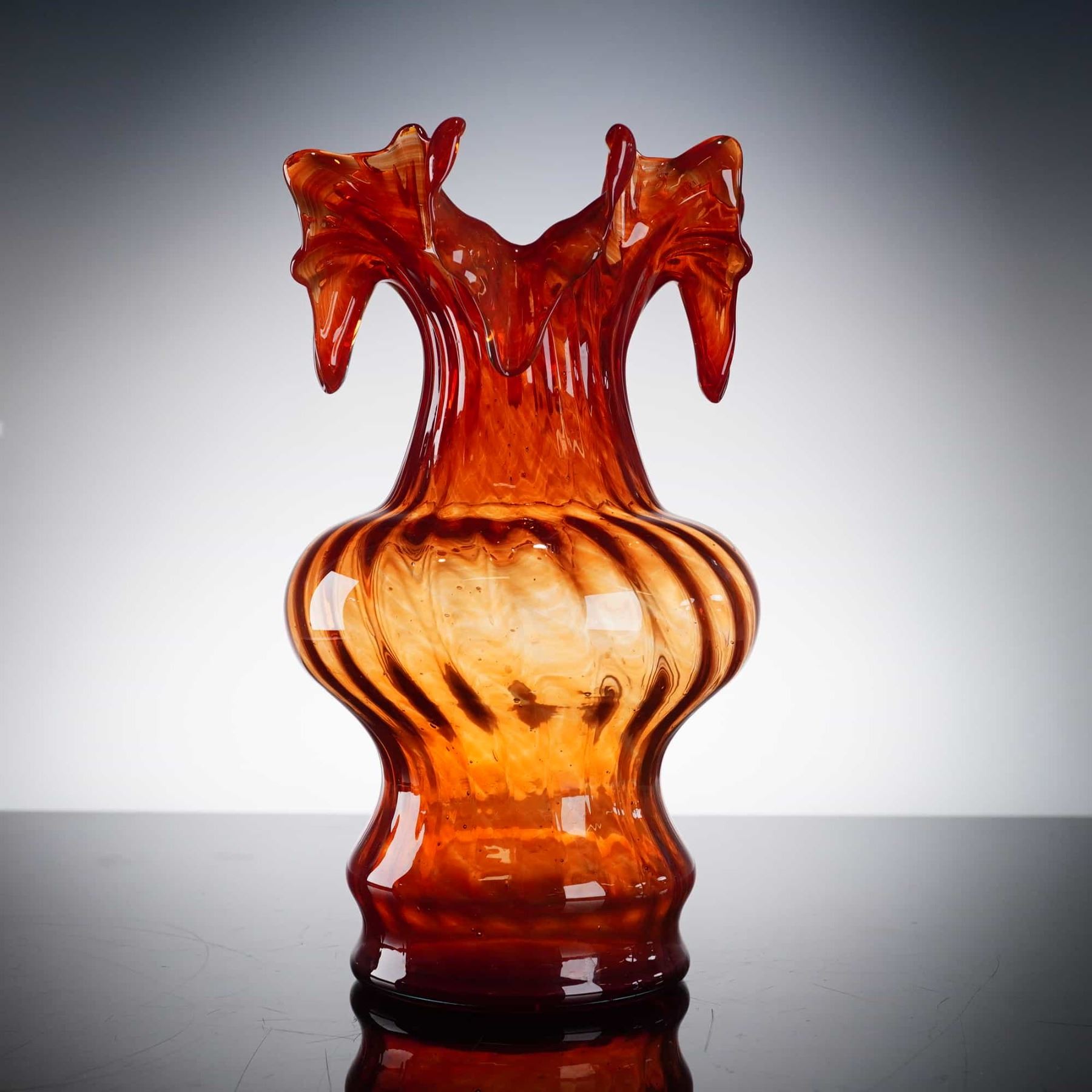 This hand-blown art glass vase features a vibrant orange marbled glass composition with an internal swirl design. The vase exhibits a bulbous ribbed body transitioning into a tall neck topped with a dramatic, hand-manipulated ruffled swag rim. The color palette consists of translucent amber and burnt orange hues with golden-yellow hues.