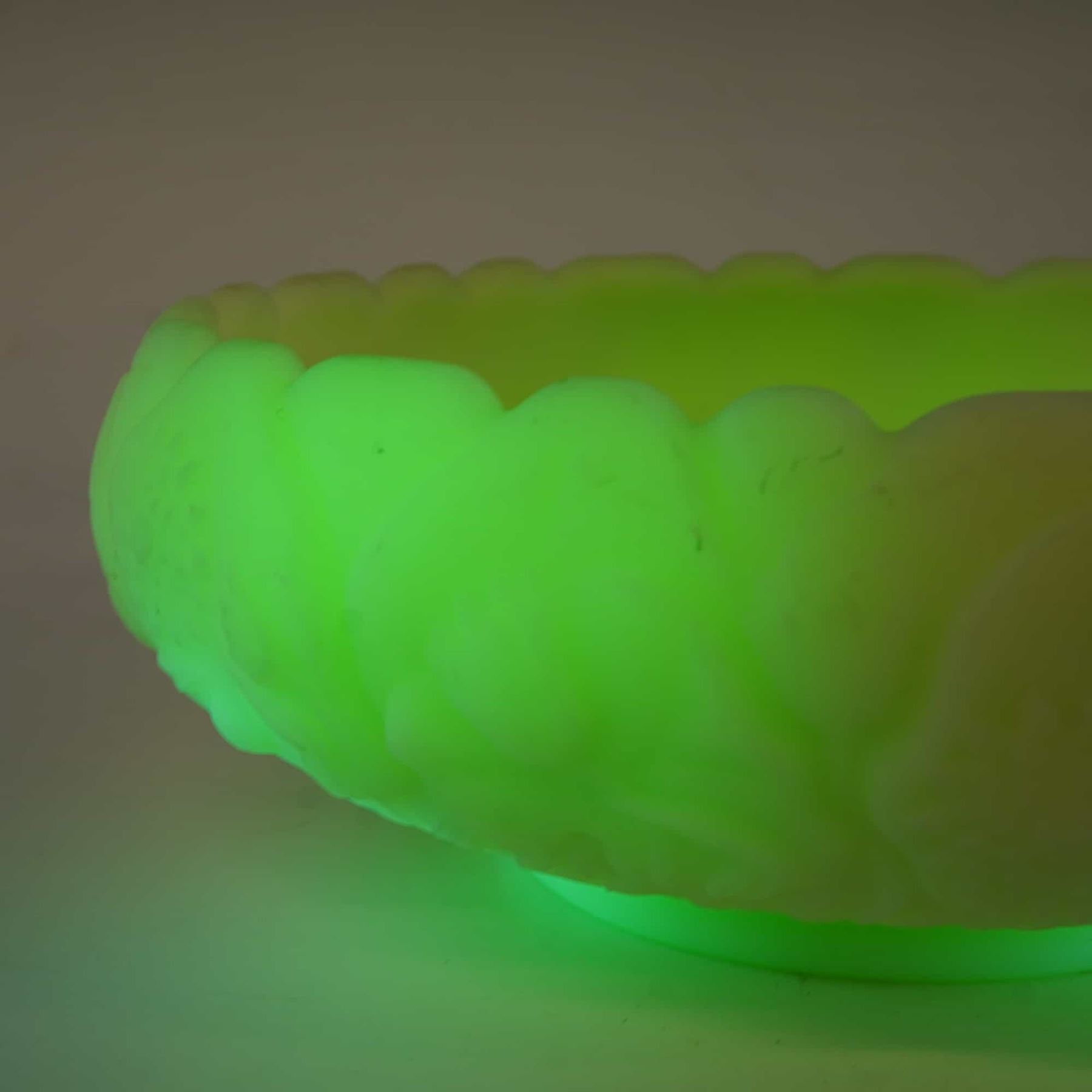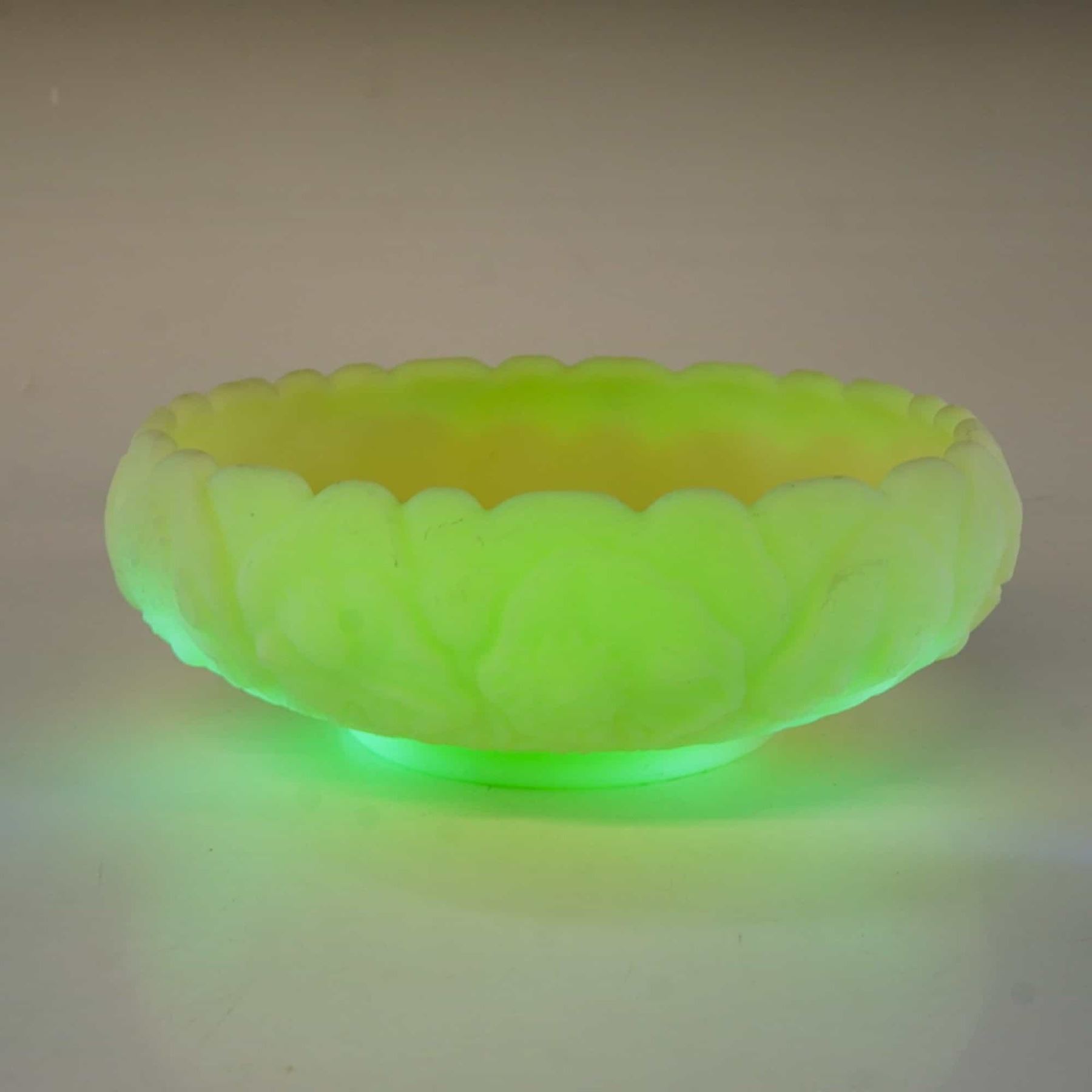 This vintage bowl was manufactured by the Fenton Art Glass Company and features the embossed Water Lily pattern. The piece is made of custard glass, an opaque uranium glass that displays a vivid green fluorescence under blacklight. The glass has been treated with an acid-etched satin finish and features decorative scalloped edges with an inverted rim. As a pressed glass object, it sits on a low, ground collar base and lacks a pontil mark. This pattern and material are characteristic of Fenton mid-20th-century production.