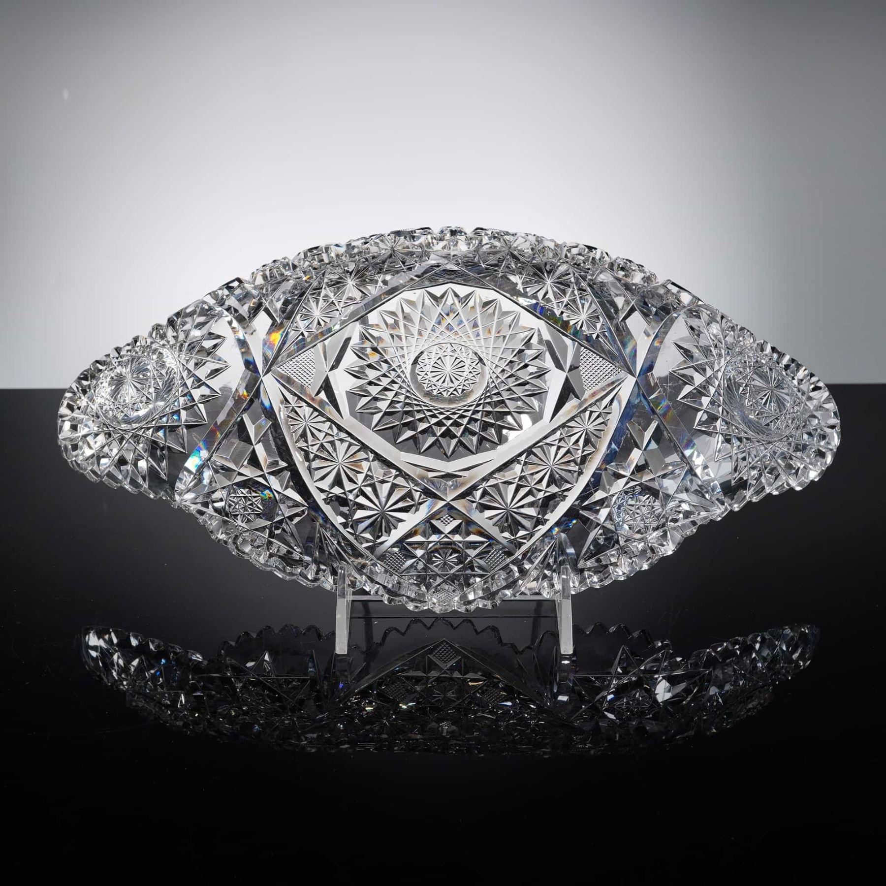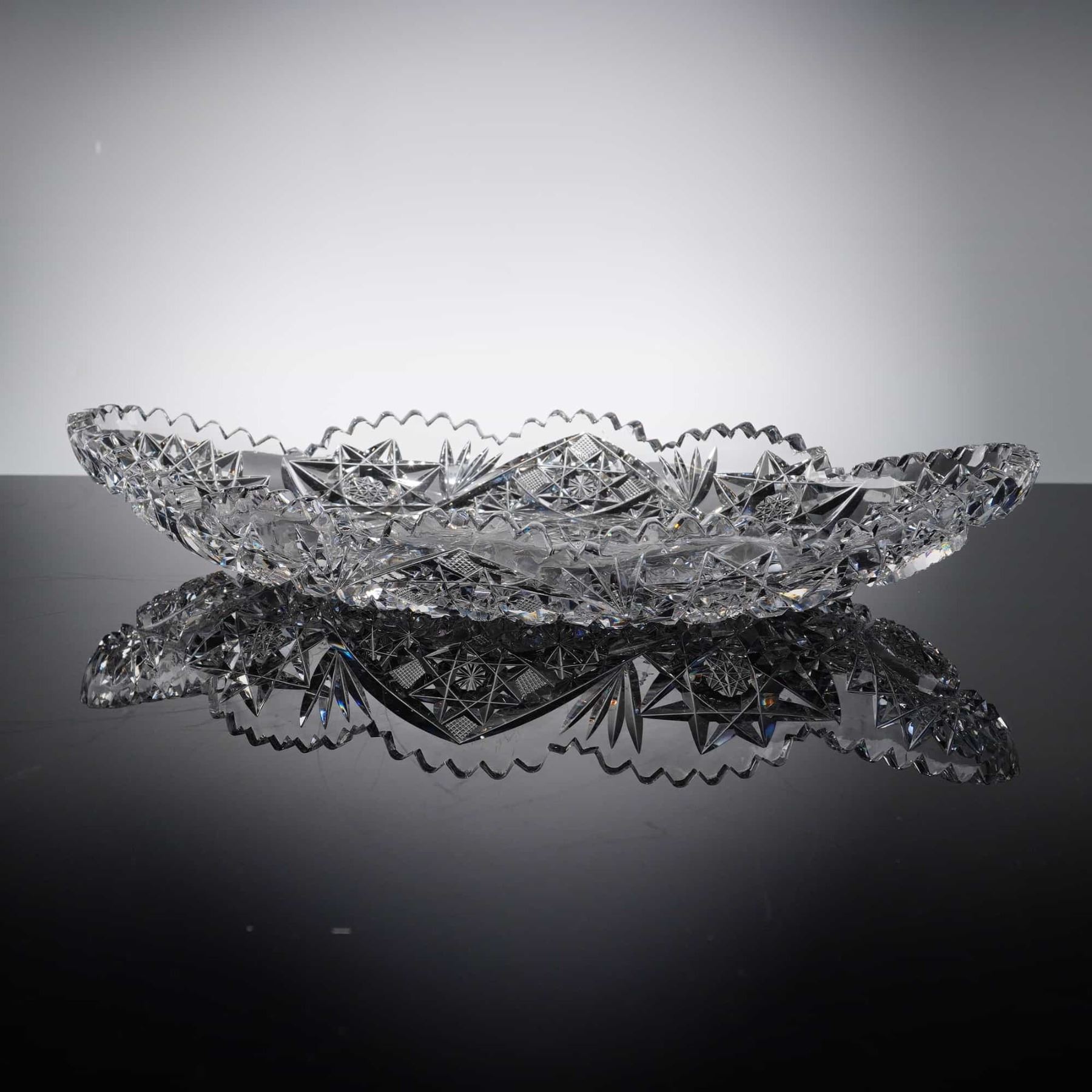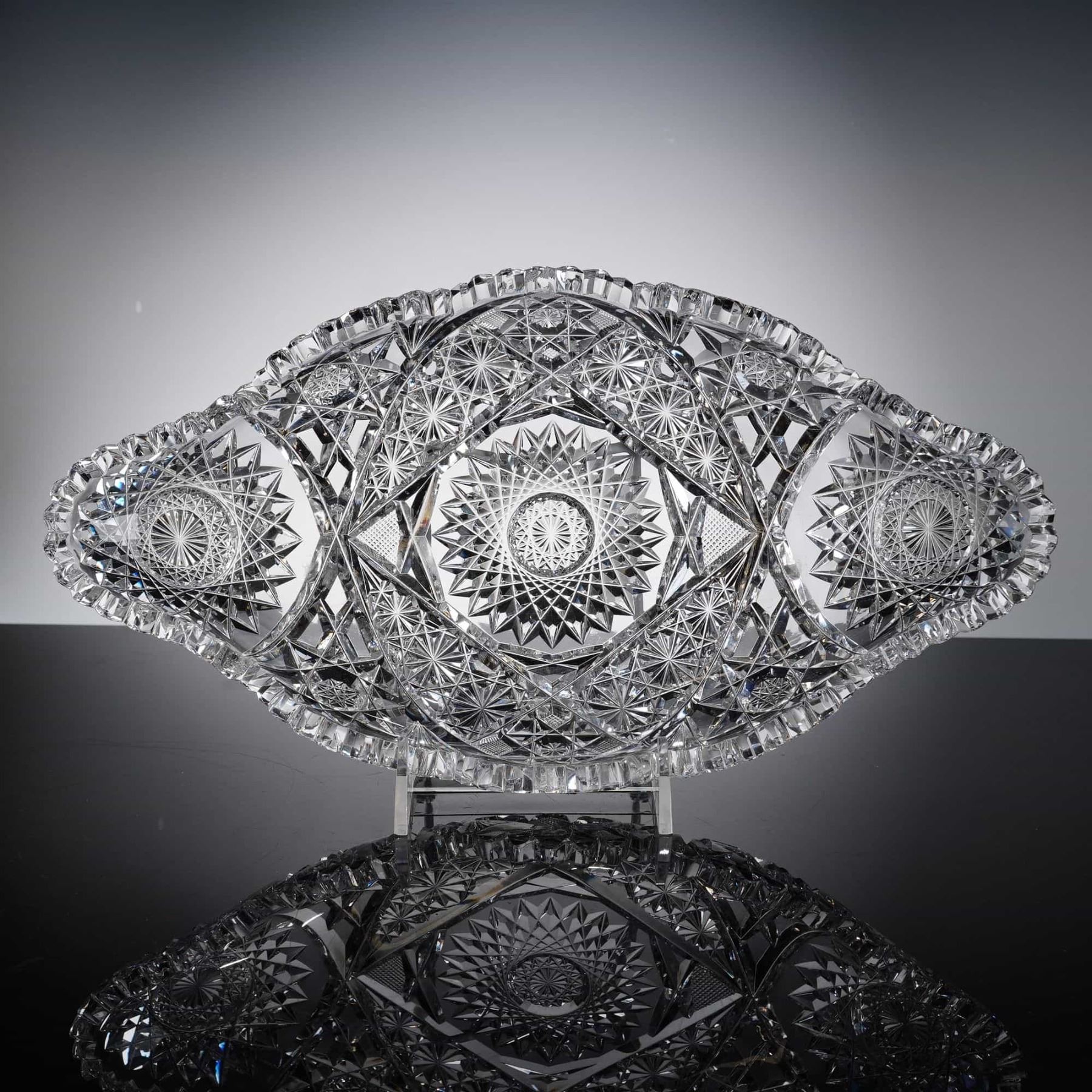 The piece is crafted from high-quality, heavy-gauge lead crystal, which provides significant heft and a brilliant prismatic fire. It features a classic oval navette-shaped profile with a deeply scalloped and serrated rim. The tray displays masterful, complex cutting that covers nearly the entire surface. The central motif is a large, multi-point hobstar, which is flanked by two secondary large hobstars at either end. The design is further enriched with fields of strawberry diamonds, fine cross-hatching, and smaller starbursts, all integrated with deep, sharp mitre cuts.