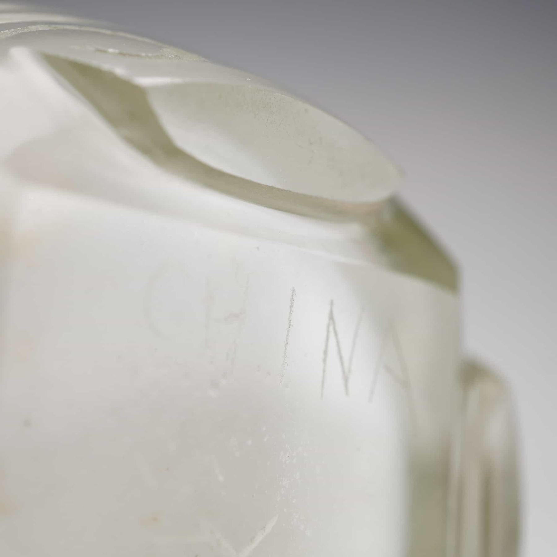 A Chinese reverse painted bottle with stopper, delicately hand-painted from the inside of the glass. The clear glass vessel features a frosted exterior surface and is decorated with a scene of beauties in a garden, depicting elegant female figures amidst a landscape of trees and rocks. The body is further embellished with etched handle attachments on either side in the form of mock lion-masks and rings, while the lower section features carved feet on the base with decorative facets. The underside is incised with the mark CHINA in block letters. The bottle is topped with a faceted clear glass stopper.
