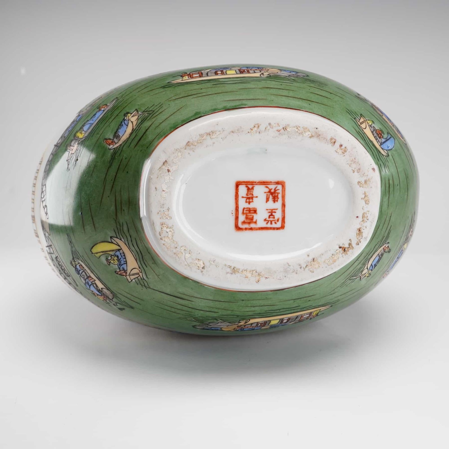Decorated with detailed scenes of the European settlement on Pearl Island in Canton (modern-day Guangzhou), this vase captures a rare historical subject. The imagery includes European-style buildings flying American, British, and French flags, alongside figures in Western dress, Chinese merchants, and local boatmen. During this period, Chinese access to the island was restricted to daylight hours only. The base bears a mark reading "Fu gui tan zhi" ("Made in Fuguitan Hall").