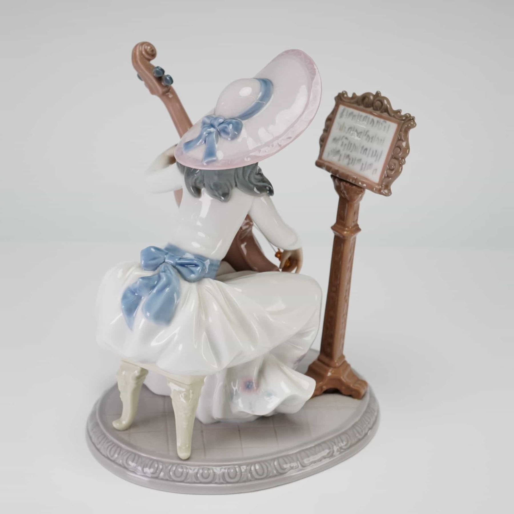 Depicting a seated young woman playing a cello. The figure is dressed in a flowing white gown with a blue sash and bow at the back, wearing a wide-brimmed pink hat accented with a blue ribbon. The scene includes a separate rococo-style music stand, and both the figure and stand are mounted on an integral oval base featuring a low-relief egg-and-dart border. The underside of the base bears the blue underglaze Lladro factory mark.