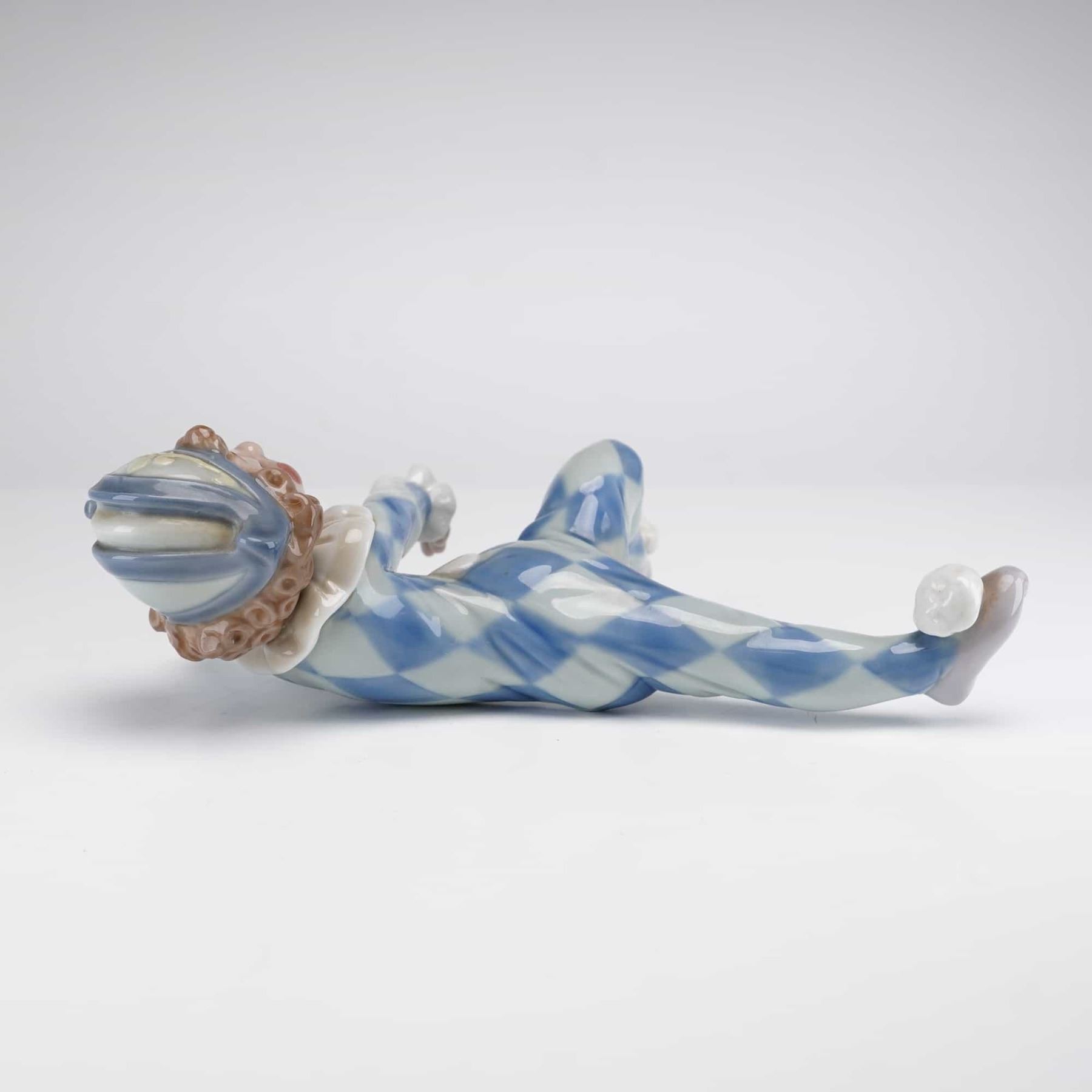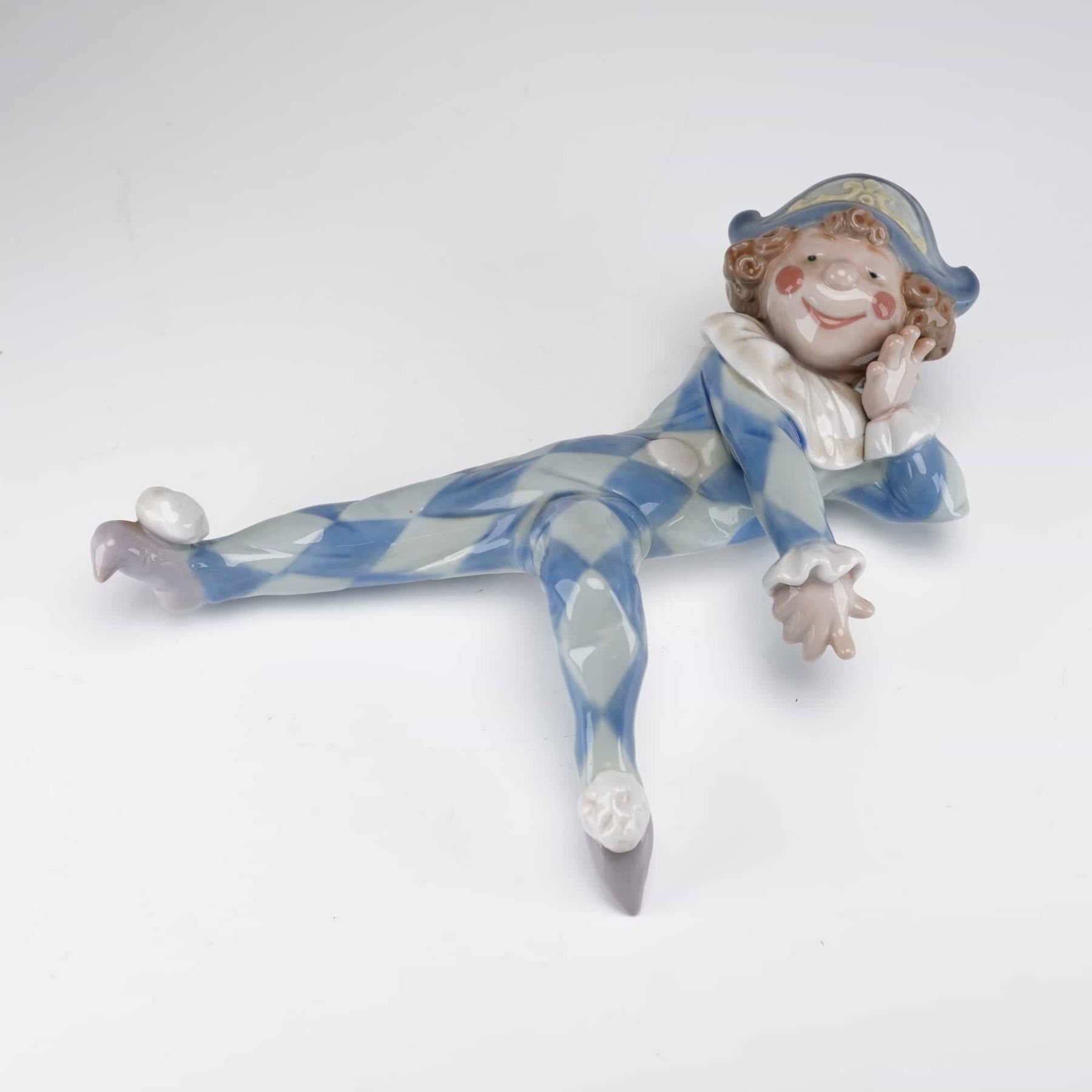 This piece depicts a youthful jester in a contemplative reclining pose, designed as a shelf-sitter. The character is dressed in a traditional harlequin jumpsuit with a pale blue and white diamond lozenge pattern, complemented by a ruffled white collar and a matching bicolor bicorn hat. The figurine is finished in the signature Lladro high-gloss glaze and soft pastel color palette. The underside displays the standard underglaze blue Lladro factory backstamp.