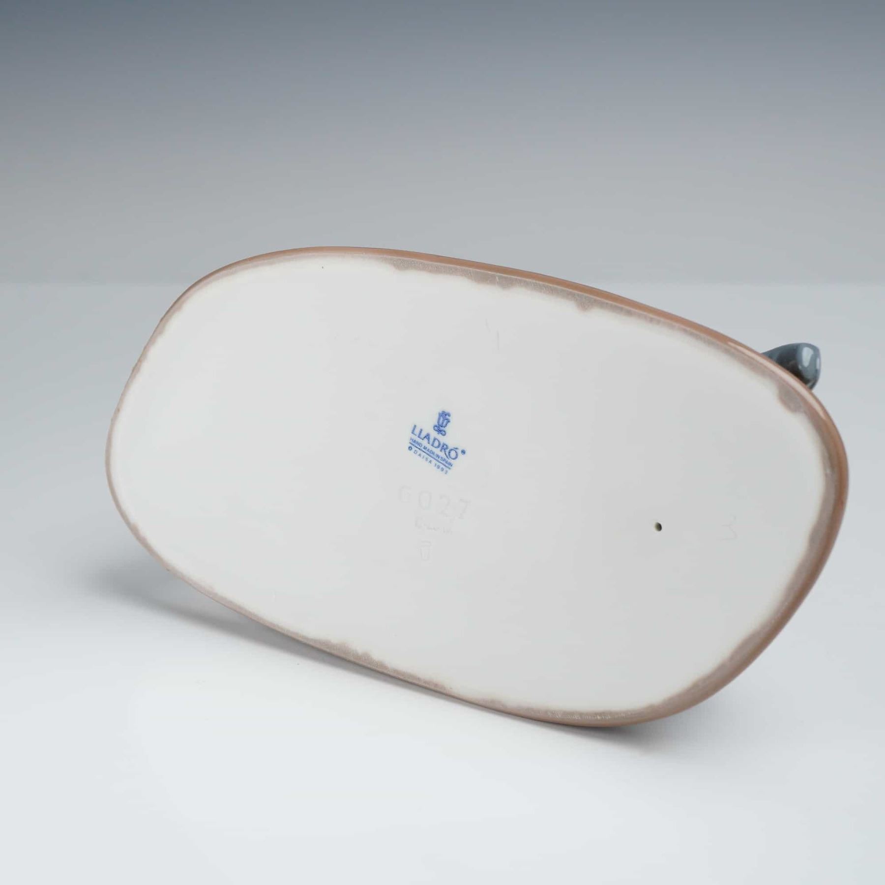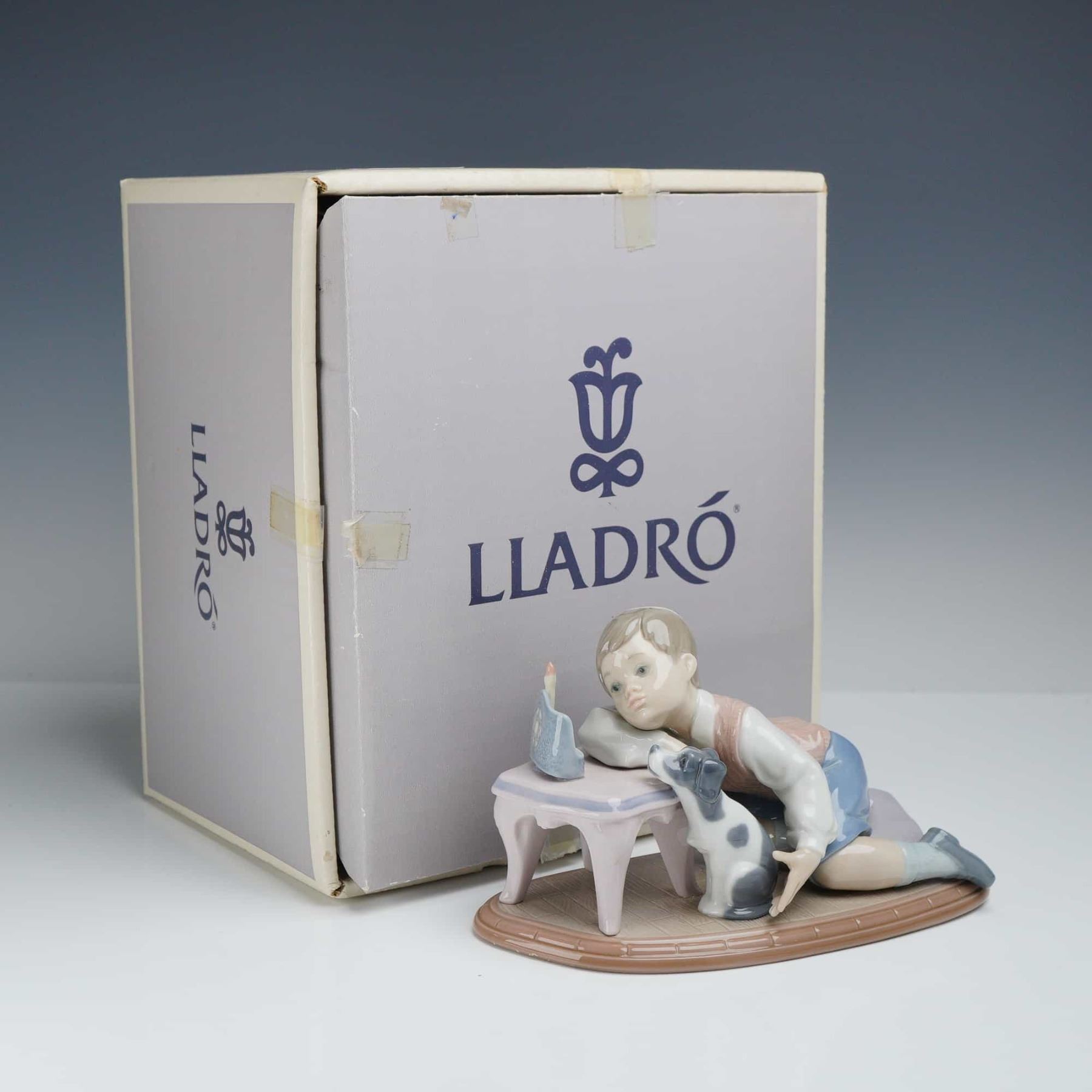 This Lladro porcelain figurine, titled Hanukkah Lights and also known as Festival of Lights, was designed by sculptor Joan Coderch and issued in 1993. The polychrome glazed piece depicts a young boy wearing a white kippah kneeling and resting his head on a small side table. He is shown observing a Hanukkah menorah with one lit candle while a spotted dog sits beside him. The scene is set upon an oval base featuring an incised wood-grain pattern. The underside of the base bears the blue Lladro bell-shaped logo and is marked Hand Made in Spain and © DAISA 1992. It also features the incised model number 6027 and characters D-23 M. The figurine is accompanied by its original Lladro branded cardboard box.