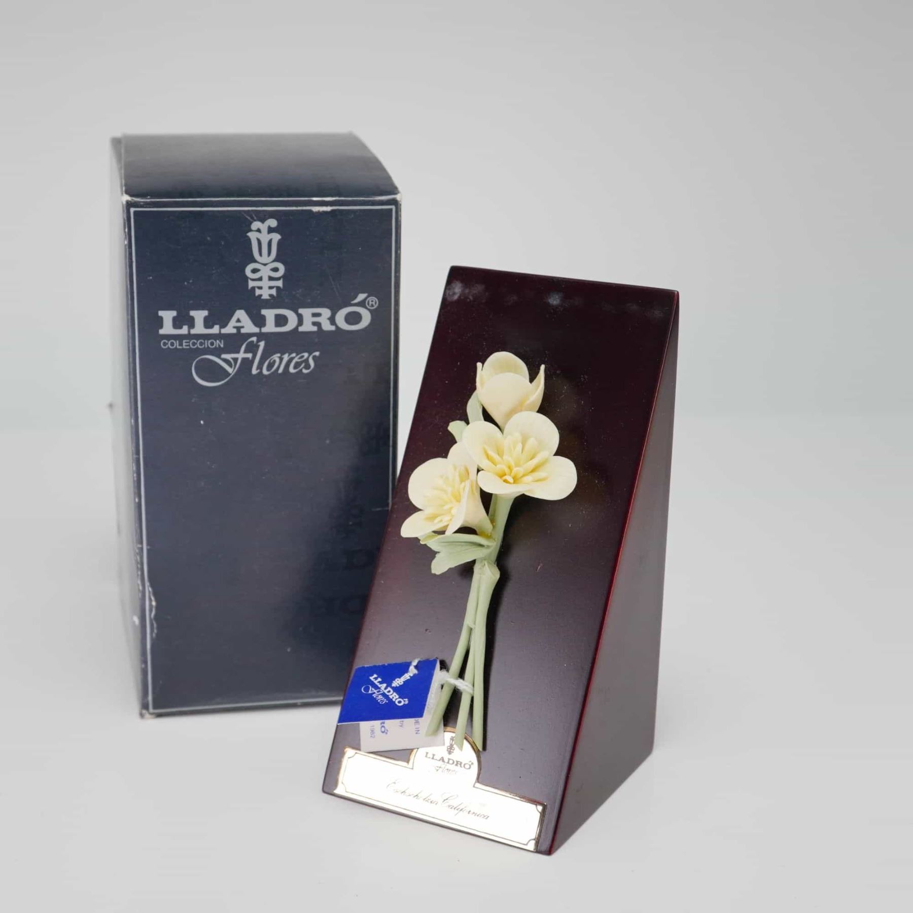 This porcelain floral sculpture is part of the Lladro Flores collection and depicts three California poppies, in various stages of bloom. The flowers are rendered in a pale yellow matte porcelain with light green stems and foliage. The arrangement is mounted to a wedge-shaped wooden base featuring a dark mahogany-toned finish. A gold-tone metal plaque is inset into the front of the wooden base, bearing the Lladro brand name, the Flores collection title, and the cursive inscription Eschscholzia Californica. The sculpture retains its original blue and white paper hanging tag, which specifies the manufacturer as Lladro. The item is accompanied by its original blue cardboard box, which displays the Lladro bell logo and the words Lladro Coleccion Flores.