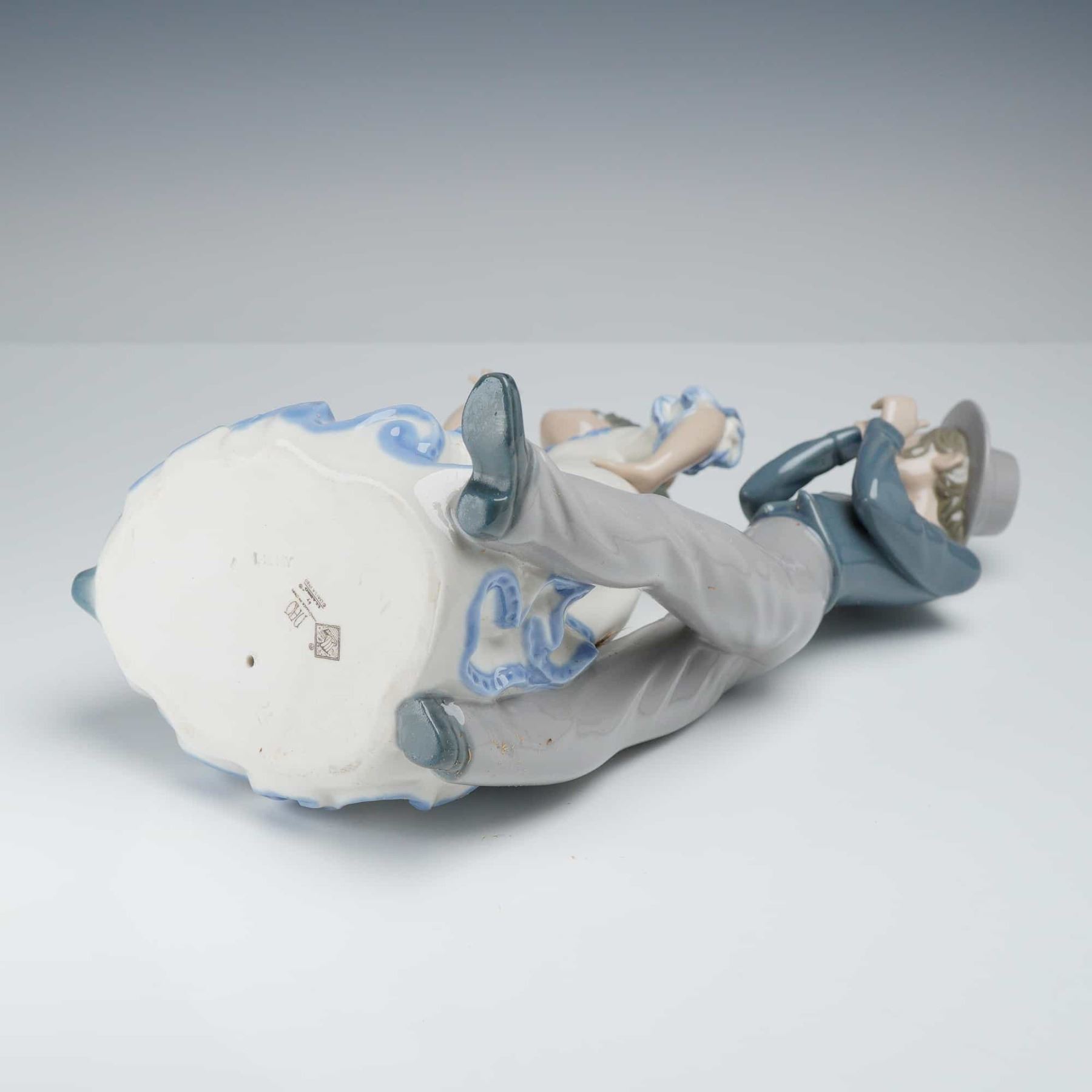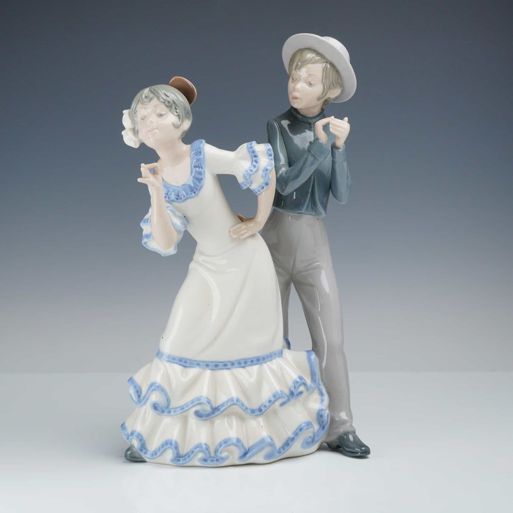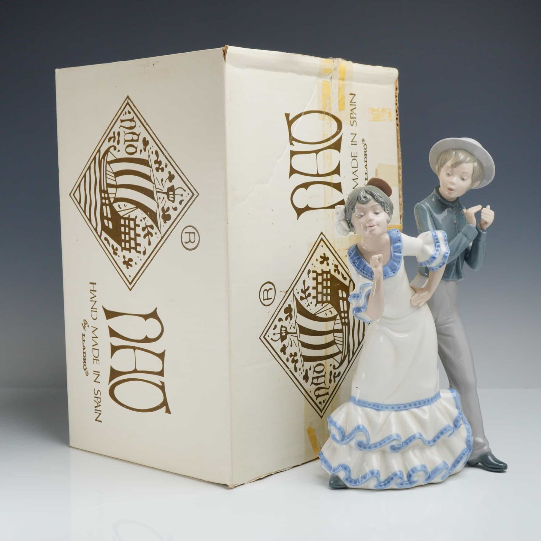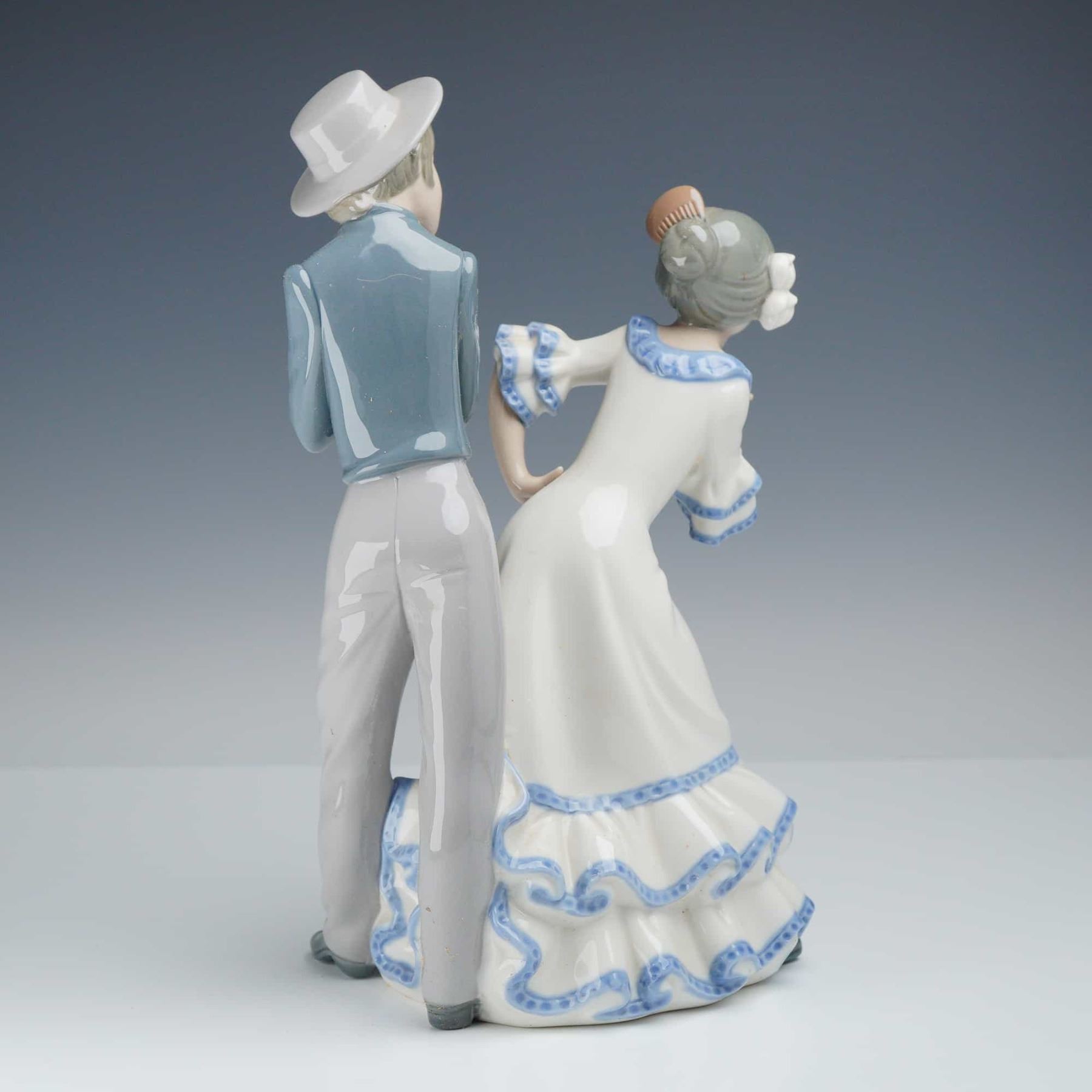 NAO by Lladro Gipsy Group polychrome glazed porcelain figurine. This piece depicts a young couple in traditional Spanish attire. The female figure is shown in a dancing pose, wearing a white dress with tiered ruffles accented in blue, a traditional peineta hair comb, and a white flower. The male figure stands behind her wearing a gray hat, a blue shirt, and gray trousers, with his hands positioned as if performing palmas. The base features a brown printed backstamp with a sailing ship in a diamond border, the letters NAO, and the text Handmade in Spain by Lladro. Incised marks on the base include D-20 MY, an impressed square, and the number 12. The item is accompanied by its original branded cardboard box.
