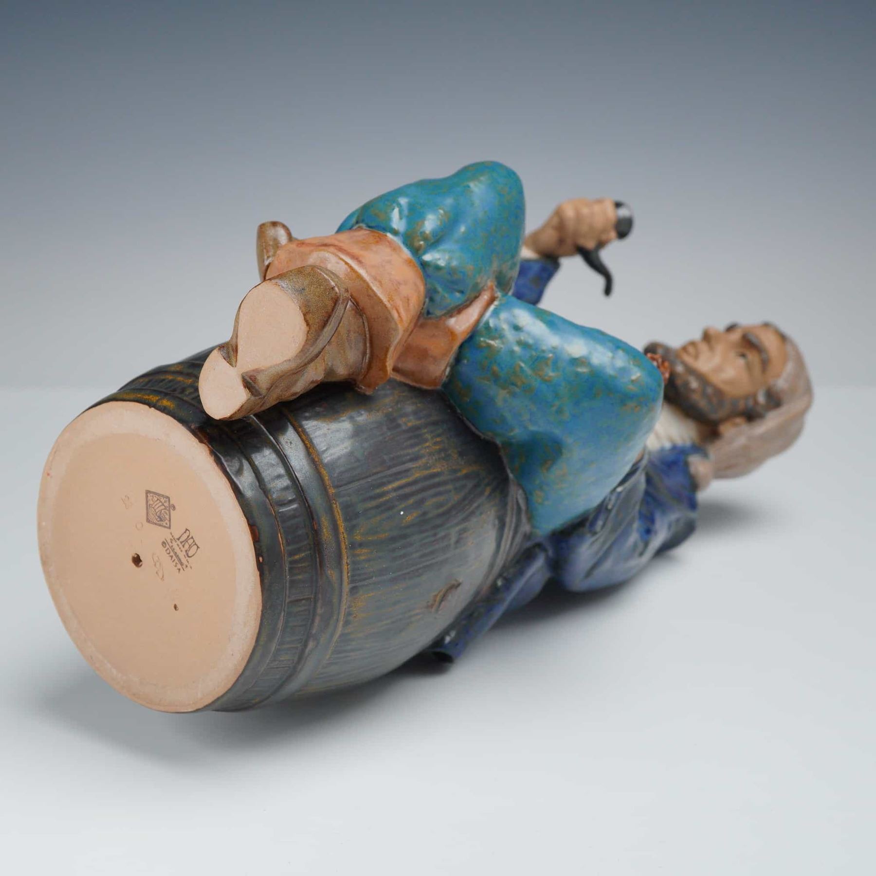 This ceramic figurine, produced by Nao, a brand of the Lladro group, depicts an elderly fisherman or sailor in a contemplative pose. The figure is seated atop a dark brown barrel featuring simulated wood grain and a relief-molded label on the front reading MADE IN ESPAÑA. The character is portrayed with a full beard and a tan nightcap, wearing a long mottled blue coat with a crystalline-style glaze over teal-colored trousers and brown boots. He holds a black pipe to his lips with his right hand and a small brown tobacco pouch in his left. The piece is finished in the matte, textured stoneware glaze characteristic of the Nao Gres collection. The underside of the base features a blue printed backstamp with the Nao bellflower logo, the name NAO, HAND MADE IN SPAIN, and the copyright © DAISA 1983. Incised marks B - 3 J and the number 23 are also present on the base, along with a circular ventilation hole from the firing process.