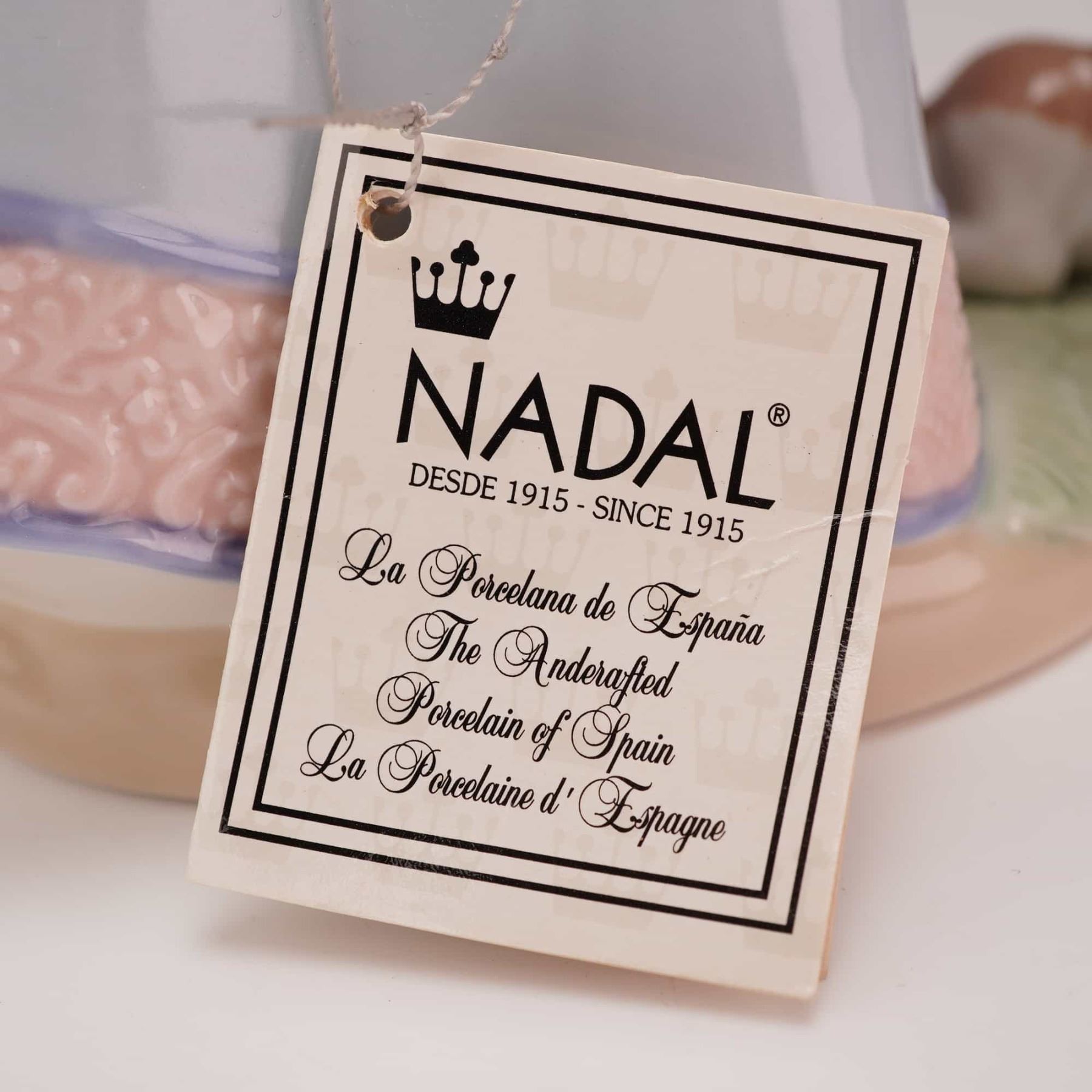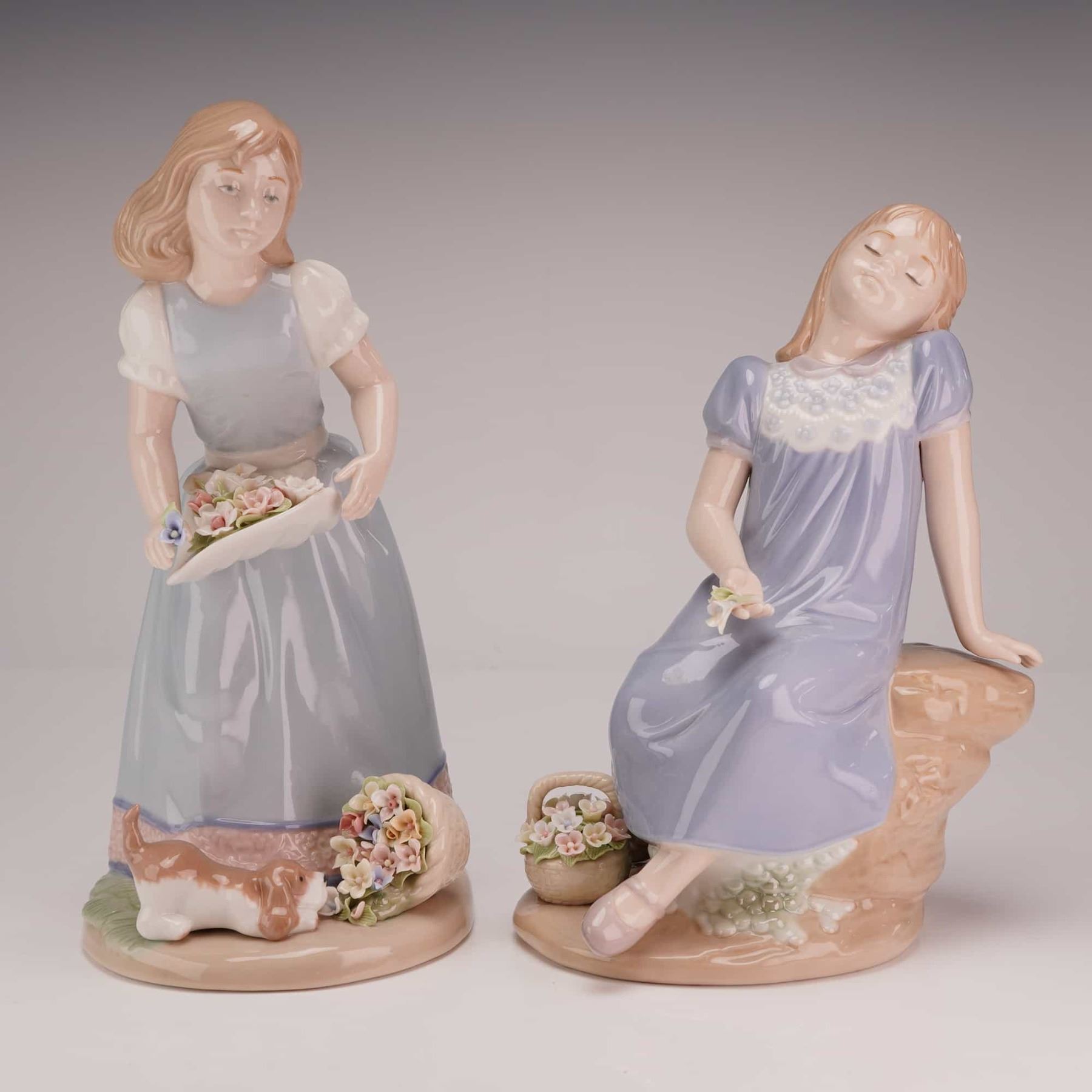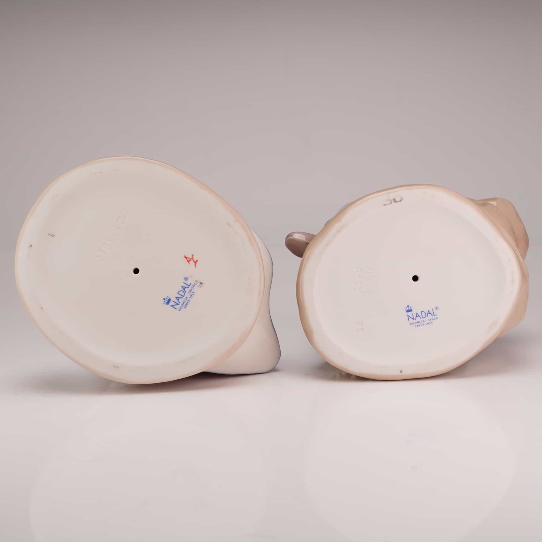 This pair of glazed porcelain figurines is produced by the Nadal factory in Valencia, Spain. The collection consists of two sentimental studies of young girls decorated with hand-applied floral elements. The standing figure depicts a girl in a pale blue dress and white apron holding a shallow basin filled with blossoms, with a small dog and an overturned basket of flowers at her feet. The base of this figurine features the incised model number 2385. The seated figure represents a girl in a lavender-blue dress resting on a rocky outcropping, holding a single flower with a small basket of flowers at her side. The base of the seated figure is incised with model number 2549. Both figurines bear the blue printed manufacturer mark featuring a crown above the word NADAL and the text Valencia - Spain Since 1915.