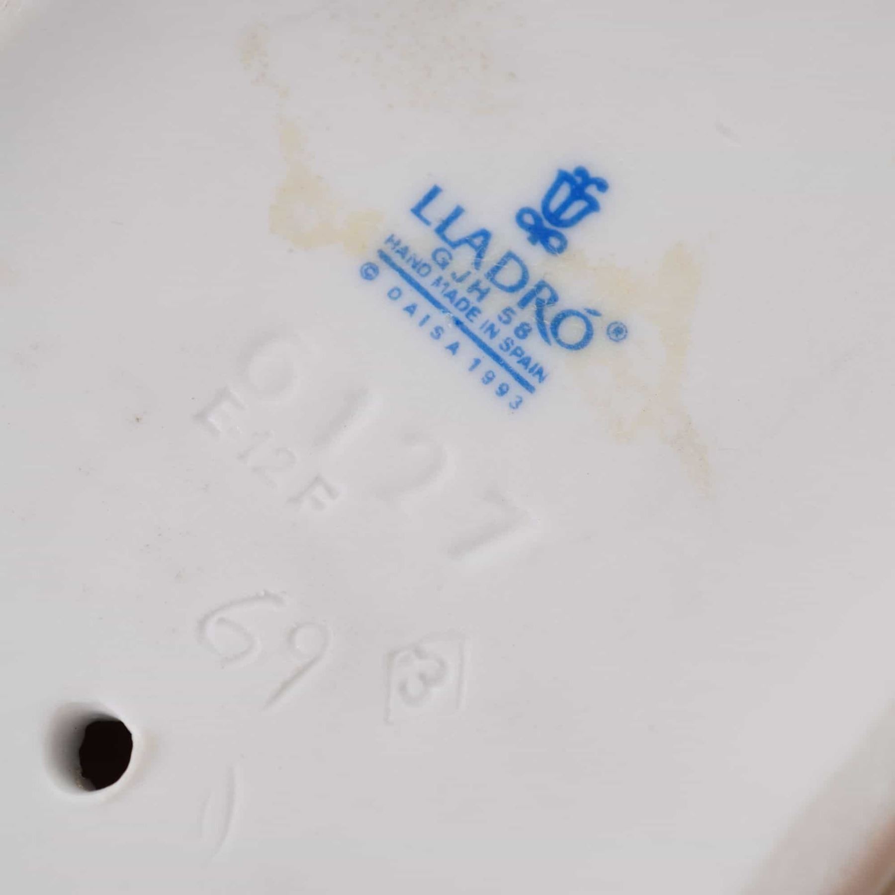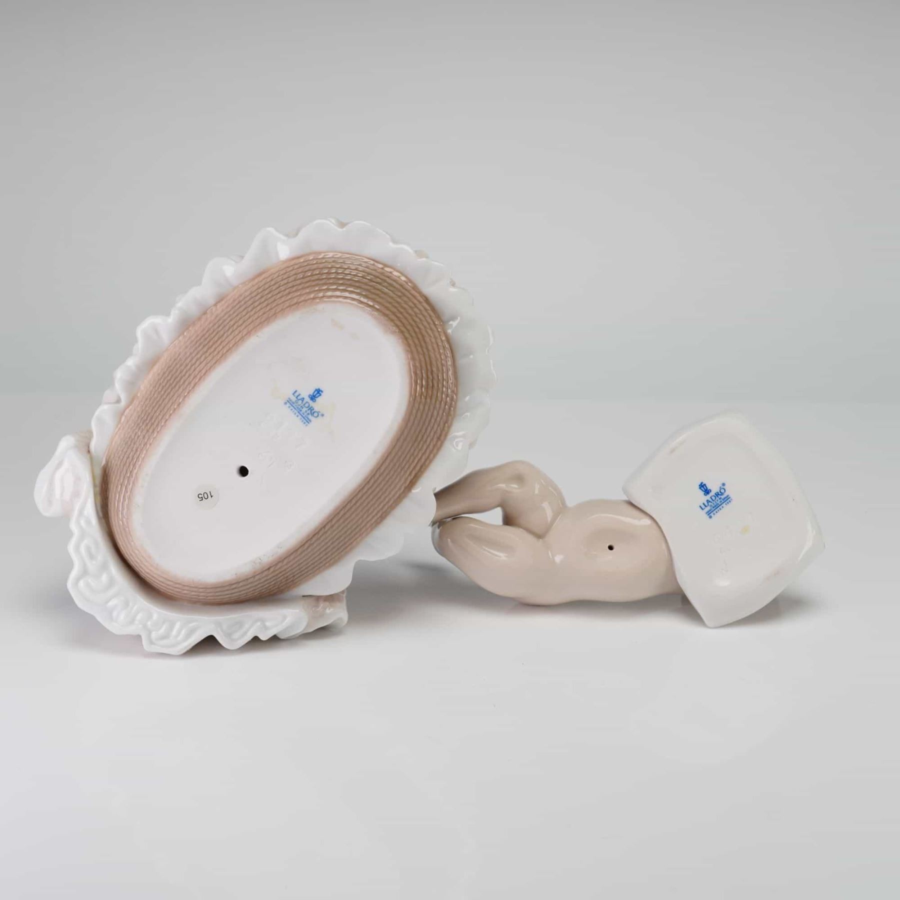 This lot features two glazed porcelain figurines from the manufacturer Lladro. The first figurine is titled Sweet Dreamers, model number 6127, and depicts two infants sleeping in a frilled bassinet with a canopy and pink bow. The infants are wrapped in pastel blue and pink blankets. The base is marked with a blue stamped Lladro bell logo, Hand Made in Spain, and copyright Daisa 1993. The second figurine is titled Sleepytime, model number 6497, and shows a single nude infant sleeping on its stomach on a white pillow. The base features the blue stamped Lladro bell logo, Hand Made in Spain, and copyright Daisa 1997, with the incised number 6497.