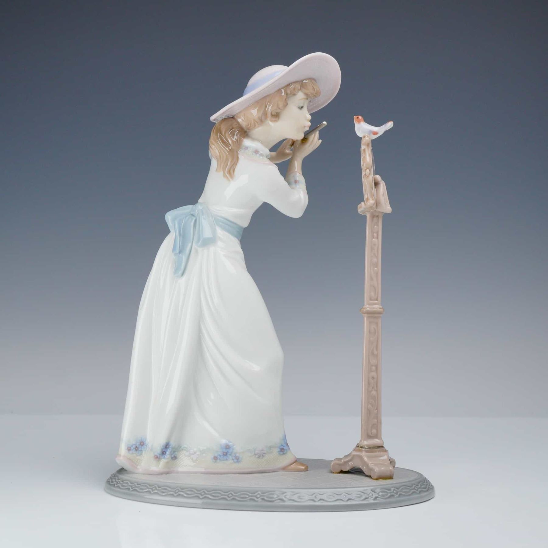 This Lladro porcelain figurine, titled Songbird and identified by model number 6093, depicts a young woman in Edwardian-style attire. The figure is dressed in a white gown with a blue waist sash and a floral-patterned hem, wearing a wide-brimmed hat with a blue ribbon. She is posed leaning toward a music stand, playing a small flute to a bird perched on the stand. The music stand includes molded details of a musical score. The figurine is mounted on an oval base with a grey-toned molded floral pattern. The underside of the base bears the blue printed Lladro bell mark, Hand Made in Spain, and copyright DAISA 1993. This item includes its original box.