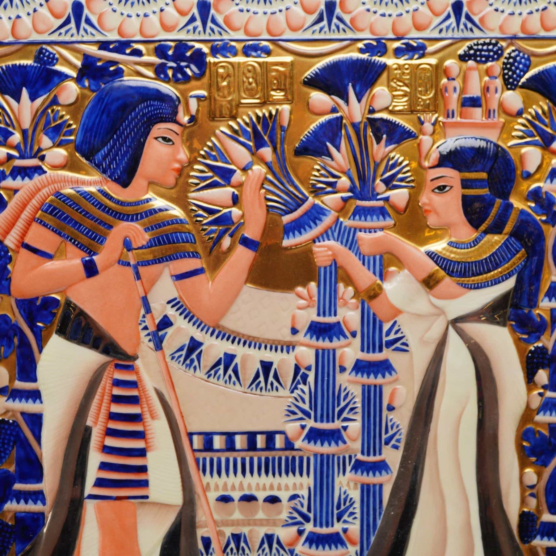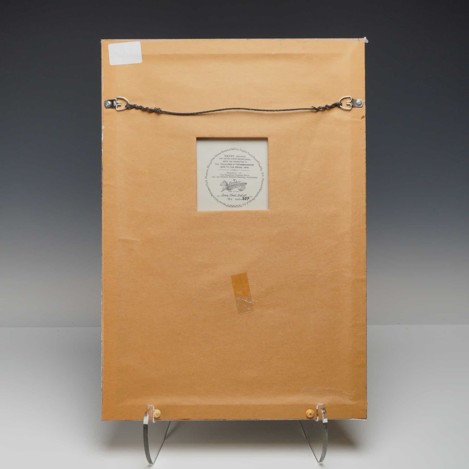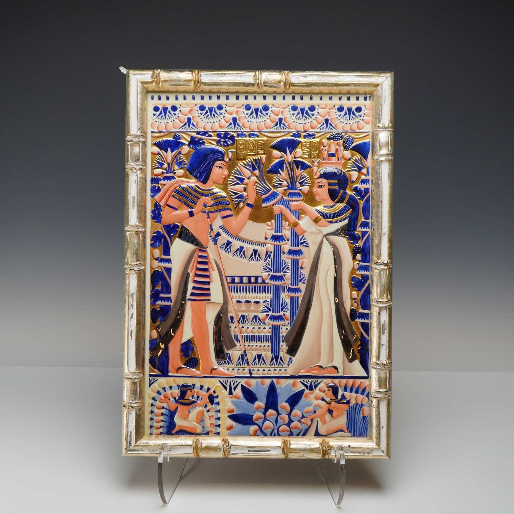 This fine porcelain plaque was produced by the Edward Marshall Boehm studio to commemorate the landmark exhibition Treasures of Tutankhamun which toured the United States between 1976 and 1979 in celebration of the American Bicentennial. Titled Ivory Chest Relief, the rectangular plaque features high-relief molding depicting a male and female royal figure in traditional Egyptian attire interacting with stylized papyrus plants. The decoration utilizes polychrome glazes in shades of cobalt blue, terracotta, and cream, accented with extensive gilding. The plaque is presented in a contemporary faux bamboo-style silver-gilt frame. The reverse of the plaque is visible through a circular window in the paper backing and bears extensive inscriptions. The perimeter lists the hosting museums: National Gallery, Washington; Field Museum, Chicago; New Orleans Museum of Art; Los Angeles County Museum; Seattle Art Museum; and Metropolitan Museum of Art. The central text reads: Egypt Salutes the United States Bicentennial with the Exhibition of the Treasures of Tutankhamun 1976 to the Spring 1979. It further includes the Boehm maker mark with a stylized horse head and feather quill, the name Edward Marshall Boehm, and is marked Issue Limited Number 207.