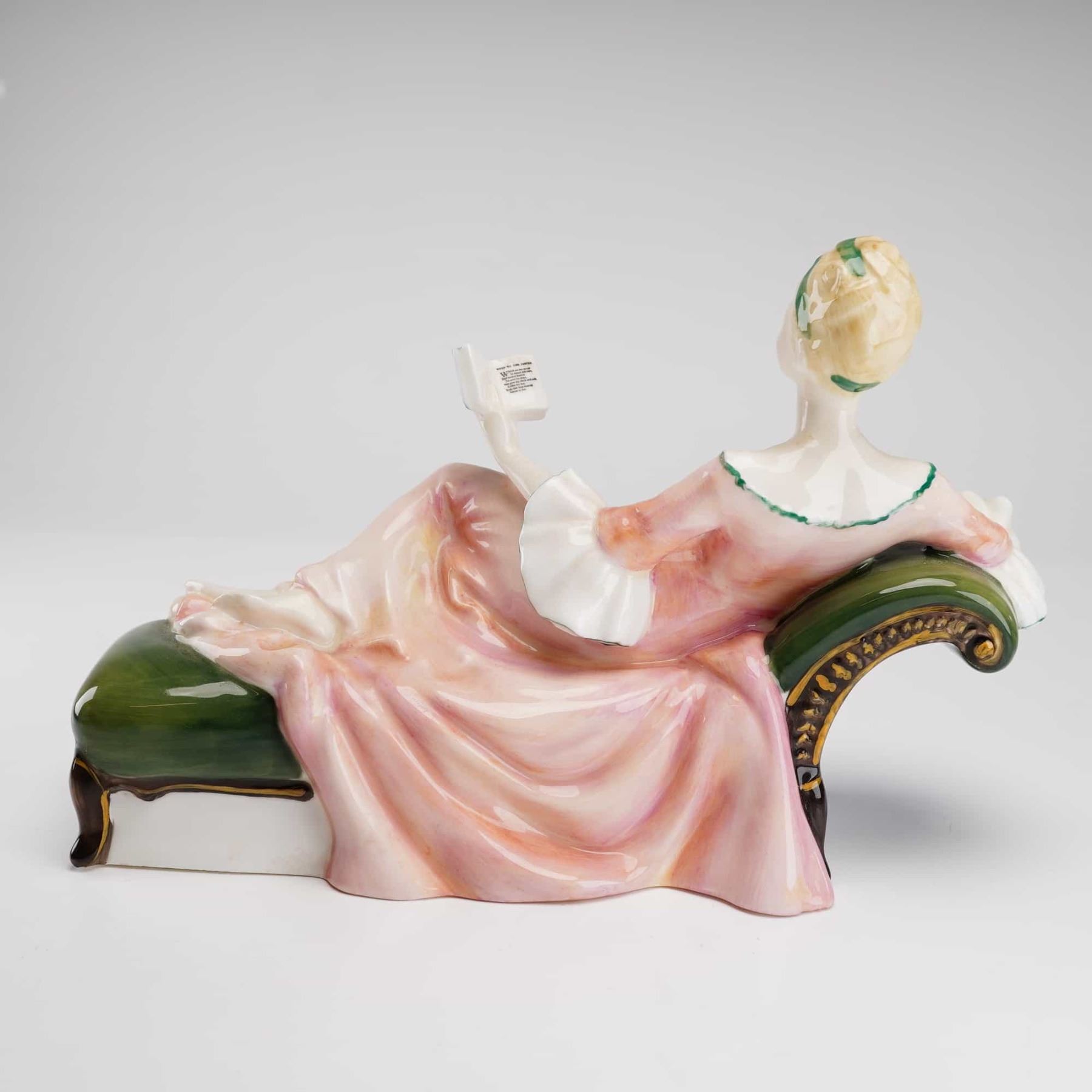 This piece depicts a young woman in an 18th-century style pink gown with green-and-white ruffled trim. She is shown reclining gracefully on a dark green, scroll-ended chaise longue featuring gilded wood detailing, while holding and reading a small blue book. The underside bears the Royal Doulton backstamp.