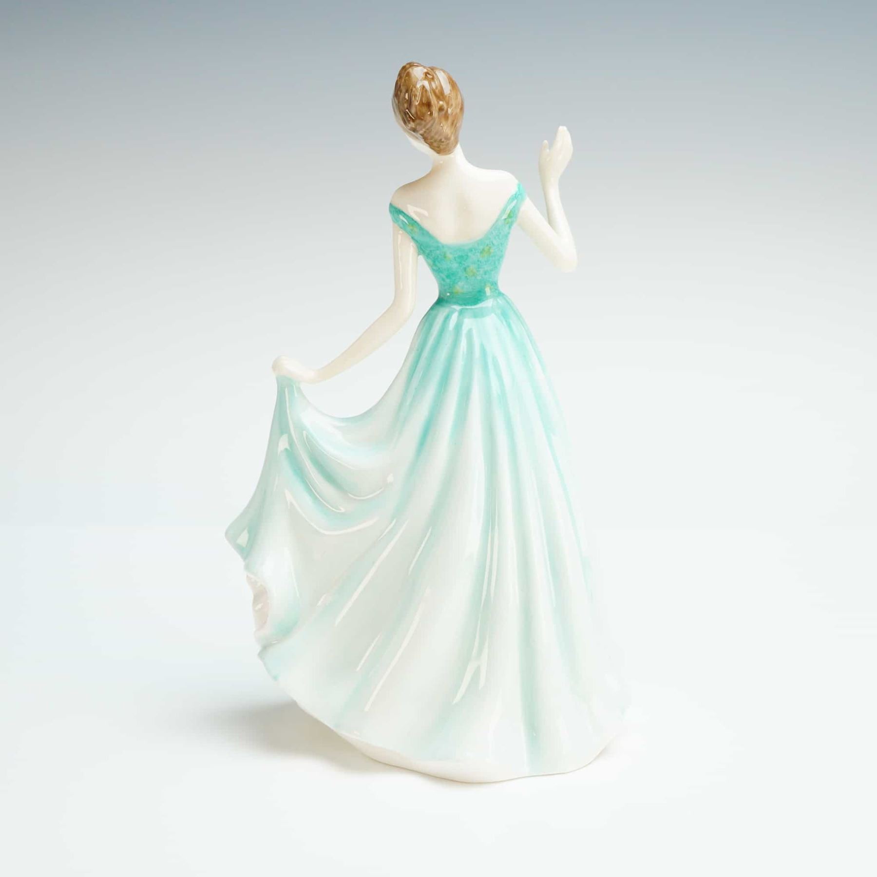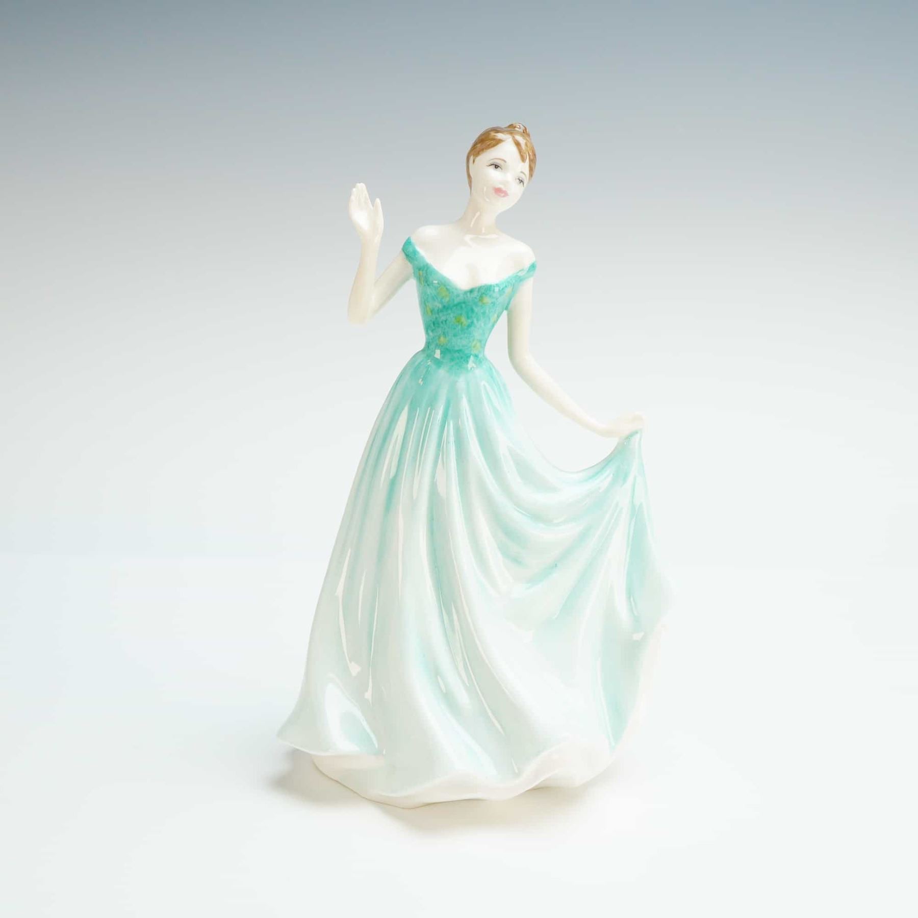 A Royal Doulton from the Classics collection. This hand-decorated figure was modeled by Nada M. Pedley and depicts a woman in a flowing, pale seafoam green gown with a darker green floral bodice. The subject is posed with one hand raised and the other lifting her skirt. The underside of the base features the official Royal Doulton backstamp, dated 2002, along with model details.
