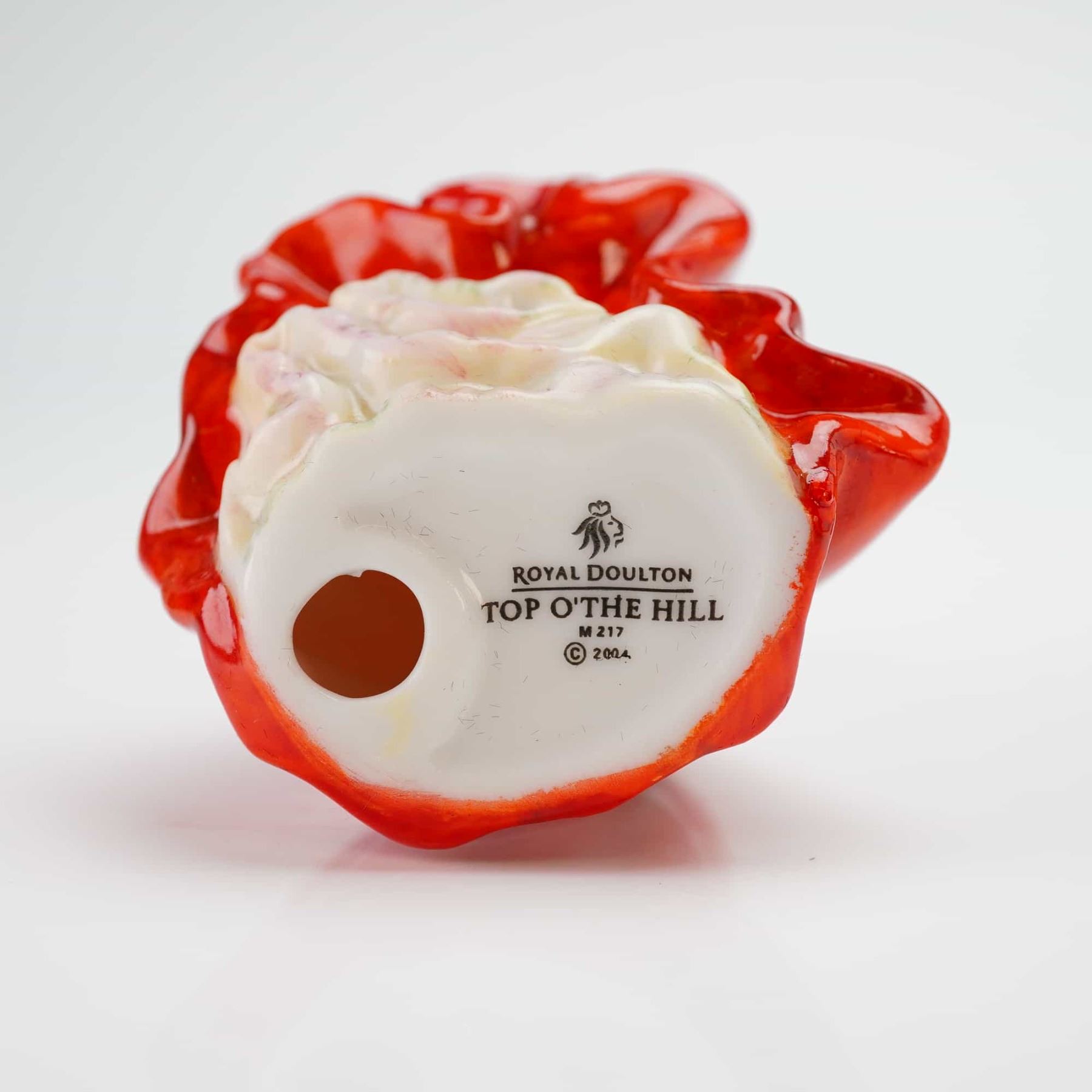 A Royal Doulton Top O The Hill M217 miniature figurine from the Miniature Ladies collection. This piece is constructed from glazed bone china and features hand-painted decoration. The figure is modeled as a woman in a wind-swept red dress and a pale pink shawl, wearing an orange hat with a blue ribbon. The underside of the base bears the Royal Doulton lion and crown maker's mark, the title, model number M 217, and a copyright date of 2004. The item is housed in its original branded presentation box.
