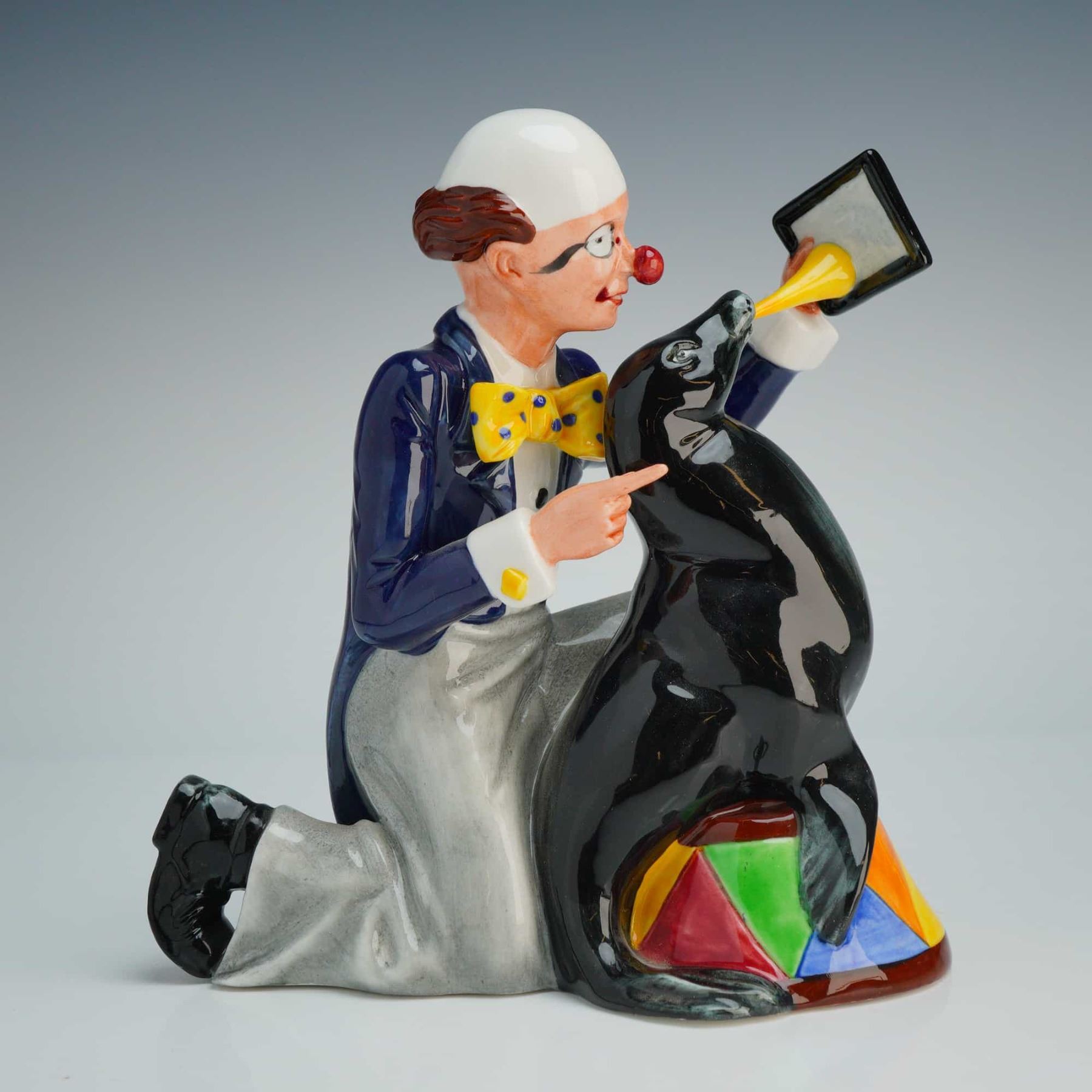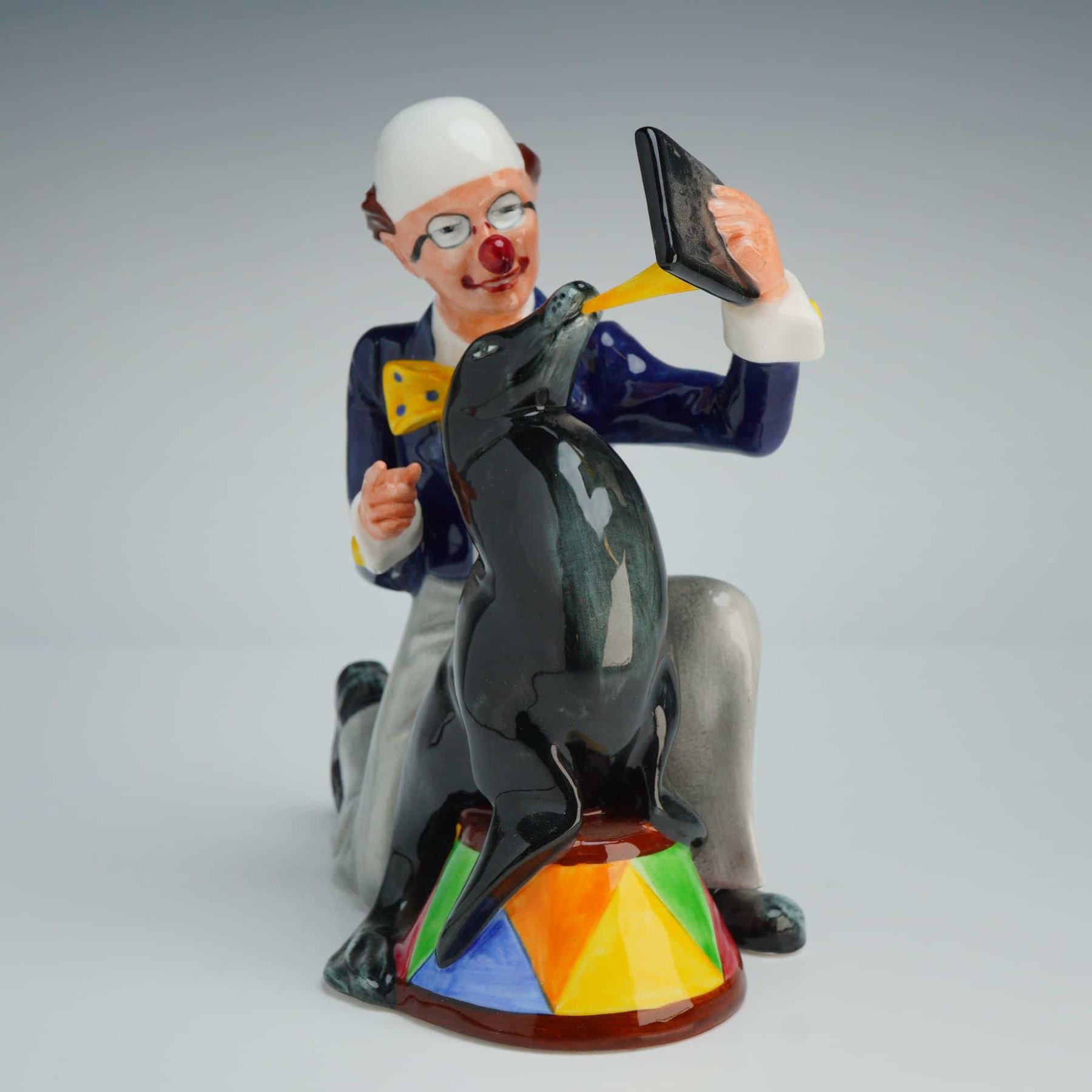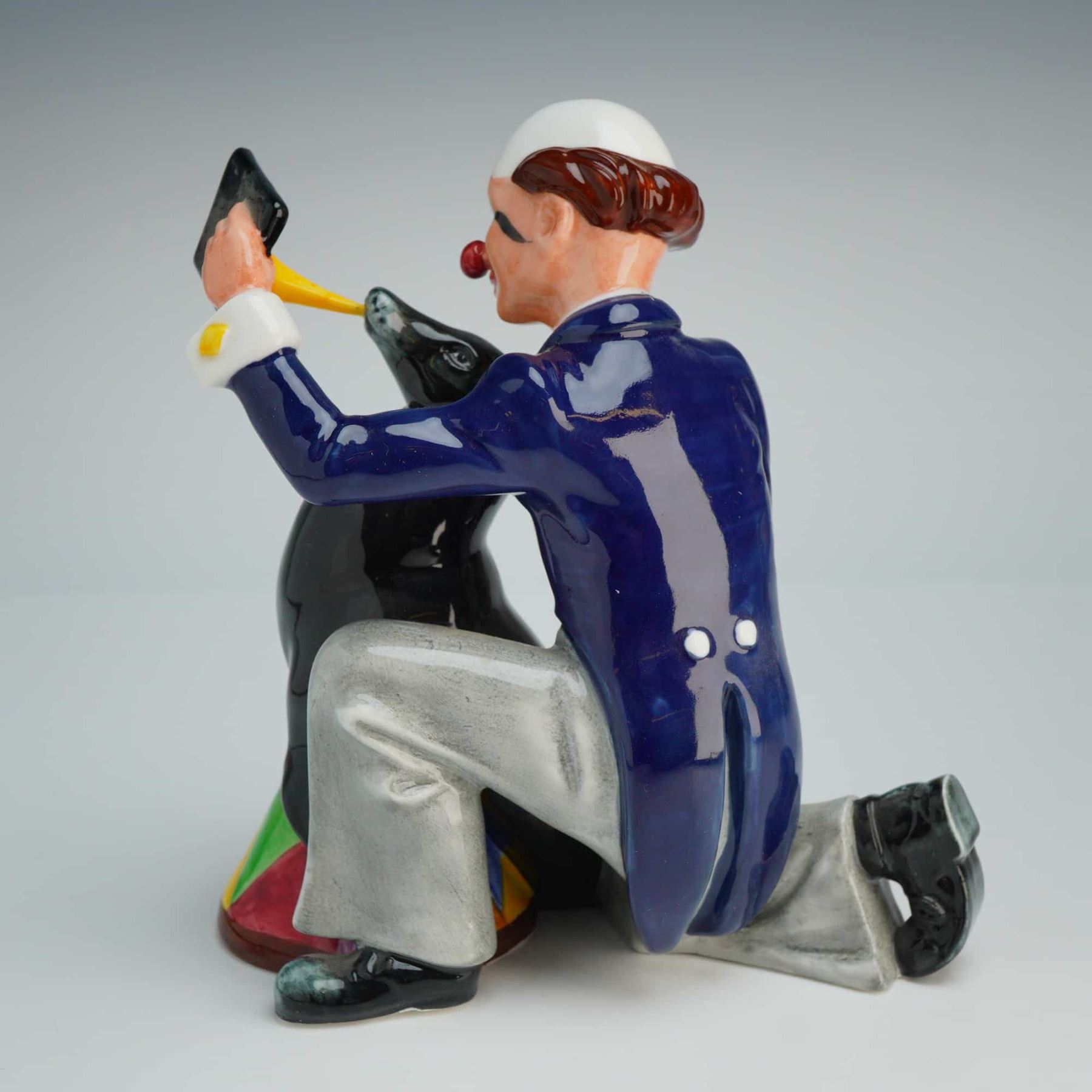 This Royal Doulton was modeled by Adrian Maslankowski and issued in 1989. The piece features a kneeling clown in a navy-blue tailcoat, gray trousers, and a yellow polka-dot bowtie, holding a small slate for a black circus seal perched on a colorful, geometric-patterned pedestal. The seal is depicted balancing a yellow horn on its nose. The figurine is hand-made and hand-decorated with a high-gloss glaze. The underside bears the green Royal Doulton factory mark, including the model name and number, the artist's name, and a 1989 copyright date.