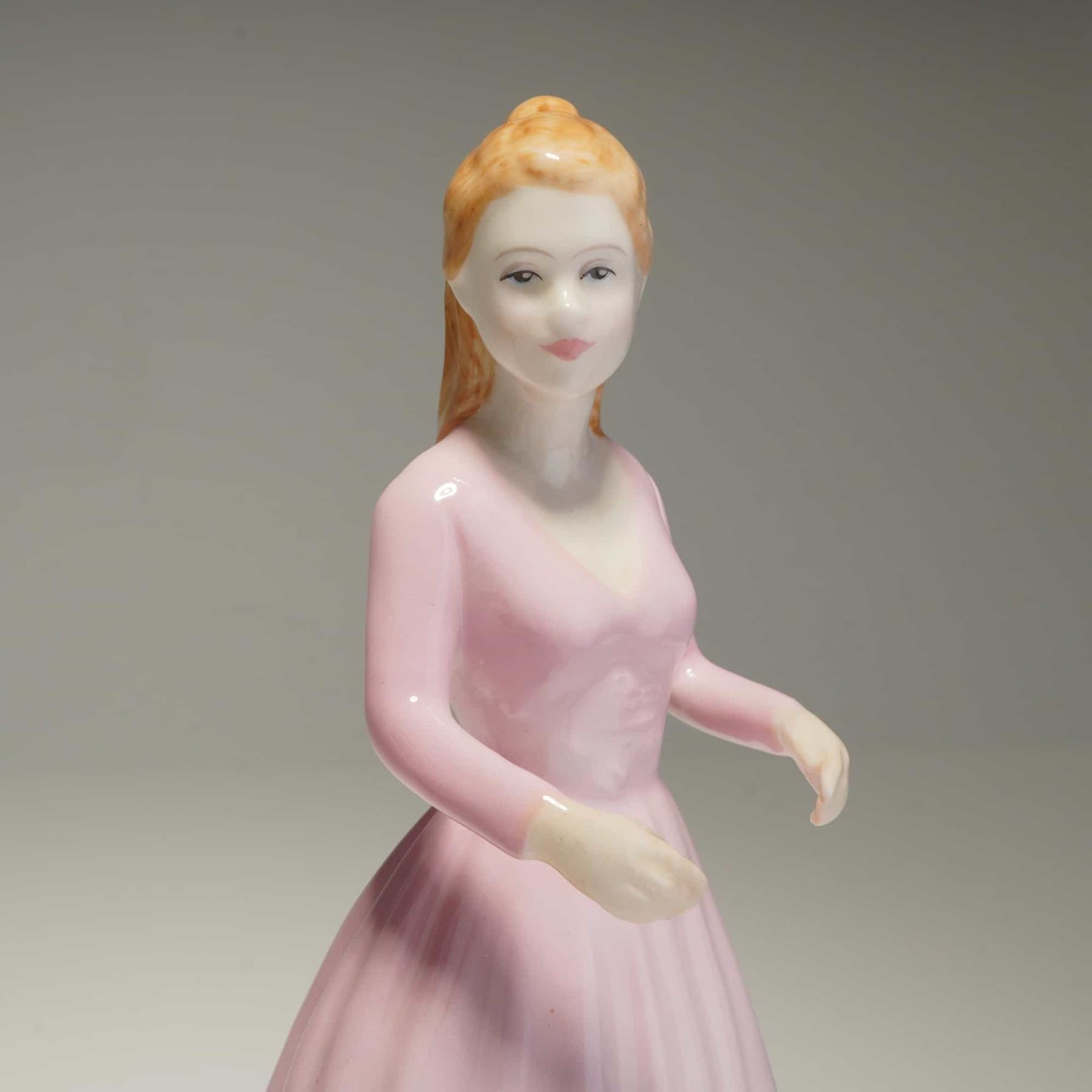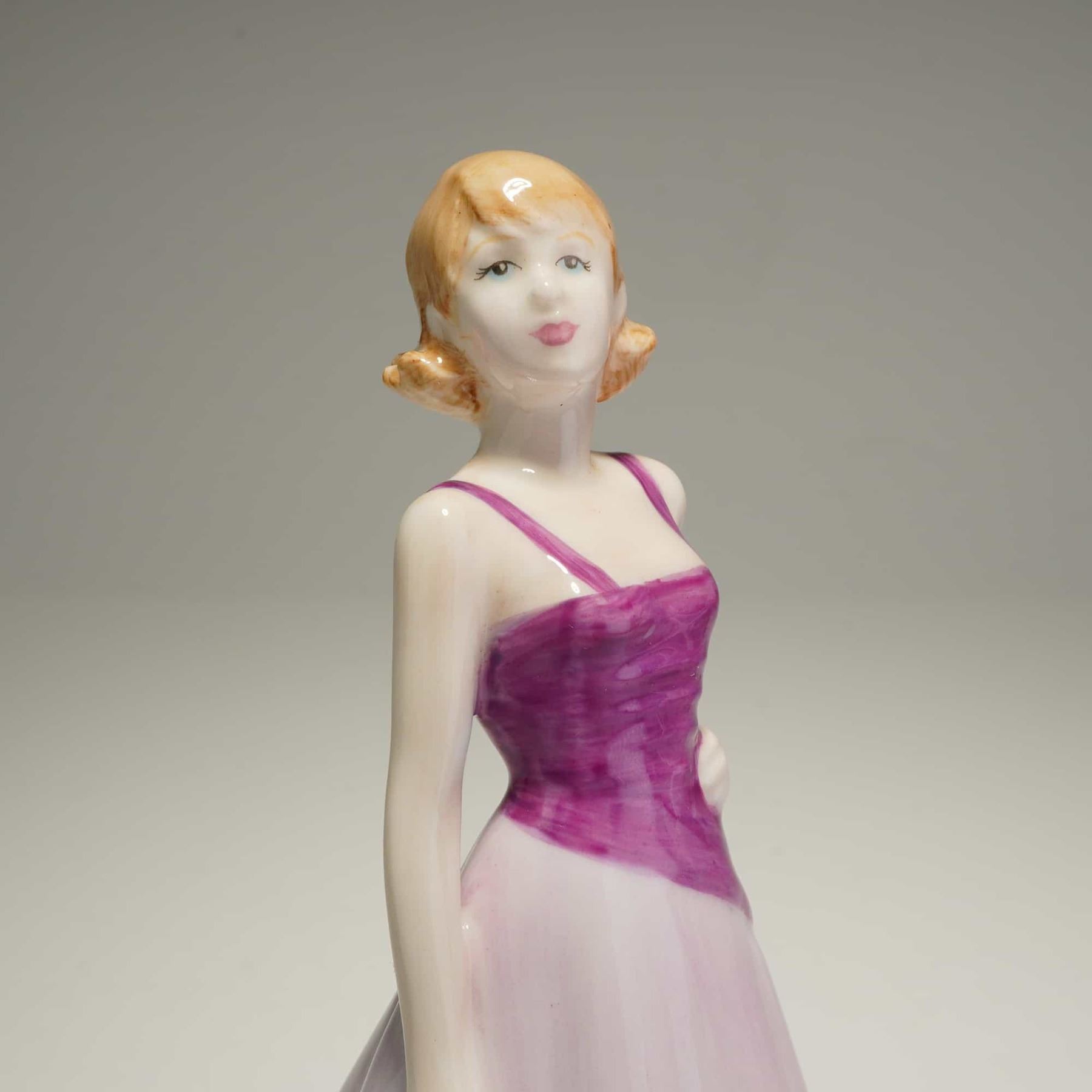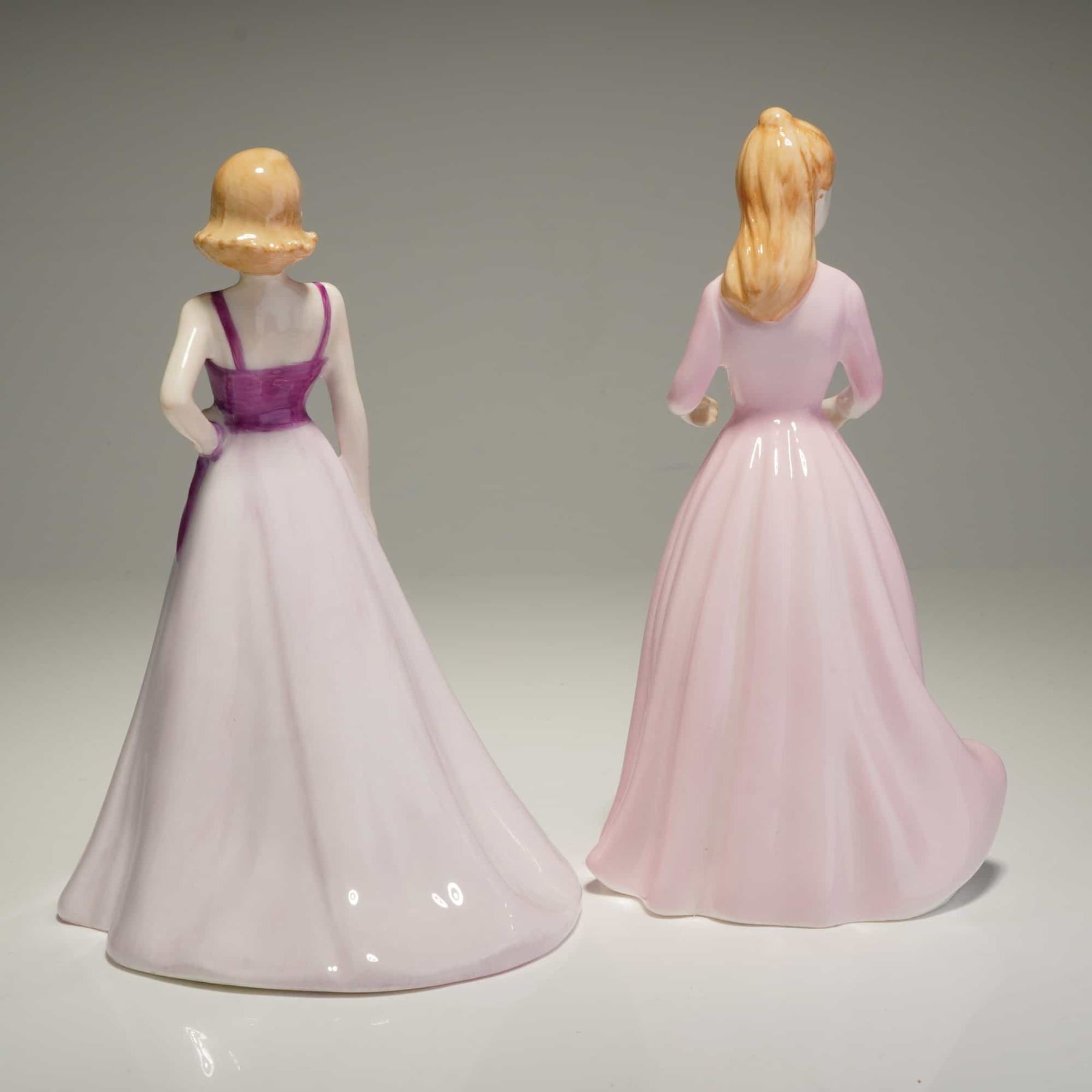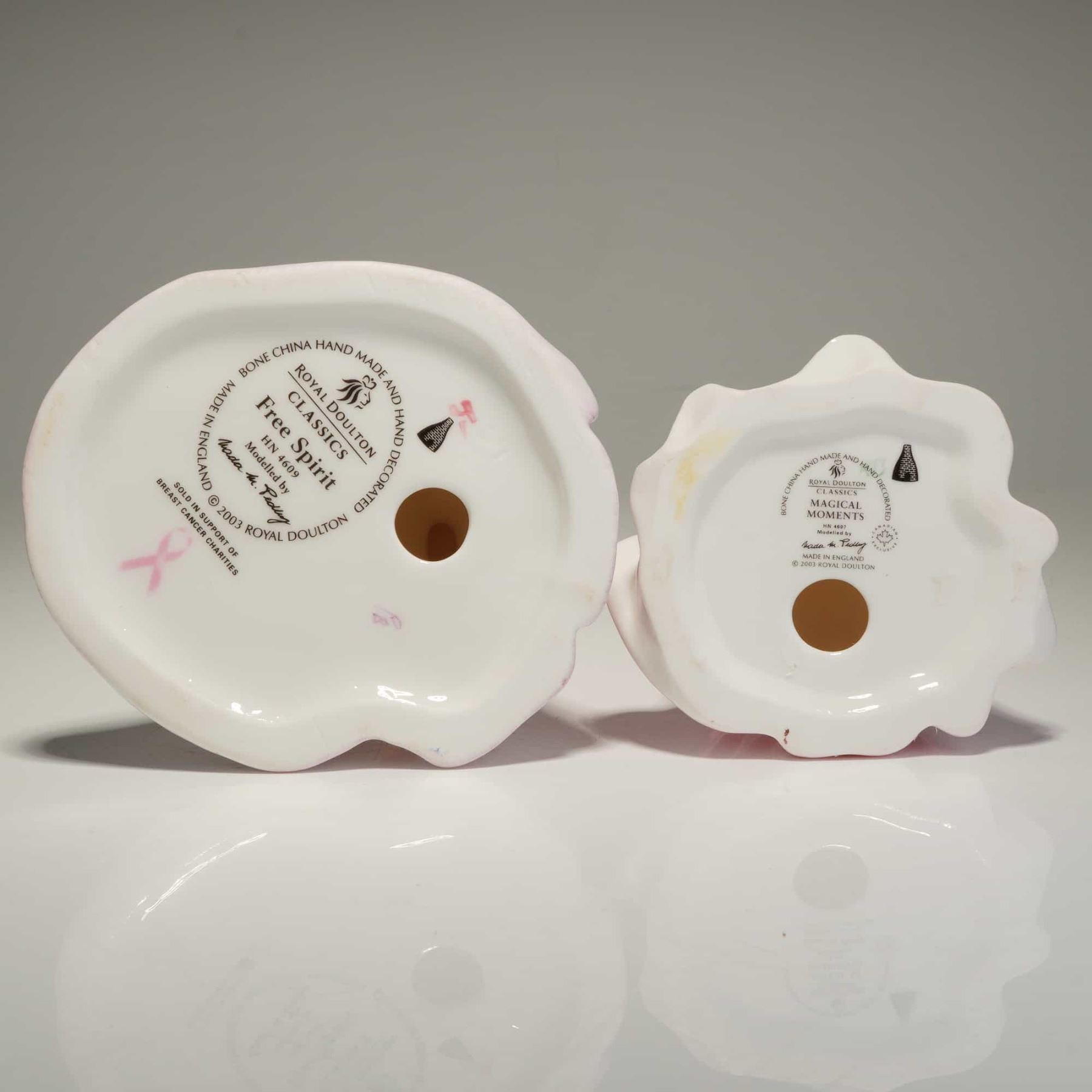 A duo of Royal Doulton Classics bone china figurines, hand-made and hand-decorated in England. The collection includes Free Spirit (HN 4609), depicting a woman in a purple and pale pink gown, and Magical Moments (HN 4607), featuring a woman in a solid light pink gown. Both pieces were modeled by artist Nada M. Pedley and are dated 2003. The base of Free Spirit includes a pink ribbon mark, noting it was sold in support of breast cancer charities. Both figurines exhibit a glossy glaze and include standard Royal Doulton backstamps on the underside. Measurement is for largest item.