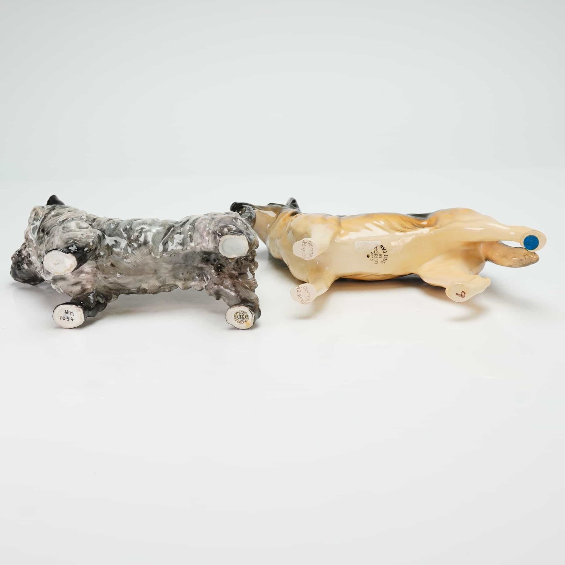 Two glazed porcelain dog figurines including a Royal Doulton Cairn Terrier and a Beswick German Shepherd. The Royal Doulton Cairn Terrier, identified as model HN1034 and often referred to as Charming Eyes, features a mottled gray, black, and white glaze. It is marked HN1034 with a Royal Doulton England backstamp on the underside of the paws. The Beswick German Shepherd is modeled in a realistic tan and black glaze and is marked CH. Ulrica of Brittas on the belly with Beswick England stamps on the paws.